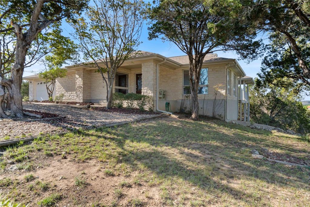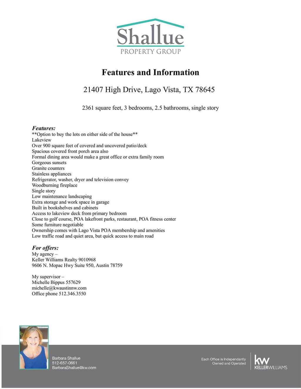 Step onto the expansive deck of 21407 High Drive and be rewarded with panoramic views of Lake Travis and the Texas Hill Country. The lots on either side of the house are not included, but are available to purchase. This charming 3-bedroom, 2.5 bath gem is flooded with natural light, while the open-concept kitchen truly is the heart of the home. It is open to a large living area where a stone fireplace with raised hearth and built-in bookshelves creates a cozy and comfortable gathering spot. The dining area is conveniently located near the kitchen and living area, with access to both the deck with lakeview and a large patio area. In the front of the house is a flex room; it could be used as a second living area, office, formal dining area, or even to expand the kitchen. The primary bedroom with en-suite bath is a peaceful retreat with built-in storage, a surprisingly huge walk-in closet, and direct access to the deck with its lake views. Two additional bedrooms share a full bath. Other highlights of this property include a welcoming covered front porch where you can enjoy the crape myrtles blooming most of the year, and a large 2-car garage with extra storage rooms and workspace, and access to a large side patio. As a Lago Vista POA member, you'll enjoy access to several lakefront private parks with boat ramps, as well as a swimming pool, fitness center, fishing well, tennis courts, pickleball courts, and more. Other nearby activities and attractions, besides the obvious lake activities, include a winery, a brewery, the Lago Vista Golf Course, disc golf, multiple restaurants, performing arts, and hiking trails in a national refuge. Cedar Park and all it has to offer is just 30 minutes away, and it is less than an hour to downtown Austin. Whether you're looking for a full-time residence, weekend escape, or investment opportunity, this home delivers peace, privacy, and postcard-worthy views. Come experience Texas Hill Country living at its finest!