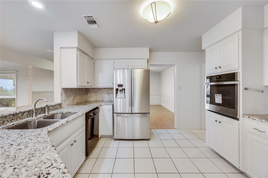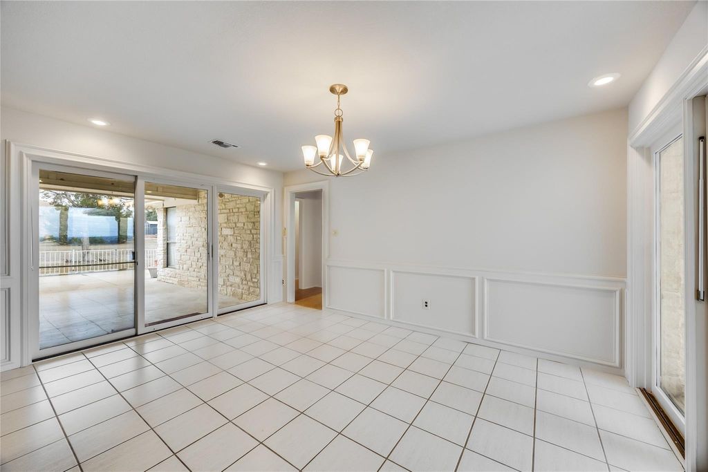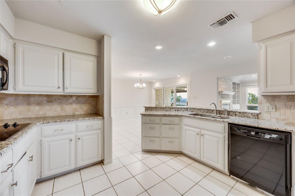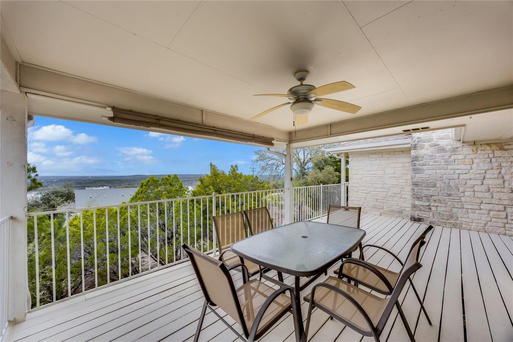 One of the only (if not THE only) truly single story homes in Lago Vista with a real lake view. From the privacy of an expansive back deck, enjoy panoramic views of Lake Travis and the Texas Hill Country. The lots on either side of the house are negotiable. This charming 3-bedroom, 2.5-bath gem is flooded with natural light. The kitchen opens to a large living area where a stone fireplace with raised hearth and built-in bookshelves creates a cozy and comfortable gathering spot. The adjacent dining area has access to both the lake-view deck and a large patio on the other side of the house. A flex room off of the foyer can be a second living area, office, formal dining room, or whatever fits your needs. The primary suite features built-in storage, a large walk-in closet, and direct access to the deck with stunning lake views. Two additional bedrooms share a full bath. Recent updates as of December 2025 include fresh interior paint and replacement of carpet, ceiling fans, and built-in oven, making this home truly move-in ready. Additional highlights include a welcoming covered front porch where you can enjoy crape myrtles blooming most of the year, and peaceful hill country views all year, and a large two-car garage with two storage rooms, a workspace, and a door to the side patio. As a Lago Vista POA member, you'll enjoy access to multiple private Lake Travis waterfront parks with parks and boat ramps, along with a community pool, fitness center, fishing well, tennis courts, pickleball courts, and more. Nearby attractions include a winery, brewery, Lago Vista Golf Course, disc golf, restaurants, performing arts, and hiking trails in a national refuge. Cedar Park is just 30 minutes away, and downtown Austin is under an hour. Whether you're looking for a full-time residence, weekend escape, or investment opportunity, this home delivers peace, privacy, and postcard-worthy Hill Country and lake views.