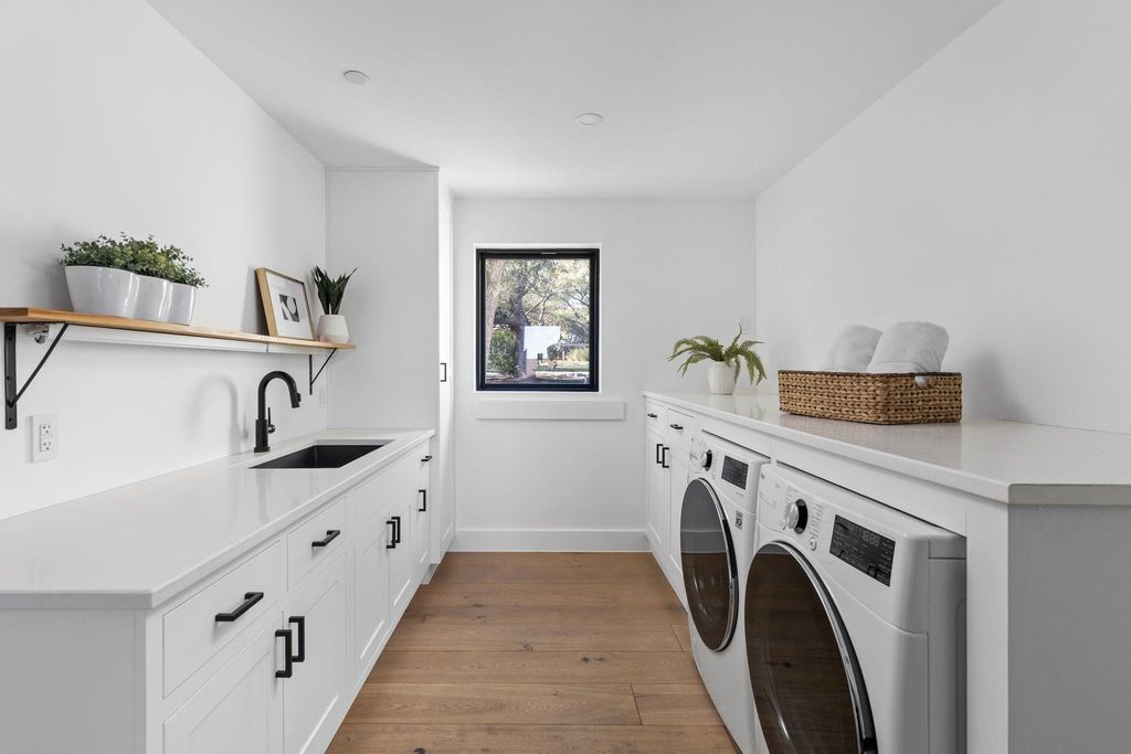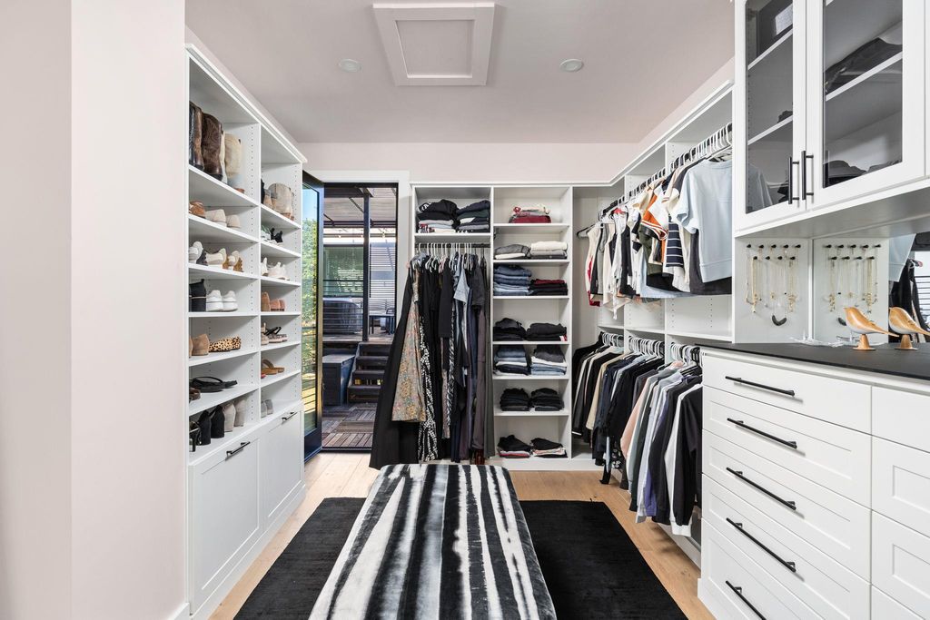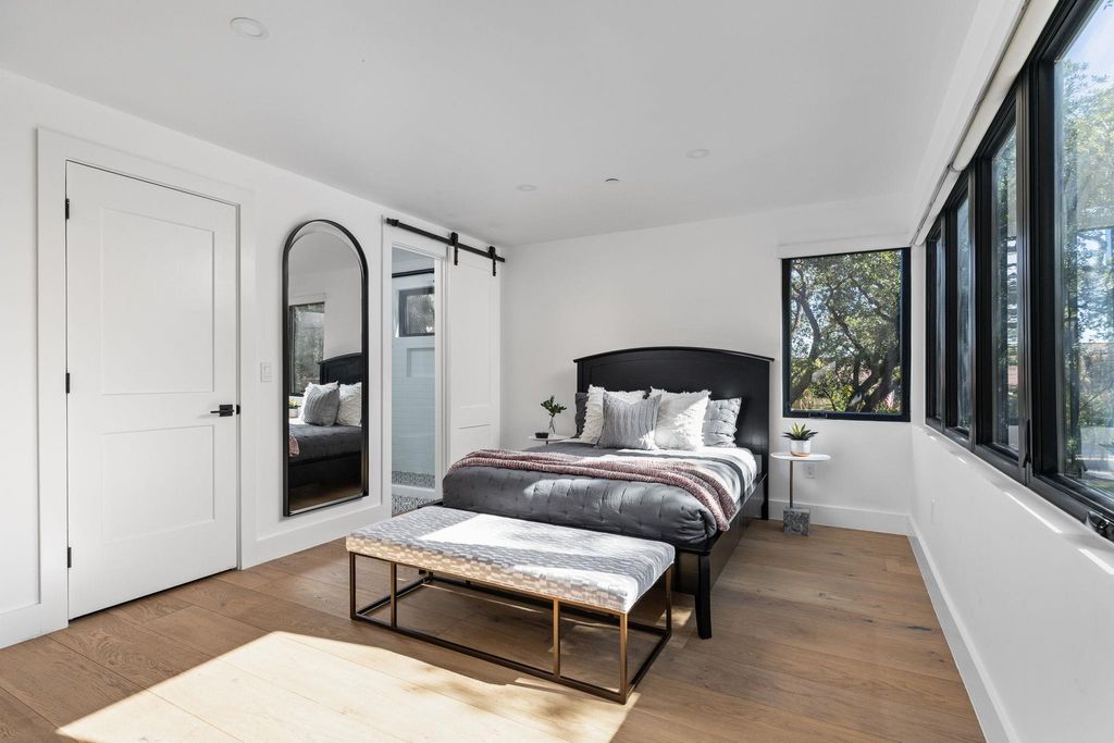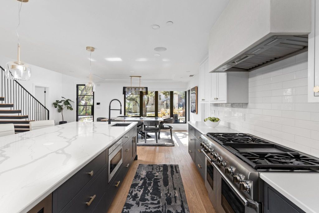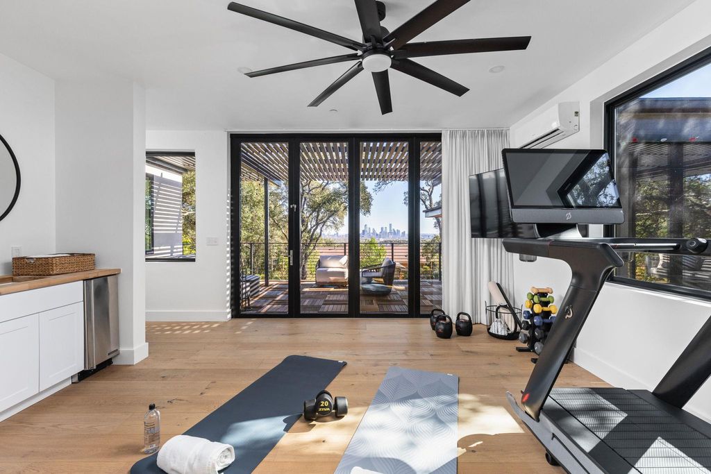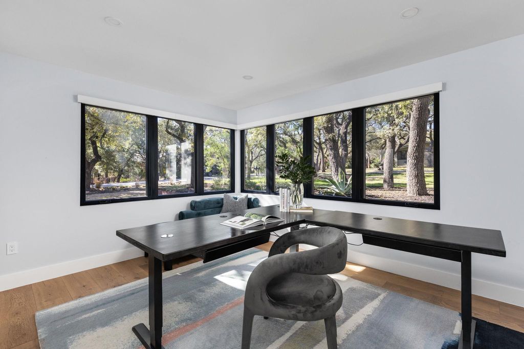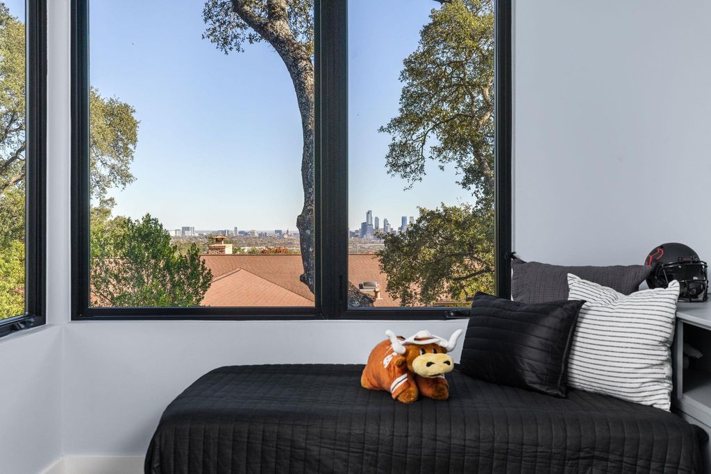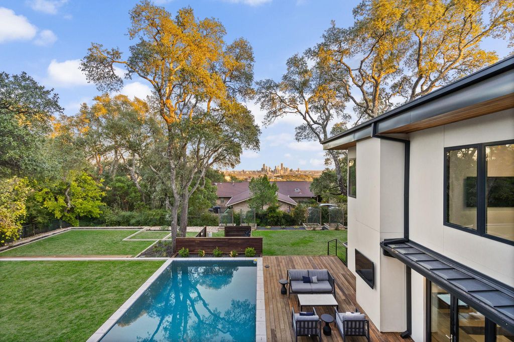 Welcome to 302 Buckeye Trail, an exceptional contemporary residence positioned on one of the most prestigious and historic streets in West Lake Hills. This thoughtfully designed home blends refined modern architecture with everyday livability, offering 5 bedrooms, 4.5 bathrooms, an office, and a versatile flex suite that can be used as office/gym/second living area with unobstructed downtown views. Natural light floods the interiors, where custom white oak flooring, panoramic windows, and bespoke finishes create a sophisticated yet inviting atmosphere. The gourmet kitchen serves as the heart of the home, featuring custom Cabico cabinetry, quartz countertops, and a professional Thermador 48-inch gas range, complemented by a 14 ft island designed for gathering. The primary suite offers a private retreat with a spa inspired bathroom featuring a soaking tub, dual vanities, and a generous walk-in closet. Secondary bedrooms function as private sanctuaries, with many boasting ensuite baths and individual Sonos audio for an elevated everyday experience. Upon entering the upstairs flex suite, you're greeted by unrivaled downtown views. This versatile space features a wet bar, media lounge, and multiple Ipe deck terraces, perfect for entertaining or serving as a private guest retreat Smart home features elevate the experience with whole home automation, Sonos audio, Nest and Ecobee systems, and MyQ access control. Additional highlights include a Rachio irrigation system, a Navien tankless water heater, and an electric vehicle charger in the conditioned garage. Outdoors, the heated saltwater pool and spa are framed by Ipe decking, manicured landscaping, and mature trees, creating a private sanctuary for relaxation or hosting. Located within the nationally acclaimed Eanes Independent School District and only minutes from downtown Austin, 302 Buckeye Trail offers a rare combination of design, location, and luxury in one of Westlake Hills' most sought-after settings.