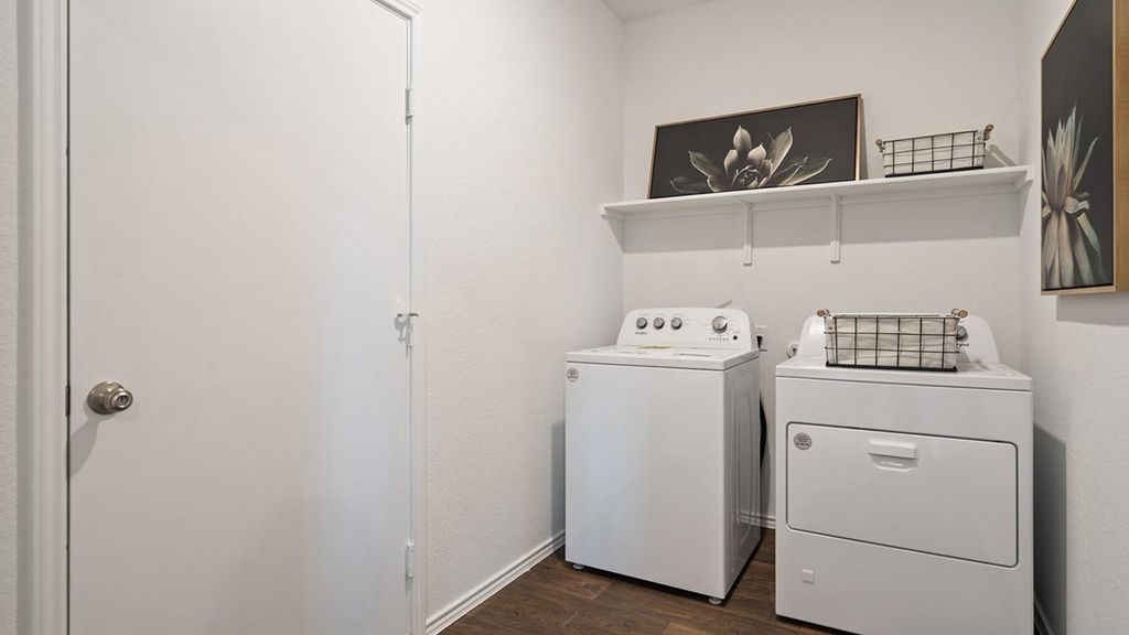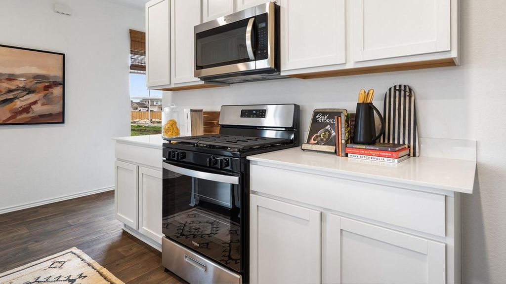 UNDER CONSTRUCTION - EST COMPLETION IN APRIL Photos are representative of plan and may vary as built. Introducing the thoughtfully designed Hanna floorplan at Durango in Mustang Ridge, TX. This two-story floorplan offers 2,023 square feet, 4-bedrooms, 2.5 bathrooms and an upstairs game room. As you enter through the front door you're welcomed with a long foyer with a powder bath off to the side. Making your way down the hall, you'll find an open-concept kitchen and living area. The kitchen includes a large island with a built in undermount sink and dishwasher. Enjoy a gourmet kitchen with stainless steel appliances, walk-in pantry and quartz countertops. The spacious main bedroom is also found on the first floor and connects to a bathroom that makes getting ready in the morning a dream. Featuring a double vanity sink, a walk-in shower, separate toilet room, and a walk-in closet with lots of storage space. Upstairs, you will find a huge gameroom with a large window that illuminates the space. Three more bedrooms and a full bathroom with a bathtub is also found on the second story. This home comes included with a professionally designed landscape package and an irrigation system as well as our America's Smart Home® package that offers devices such as the Qolsys IQ Panel, Video Doorbell, Alarm.com app, Honeywell Thermostat, Deako Smart Light Switch, Kwikset Smart lock, and more.