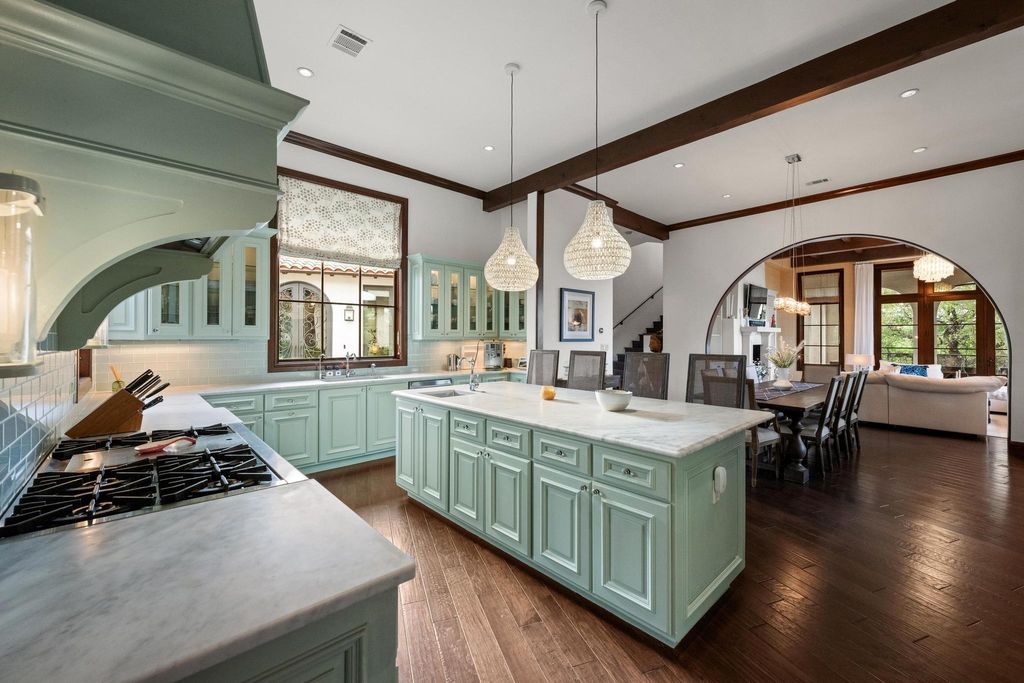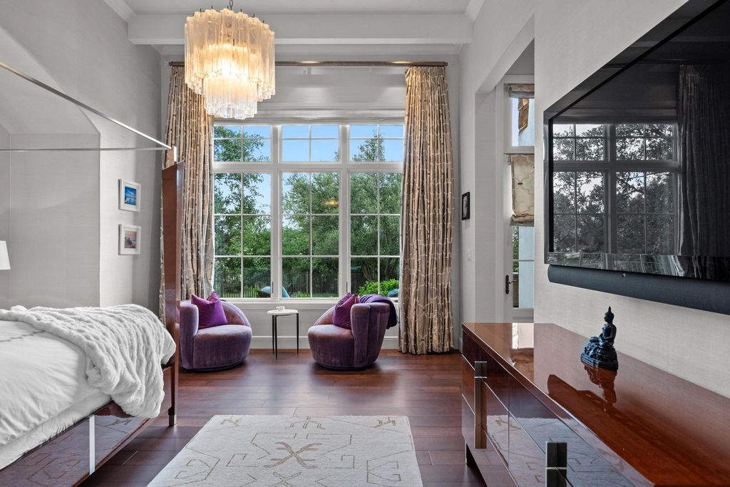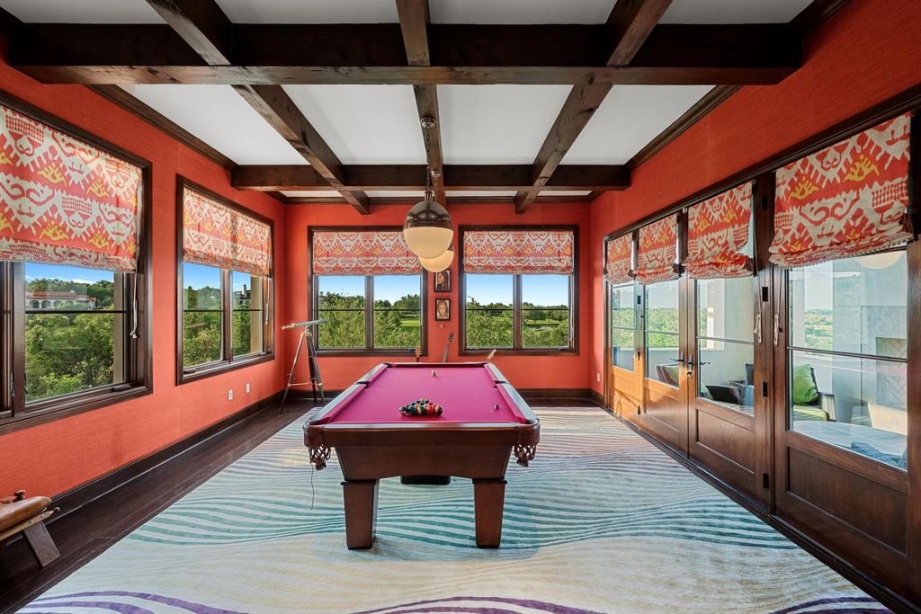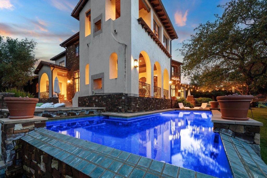 Perched gracefully on the 4th hole of the prestigious Spanish Oaks golf course, the Little Blue Stem Estate embodies luxury and sophistication. A charming courtyard entry, adorned with a blooming rose garden and meticulously curated landscaping, welcomes you. Towering floor-to-ceiling windows and seamlessly interconnected living spaces elevate the home's grandeur and warmth. The first-floor primary suite is a haven, boasting separate vanities, an expansive custom-designed closet, a lavish soaking tub, a spacious walk-in shower, and huge windows offering captivating views of the infinity-edge pool and covered veranda. A gracious guest suite on the main level features a refined coffee bar and an exquisite en-suite bath with a sleek standing shower. The grand Ann Saks tiled kitchen, a culinary masterpiece, flows effortlessly into an elegant den with airy, vaulted ceilings and sweeping vistas of the enchanting Texas Hill Country. Steps away, an outdoor kitchen and covered dining area provide stunning views for miles, perfect for entertaining. The second level unveils three sumptuous bedrooms, each with en-suite baths, and an oversized game room with a billiard table, offering panoramic views and a private patio with a roaring fireplace for cozy evenings. Outdoor sanctuaries include a resplendent infinity-edge pool and fireplace on the veranda, ideal for lavish gatherings or serene retreats. The estate also features a sprawling 3-car garage, a meticulously appointed mud room, and a laundry suite. Moments from shopping, restaurants, Austin Tennis Academy, outdoor activities, and the esteemed Lake Travis School District, this palatial abode stands as a testament to timeless elegance and modern luxury.
