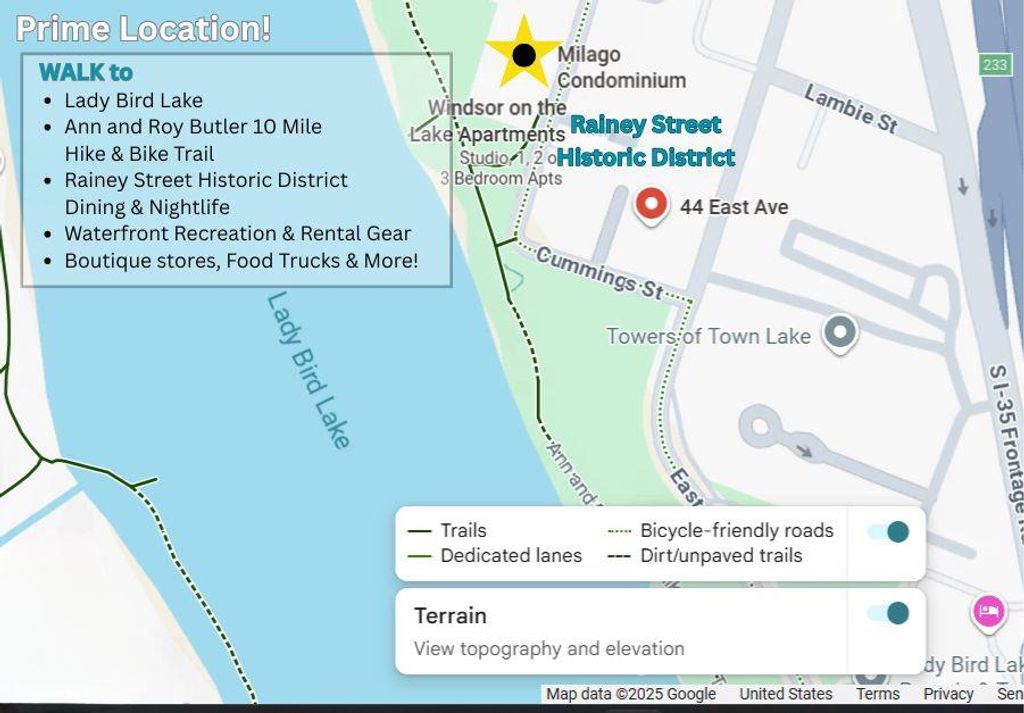 LOCATION LOCATION LOCATION...One of the best values in LUXURY high rise living in Downtown Austin. You'll love this spacious 1-bedroom condo with an open and light floor plan featuring expansive energy efficient windows, high ceilings, and a private balcony overlooking vibrant Rainey Street. Stackable washer/dryer and a large walk-in closet are a plus. Living at Milago there are many standout amenities such as a rooftop pool and hot tub with extraordinary views, bbq and lounge, fitness room, clubroom, wi-fi lounge and 24 hour concierge for that unbeatable first class experience. Enjoy direct access to the Shores of Lady Bird Lake and the Hike-and-Bike Trail. Built in 2005 this high rise stands 13 stories tall and houses 240 residential units. HOA covers common area maintenance, insurance, trash services and 24 hr concierge. Don't miss an opportunity to live downtown enjoy countless eateries, shops and entertainment venues at an incredible value!!!