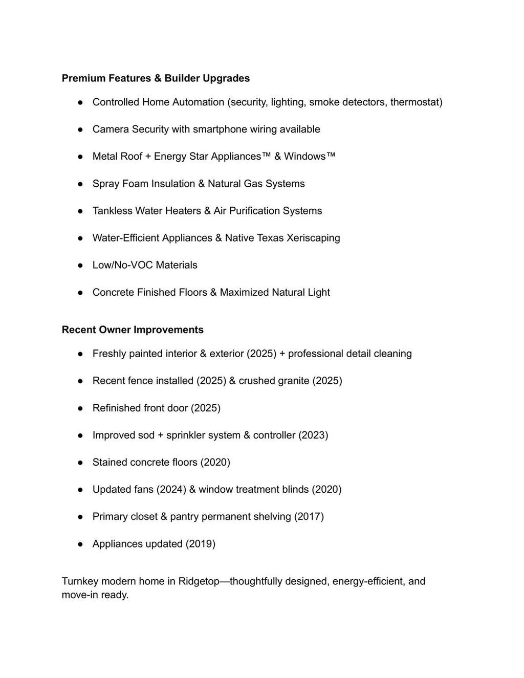 Modern Ridgetop Custom Home - No HOA | 4 Bed | 3 Bath | Large Backyard Stunning custom home by Verde Builders Group in Ridgetop, featuring high ceilings, abundant natural light, and a metal roof. The main floor includes the primary suite, second bedroom, 2 full bathrooms and laundry, with two additional bedrooms and full bathroom upstairs. Concrete floor downstairs & wood floors upstairs. A large backyard with storage addition offers space for entertaining or outdoor living. Builder & Owner Upgrades: Controlled Home Automation (security, lighting, smoke detectors, thermostat), wiring for Camera Security with smartphone access available, Energy Star Appliances & Windows, Spray Foam Insulation & Natural Gas Systems, Tankless Water Heaters & Air Purification Systems, Water-Efficient Appliances & Native Texas Xeriscaping, Low/No VOC materials, Concrete Finished Floors, and optimized natural light. Owner updates include fresh interior/exterior paint (2025), new fence, improved sod & sprinkler system, stained concrete floors, updated fans, refinished front door.Walkable to cafés, restaurants, Mueller Park, farmers market, and Dell Children's Medical. Easy access to the airport, I-35, Lamar, 183, and MoPac. Turnkey modern luxury in a prime location.