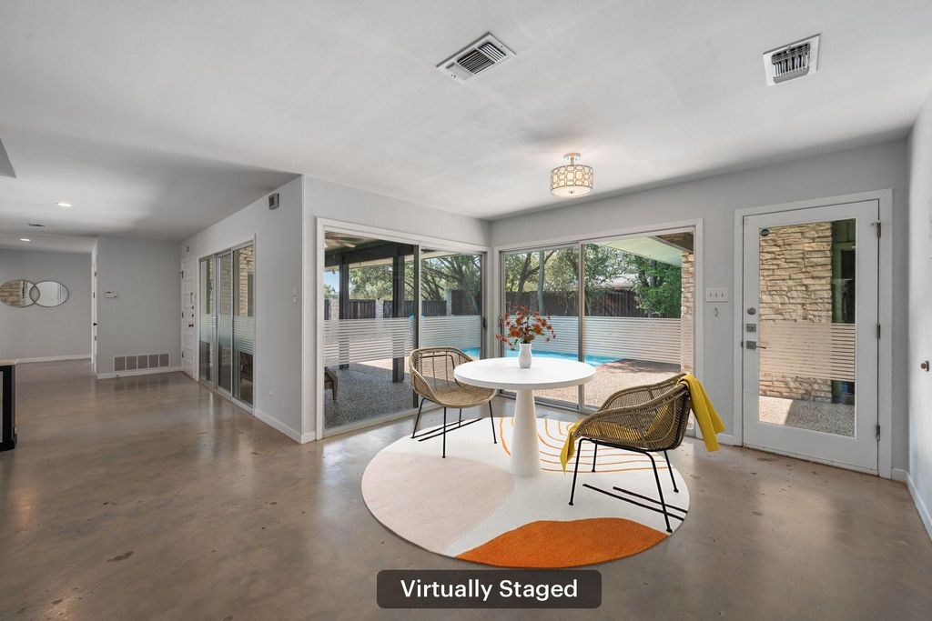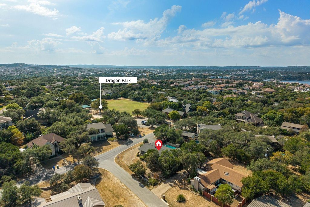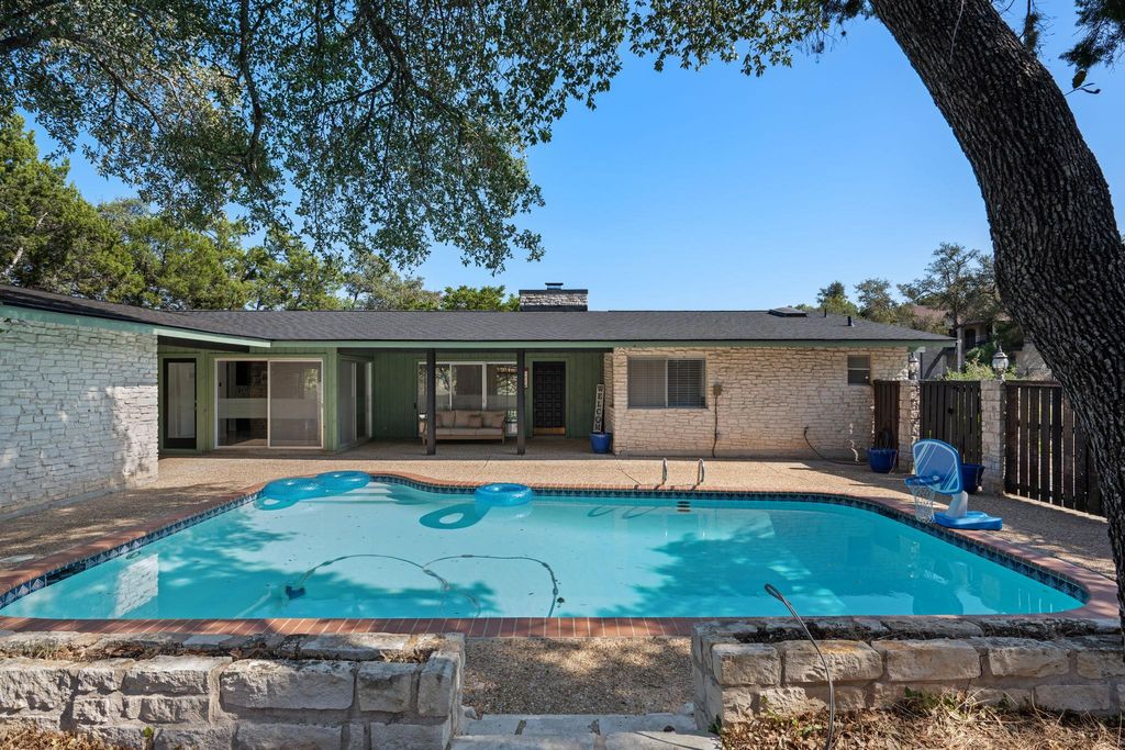 Welcome to 701 Dragon, where mid-century modern elegance meets resort-style living in the heart of Lakeway. This gorgeously remodeled single-story home perfectly blends timeless design with modern luxury. Featuring four bedrooms and two baths, the residence has been thoughtfully reimagined with designer finishes and stylish details throughout. Step inside to find spacious, light-filled living and dining areas that create a warm, inviting atmosphere"”ideal for entertaining or relaxing in comfort. The wide galley kitchen serves as the true centerpiece of the home, showcasing gleaming quartz countertops, a chic tile backsplash, and abundant cabinetry that makes cooking and hosting effortless. The main living area features a sophisticated sunken living room anchored by a stunning native stone fireplace, perfect for cozy evenings or casual gatherings. There are multiple patios, offering a seamless indoor-outdoor connection and tranquil spaces to enjoy morning coffee or evening breezes. Outside, a personal paradise awaits with a sparkling in-ground pool surrounded by a serene courtyard and privacy fencing, creating a resort-like escape for relaxation and fun under the Texas sky. Situated on a spacious corner lot directly across from Dragon Park, the home offers unbeatable proximity to Lakeway Marina and Rough Hollow Yacht Club for boating and dining, as well as Lakeway City Park and Lake Travis for outdoor recreation. Residents also enjoy easy access to golf courses, the air park, community parks, schools, shopping, and scenic hiking trails. Recent updates include a brand-new roof (2025), both HVAC systems and a pool pump replaced in 2024. With no HOA, you have the freedom to make this property truly your own. Combining mid-century charm, modern comfort, and a prime location, 701 Dragon offers the perfect balance of sophistication, leisure, and resort-style living in one of Lakeway's most desirable neighborhoods.