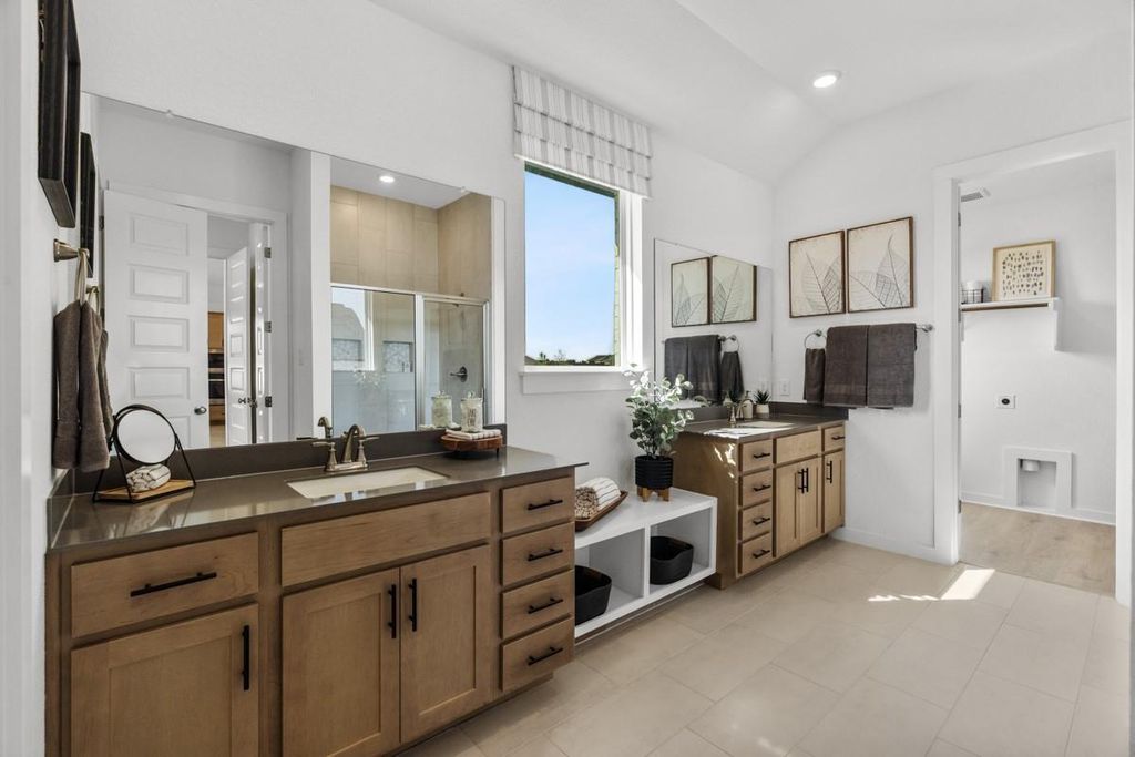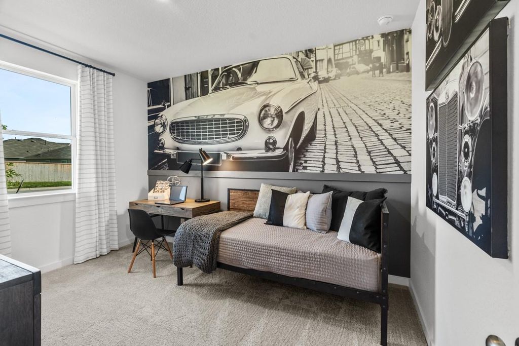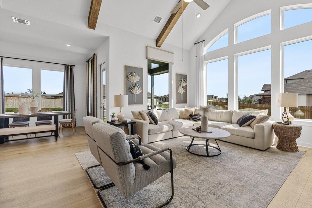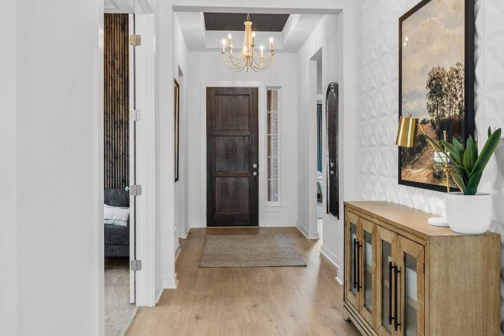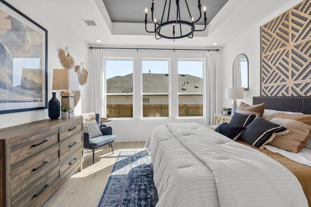 Chesmar Model Home For Sale | 1 Story | 3 Beds | 2.5 Baths | Flex Room | 3-Car Garage | 2,358 Sq Ft | Covered Outdoor Living | The McKenna model home brings designer style and thoughtful functionality together in one impressive single-story layout. The entrance foyer leads to a front bedroom with charming bay windows and a walk-in closet, plus a second bedroom with its own walk-in closet. Both bedrooms share a full bath and each has its own linen closet right outside the door for easy storage. Across the hall, a flex room with French doors offers the perfect space for a home office, playroom, or hobby room. The open-concept living area is bright and inviting, featuring a large eye-shaped kitchen island overlooking the dining area and family room. The kitchen includes quartz countertops, abundant cabinet and counter space, a refrigerator included, a walk-in pantry, built-in appliances, and a stylish niche with cabinets and shelving across from the island. The family room impresses with vaulted ceilings accented with pine beams, a 60" electric fireplace, and huge windows overlooking the backyard. The primary bedroom, located at the back of the home, features a tray ceiling and double doors leading to the ensuite bath with dual vanities separated by a window seat, a walk-in shower, and a spacious walk-in closet. The primary bath also connects directly to the laundry room for added convenience. A half bath near the utility room serves the main living areas, and the home includes a 3-car garage and covered outdoor living. Stop by the Carillon model for a tour and ask about current buyer incentives. Ready to close in February 2026. Furniture not included in this sale.