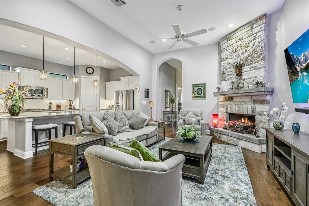 Nestled within the prestigious gated golf course community of Flintrock Falls, this one story Prominence Homes residence offers refined Lakeway living. Perfectly positioned on a cul-de-sac near the rear private gate, this impeccably maintained home pairs timeless Tuscan architecture with functionality & elevated design. Step through the gated covered entry into an inviting open plan highlighted by floor-to-ceiling stone fireplace, custom paint finishes, hardwood floors, & recessed lighting that set the stage for entertaining. Gourmet kitchen features granite countertops, center island w/breakfast bar, stainless steel appliances- double ovens & gas cooktop, white cabinetry, & windows above cabinets for an added touch of natural light. The private primary retreat is tucked away at the back of the home with tray ceilings, plantation shutters, crown molding, & spa-inspired bath w/dual granite vanities, soaking tub, walk-in shower, & generous closet. 2 secondary bedrooms share a bath with dual sinks, while the half bath includes decorative tile detailing. Additional highlights- epoxy flooring, built-ins, & sink in garage, plus a laundry room w/storage. Outdoors, relax on the covered patio w/tongue & groove ceiling overlooking a manicured, wrought iron fenced yard recently upgraded with fast growing shrubs for privacy & room for a pool- an ideal, private garden setting to relax or entertain. Enjoy resort-style amenities including clubhouse w/dining, pro shop, 4 golf courses (2 Jack Nicklaus), Elevation Athletic Club w/tennis/pickleball, gym, & pools (pool access included in dues, fitness, tennis, golf additional membership required). Minutes from Lake Travis & zoned to award-winning Lake Travis ISD. * Buyer to independently verify all info including but not limited to sqft, restrictions, hoa dues, lot size, yr built, taxes, schools. TCAD Sqft- 2,021. Mandatory social dues $154.80/mo + $985 semi annual dues. Excluded-Chandeliers at dining, entry, porch & tv brackets