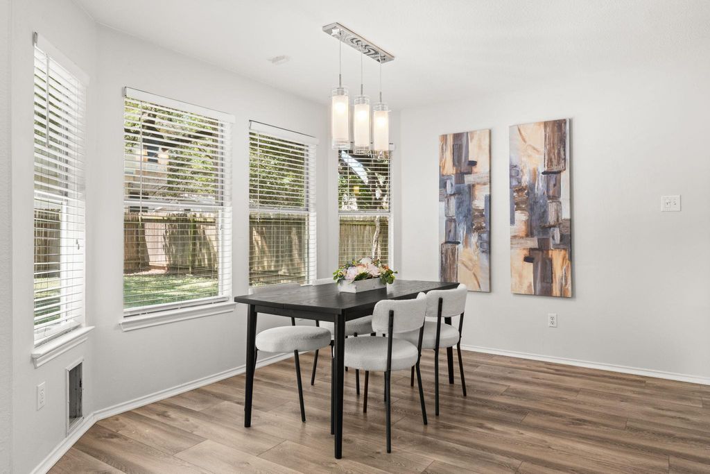 Set on a spacious corner lot, this beautiful 2-story home offers 3 bedrooms, 2.5 bathrooms, and 1,988 sq. ft. of intentionally built living space. Its curb appeal shines with updated exterior paint, and a welcoming front porch framed by mature shade trees. The interior is warm and inviting, with an open main level lined with windows and luxury vinyl plank flooring that flows throughout, creating a clean, modern feel. The bright living room, anchored by a cozy fireplace, seamlessly connects to the rest of the space, making daily life and entertaining effortless. The kitchen features white cabinetry, black granite counters, a stylish glass tile backsplash, stainless steel appliances, and a breakfast bar for casual seating. The adjacent dining area is conveniently open to both the kitchen and the living room, with large windows and peaceful backyard views. A central 1/2 bath downstairs lies just off the main living space for convenience. Upstairs, the oversized primary suite is a private retreat filled with natural light, a ceiling fan, and a stunning new ensuite bath that's just been fully renovated, featuring a dual vanity, striking tile work, a frameless walk-in shower, and matte black fixtures. Additionally upstairs are two spacious guest bedrooms, each with large closets, ceiling fans, ample natural light, and plenty of room for relaxation. They share a thoughtfully placed full bathroom with intentional use of space for sharing. A versatile upstairs living space provides room for a second family area, playroom, or home office, and includes built-in bookshelves for style and storage. The private, sprawling backyard is a standout, with a stamped concrete patio, string lights for evening ambiance, a storage shed, and mature shade trees that create a relaxing retreat to unwind. Additional updates include a full HVAC replacement, a new Bosch dishwasher, and multiple storage upgrades, from built-ins upstairs to garage shelving.