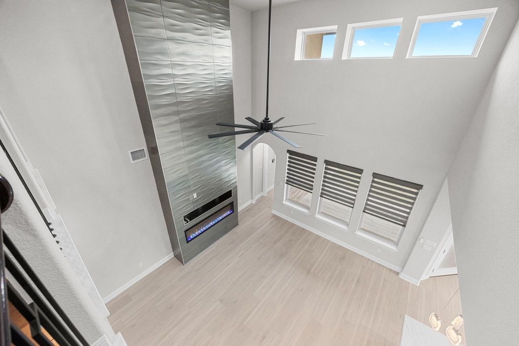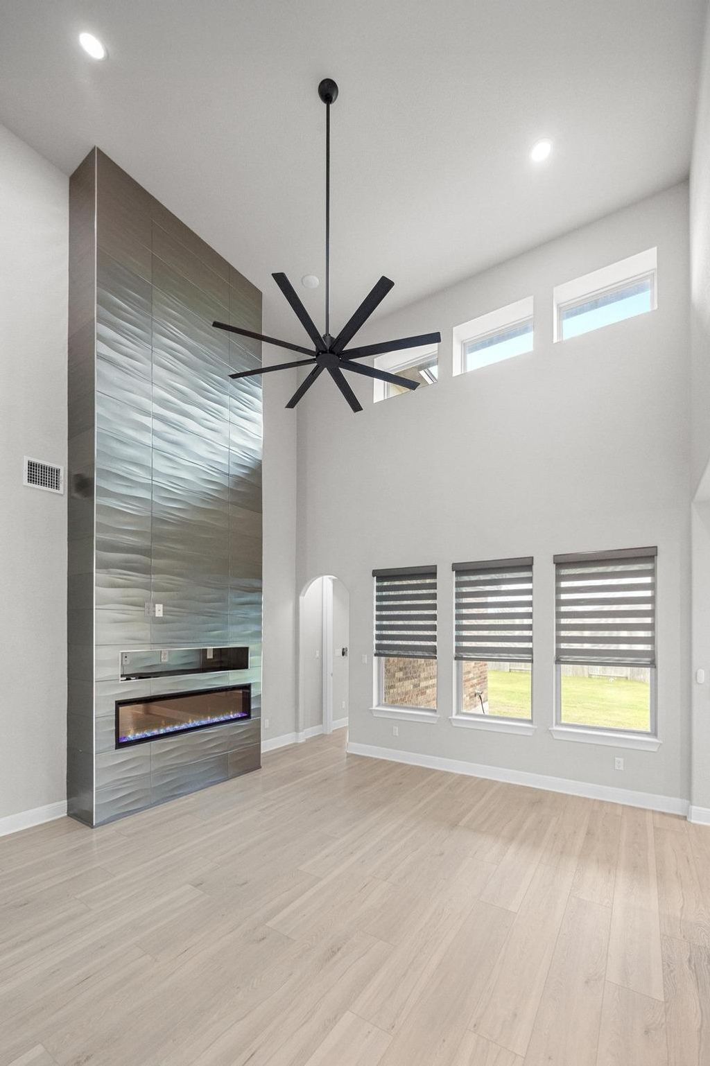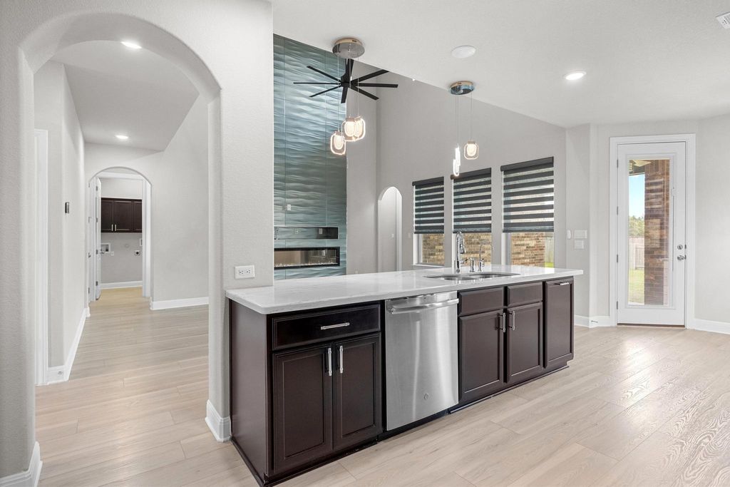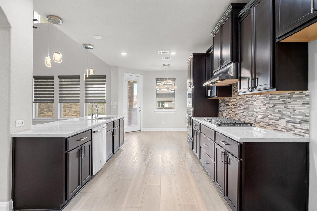 Beautifully maintained two-story Taylor Morrison Benito floor plan in the sought after Crystal Falls neighborhood! Brand new roof was installed this year. The main level showcases luxury vinyl plank flooring, a contemporary fireplace with tile extending to the ceiling serves as a stunning focal point in the living area, adding both warmth and modern style. Primary bedroom is on the main level along with laundry room, and half bathroom for guests. The gourmet kitchen includes a new vent hood while modern wrought iron railings and freshly painted interiors add to the home's stylish appeal. Upstairs, you'll find three additional bedrooms and two full bathrooms"”each upgraded with rain glass shower doors. All upstairs bedrooms and the staircase feature elegant wood flooring. A dedicated media room with built-in surround sound speakers provides the perfect space for movie nights. Additional upgrades include motorized and manual shades, a whole-house water softener system, custom garage shelving with epoxy-coated floors, and sleek, modern chandeliers throughout. Enjoy the outdoors with a fully equipped outdoor kitchen featuring a gas grill (never used), electric oven, and sink"”ideal for hosting gatherings. This move-in ready home combines comfort, style, and functionality"”ready for its next owner to enjoy.
