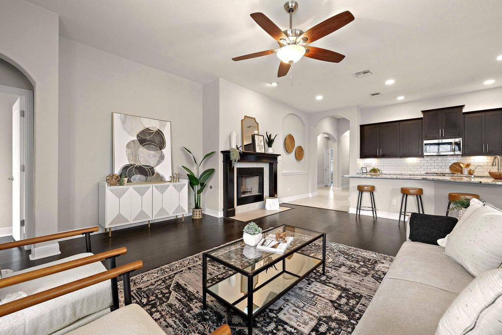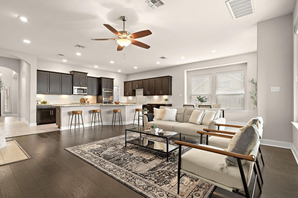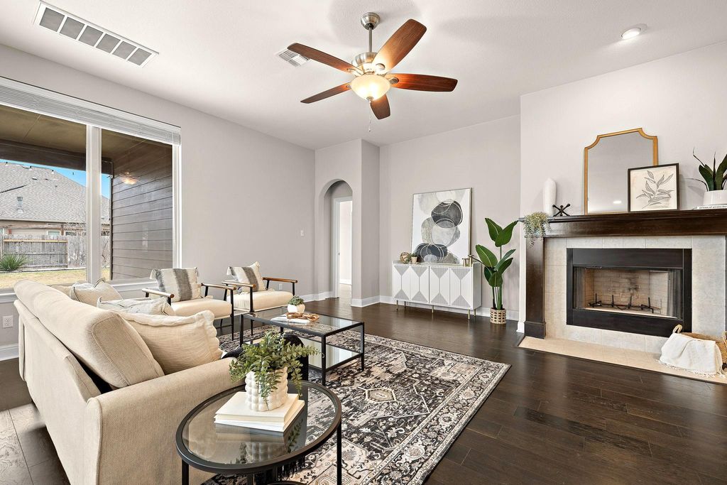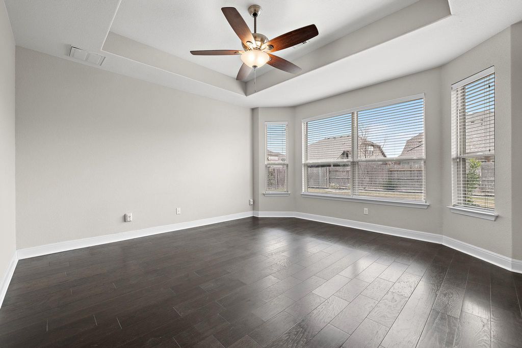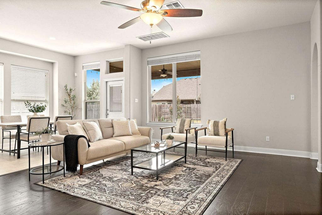 True showstopper in Falcon Pointe with abundant natural light, entertainer's kitchen, and dedicated office! This is one of those rare homes where you walk in and immediately feel good vibes! Lovingly cared for and extensively upgraded, this home features gorgeous wood flooring throughout the main living area and bedrooms, high ceilings, and plentiful windows and natural light. The true "heart of the home" is the gourmet kitchen. With high end granite countertops, tons of cabinet space, and a huge island which opens to the living room, it's the perfect space to entertain. The primary suite features tray ceilings and bay windows in the bedroom, leading into a spa-like bath with extended walk-in shower and rain shower head. A dedicated office, two additional bedrooms, and another full bath provide plenty of living space and flexibility for those who work from home. In the backyard, the large covered patio opens up to your own private oasis featuring thoughtful landscaping and additional trees creating a relaxing escape to start and end your days. New HVAC in 2025 and a recently replaced roof give added peace of mind! Falcon Pointe's amenities are truly outstanding - buyers can walk to parks, a scenic pond, and extensive walking trails. Other community features include swimming pools, hot tub, sport courts, fitness center, dog park, and more, and Blackhawk Golf Club, Lake Pflugerville, and Stone Hill Town Center are all just minutes away. Schedule your showing today!