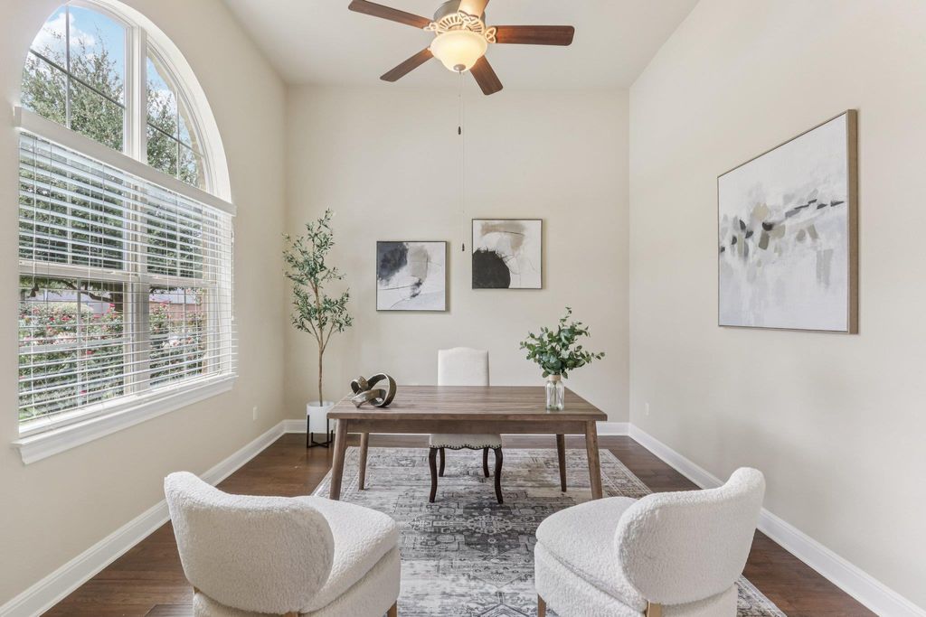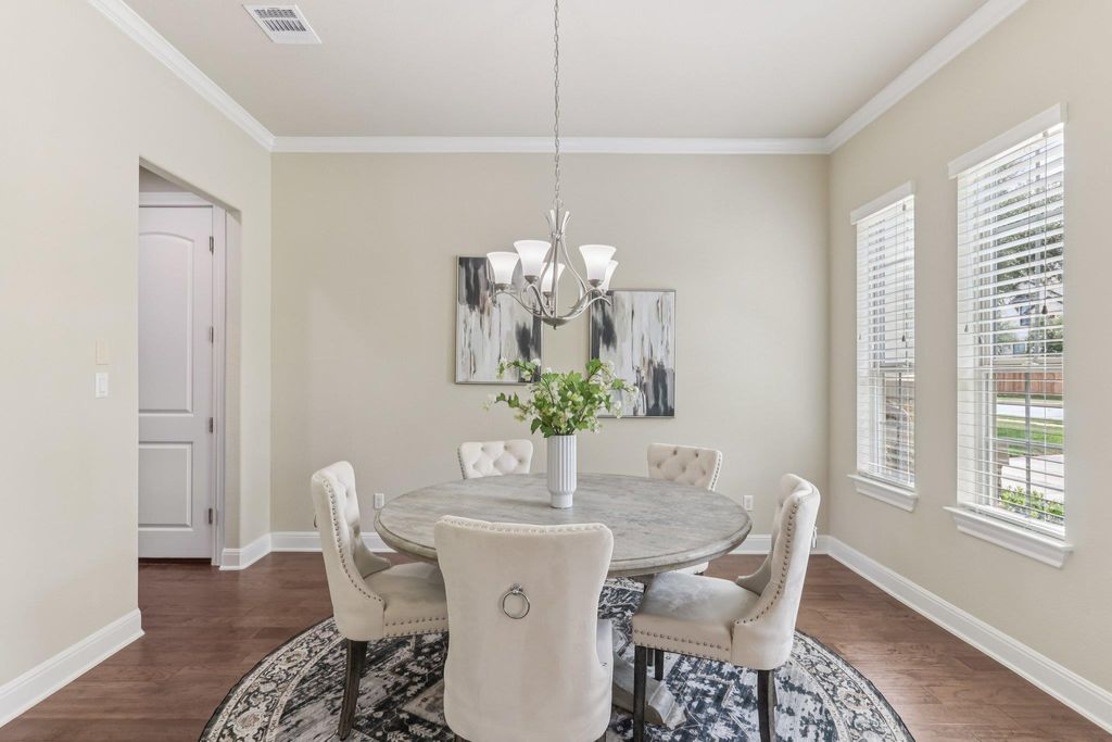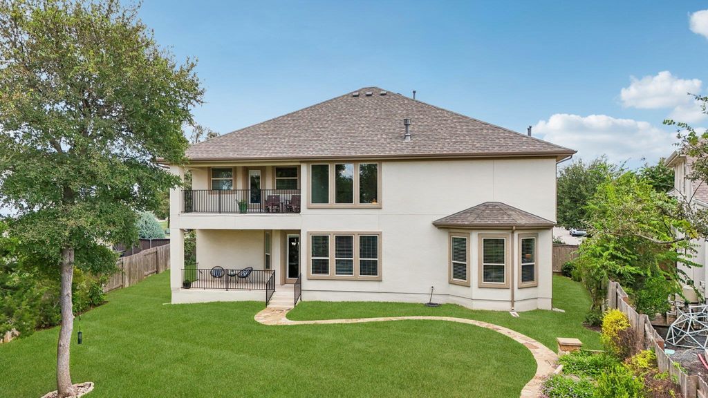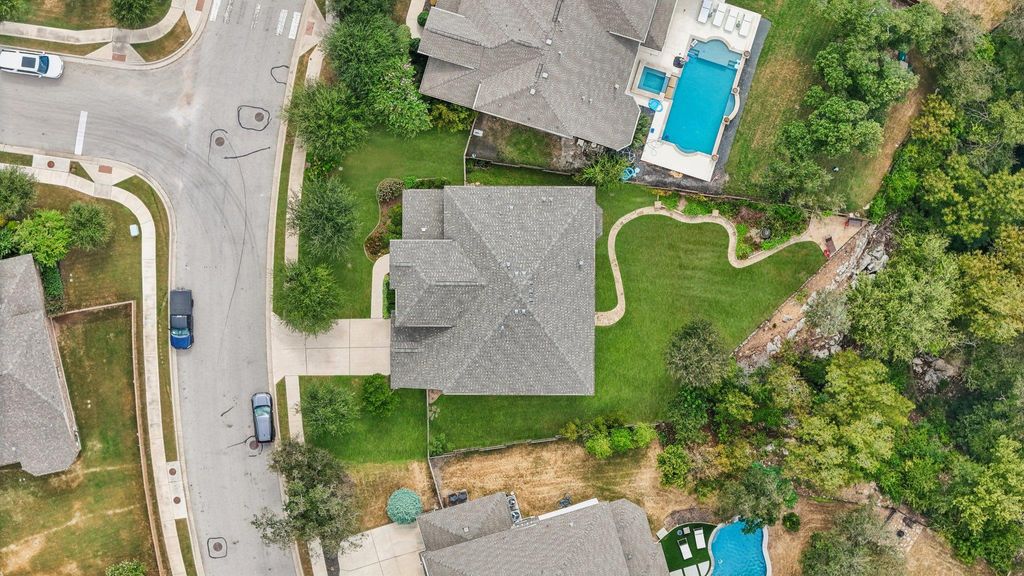 With one of the lowest tax rates in the area, this home backed by a sweeping canyon greenbelt in the Bluffs at Crystal Falls, this 3,516-sq-ft home delivers value, presence and privacy. Meticulously maintained and thoughtfully designed, it's a place where every space feels intentional"”whether you're hosting friends, working from home, or simply enjoying the quiet backdrop of nature. The main living area flows easily between the kitchen, dining, and casual gathering spaces, finished in timeless neutral tones, hardwood floors and tile. A dedicated office offers a calm, productive space, while a second living area"”currently a media/entertainment room with 7-speaker surround sound and subwoofer"”brings flexibility for movie nights, hobbies, or play. Step out from here onto a second-story deck, where sweeping greenbelt views and seasonal sunsets create an unforgettable setting. The primary suite is a retreat in every sense"”extra large with space for a sitting area and anchored by an oversized walk-in closet that's almost a room of its own. Upstairs, all bedrooms feature walk-in closets, and two secondary bedrooms share a convenient Jack-and-Jill bath. These rooms are noticeably larger than typical, creating comfort for all. Step outside and discover a backyard designed for both beauty and ease. Master-gardener-level landscaping frames multiple seating areas, offering perfect vantage points to relax or entertain. The lush greenbelt beyond ensures privacy, and the sound of a natural waterfall drifting from the canyon adds a serene soundtrack. An irrigation and drainage system keeps the space low-maintenance, while the level lawn is rare for a view lot. Practical features abound"”a tandem 3-car garage with epoxy flooring, multiple attic access points including a carpeted walk-in, and a brand-new roof (July 2025). All within minutes of Crystal Falls amenities"”pools, parks, trails, tennis, and golf"”plus nearby shopping, dining, and top-rated Leander ISD schools.