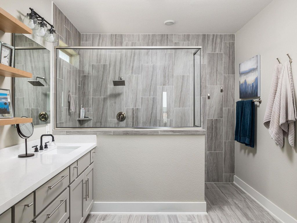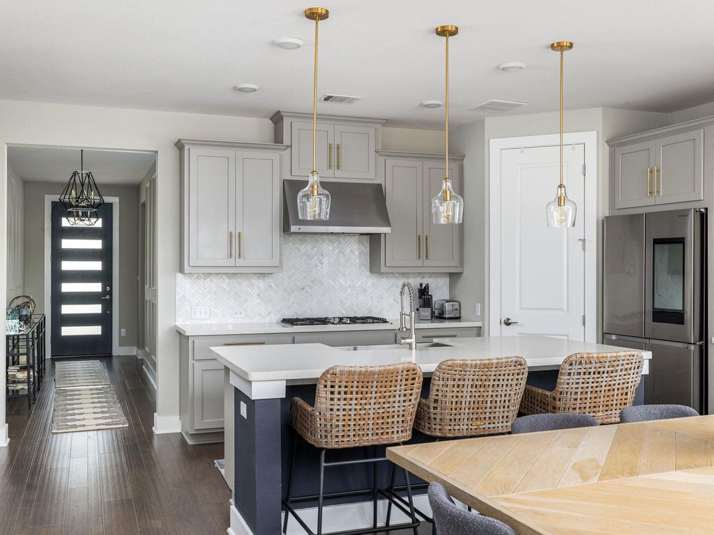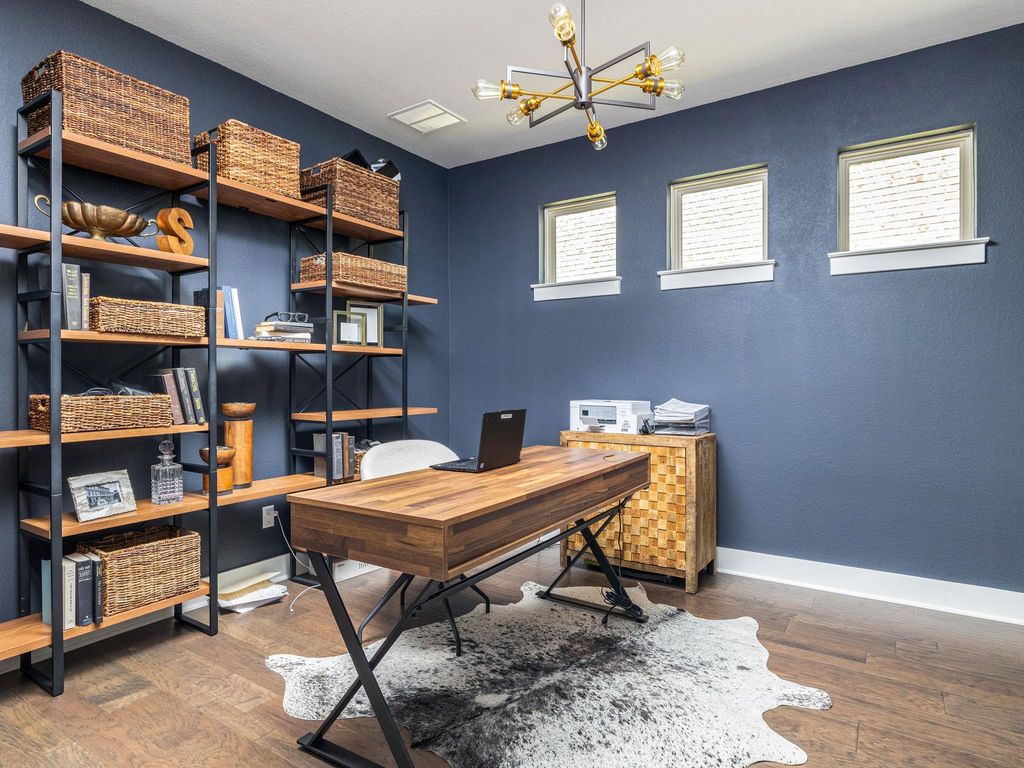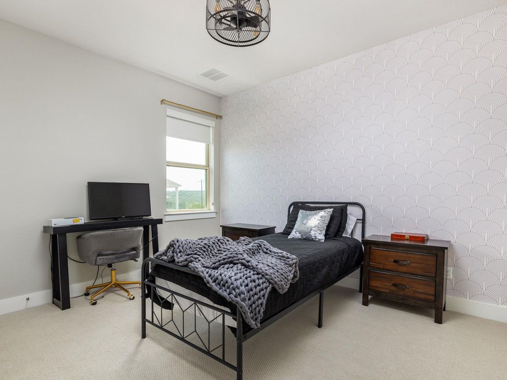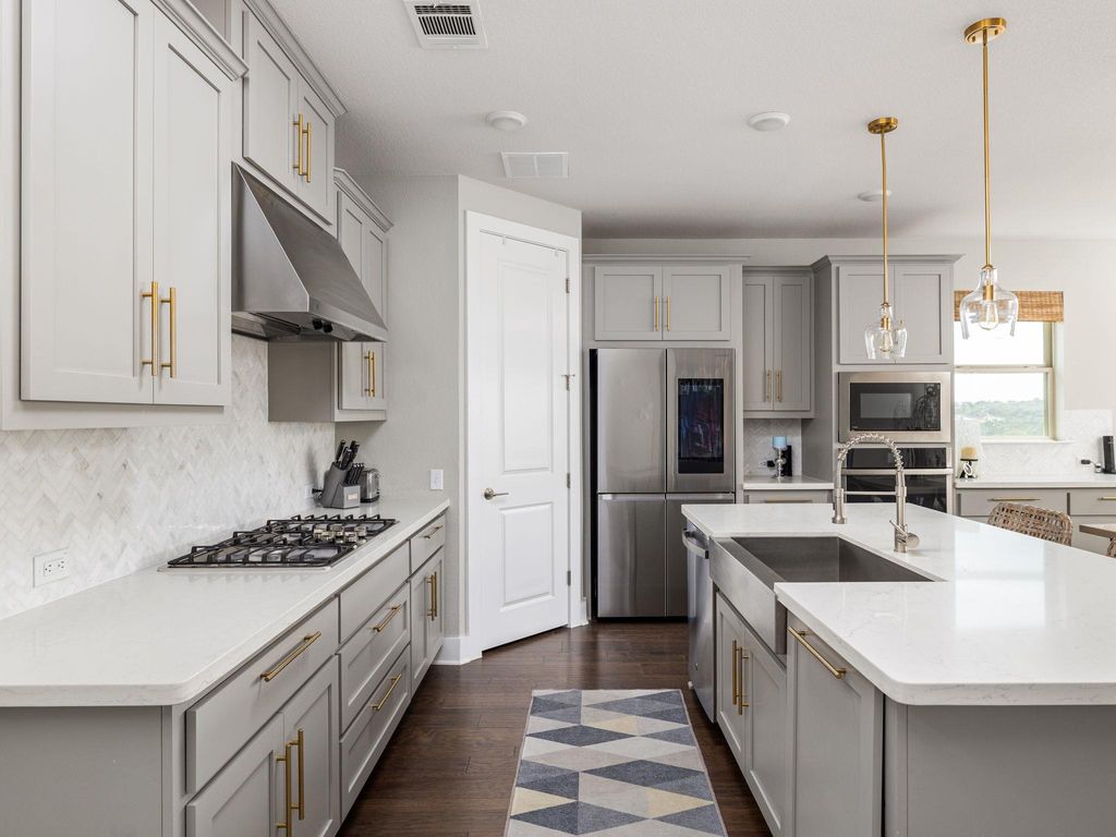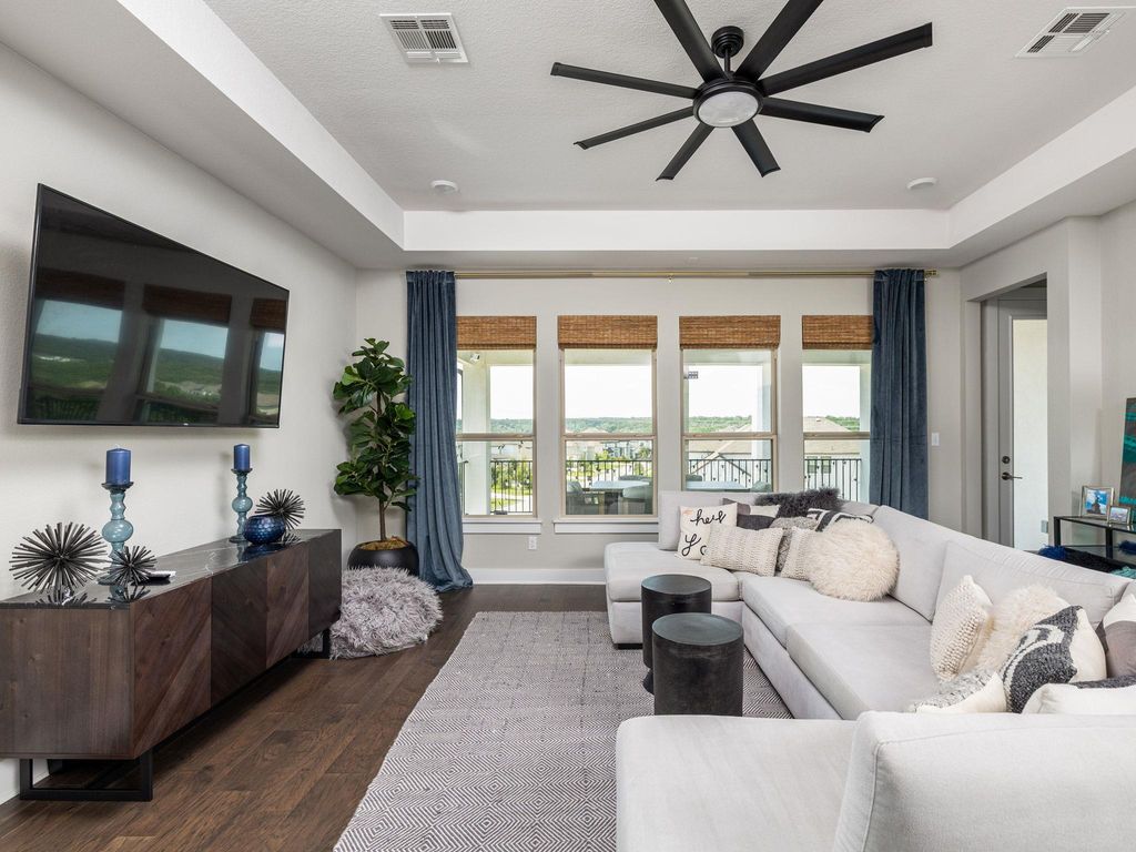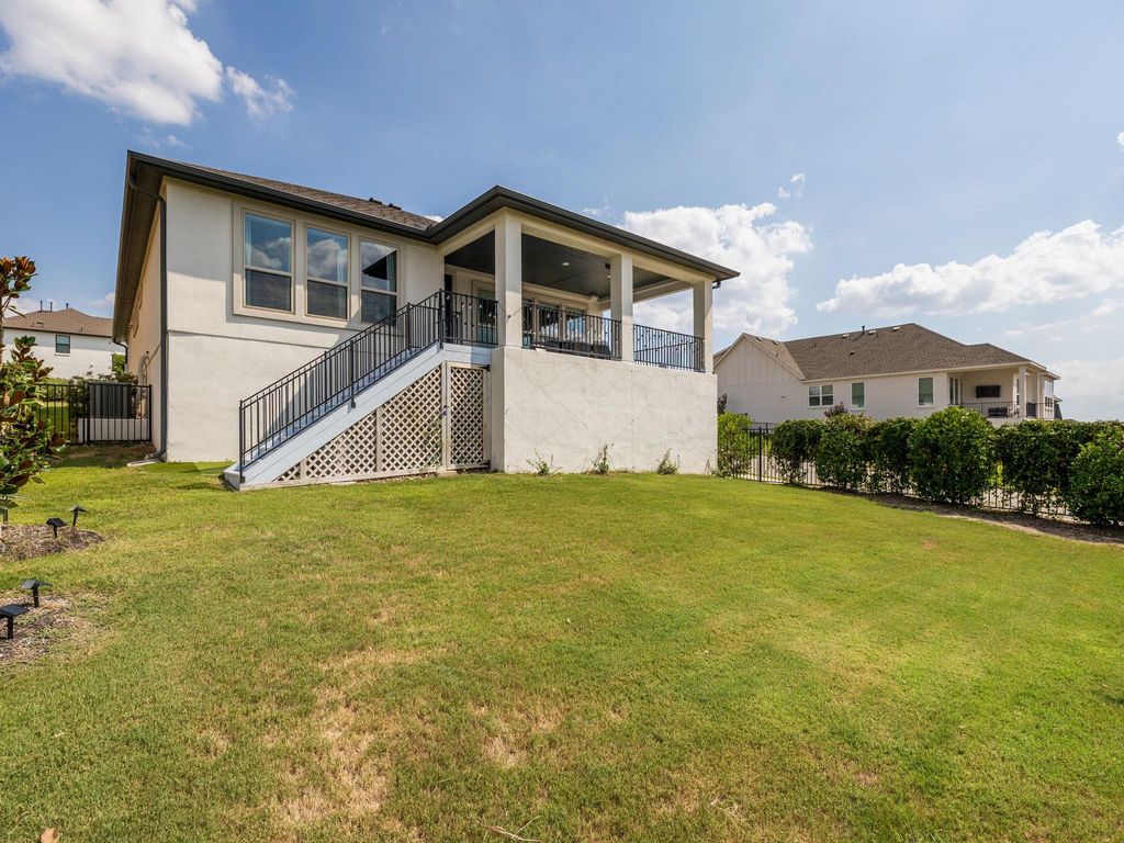Welcome to 4337 Lucabella "” a stunning 3-bedroom, 2.5-bath home with a dedicated office/flex space and an amazing hill country view in the prestigious Travisso community. Built in 2019 and enhanced with over $25,000 in upgrades, this home combines modern elegance with functional comfort. Step inside to rich wood flooring, high ceilings, and custom lighting that drop you off to an open-concept living, dining, and kitchen area filled with natural light and framed by hill country views. The gourmet kitchen features stainless steel appliances, granite countertops, a large center island, and a 5-burner gas cooktop "” perfect for both everyday meals and entertaining. Step out back and onto a serene large covered patio with a breathtaking hill country view and down a flight of stairs to the backyard featuring storage under the stairs, a one-hole putting green, and multiple flower beds providing an ideal setting for relaxation or gatherings. The spacious primary suite also offers beautiful hill country views, dual sinks, oversized walk-in shower, backlit vanity mirrors, and custom open shelving. The oversized Primary closet provides plenty of room for clothing, linens, and more via multiple hanging rods and built-in shelves that then open up to the laundry room with cabinets offering extra storage as well. Two additional bedrooms feature high ceilings, custom ceiling fans, walk-in closets, and share a well-appointed bathroom offering a great use of space for kids and guests alike. Additional highlights include tall ceilings, custom window treatments, custom wall molding, 8 ft doorways and backpack and show storage in the hallway to the garage. Travisso residents enjoy resort-style amenities including a clubhouse, pool, fitness center, hiking trails, and year-round community events. Conveniently located near 1431, 183A, 1890 Ranch shopping and dining, and top-rated Leander ISD schools, this home offers the perfect blend of hill country serenity and modern convenience.