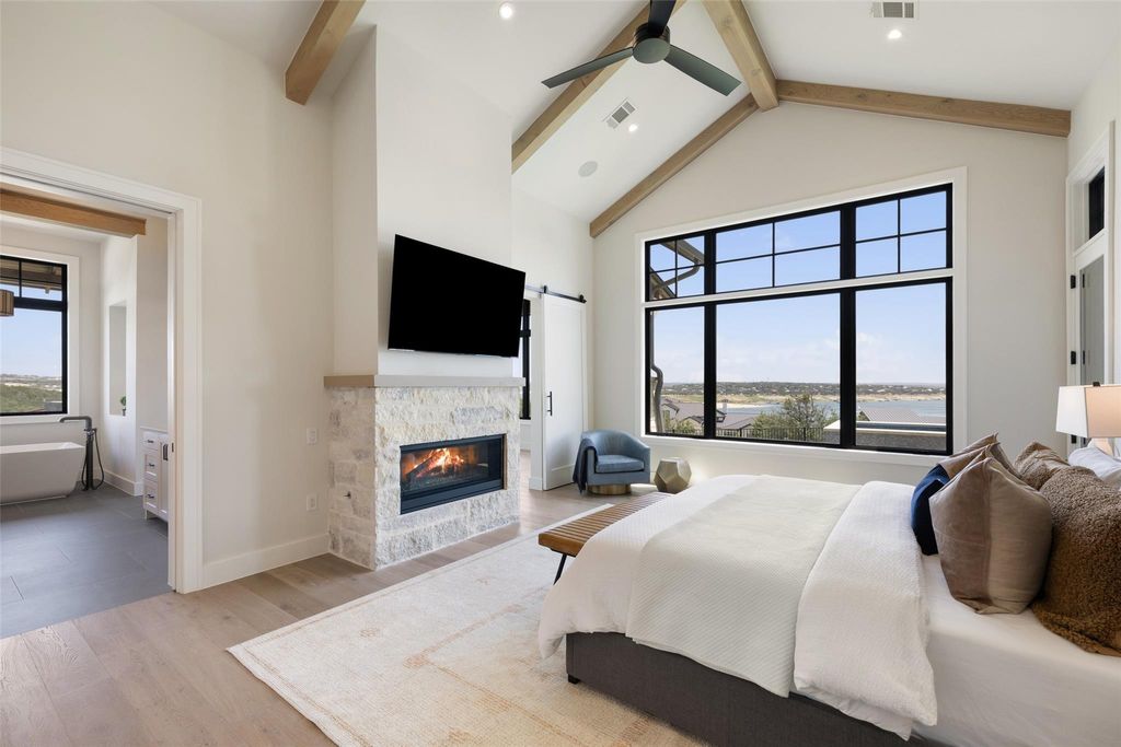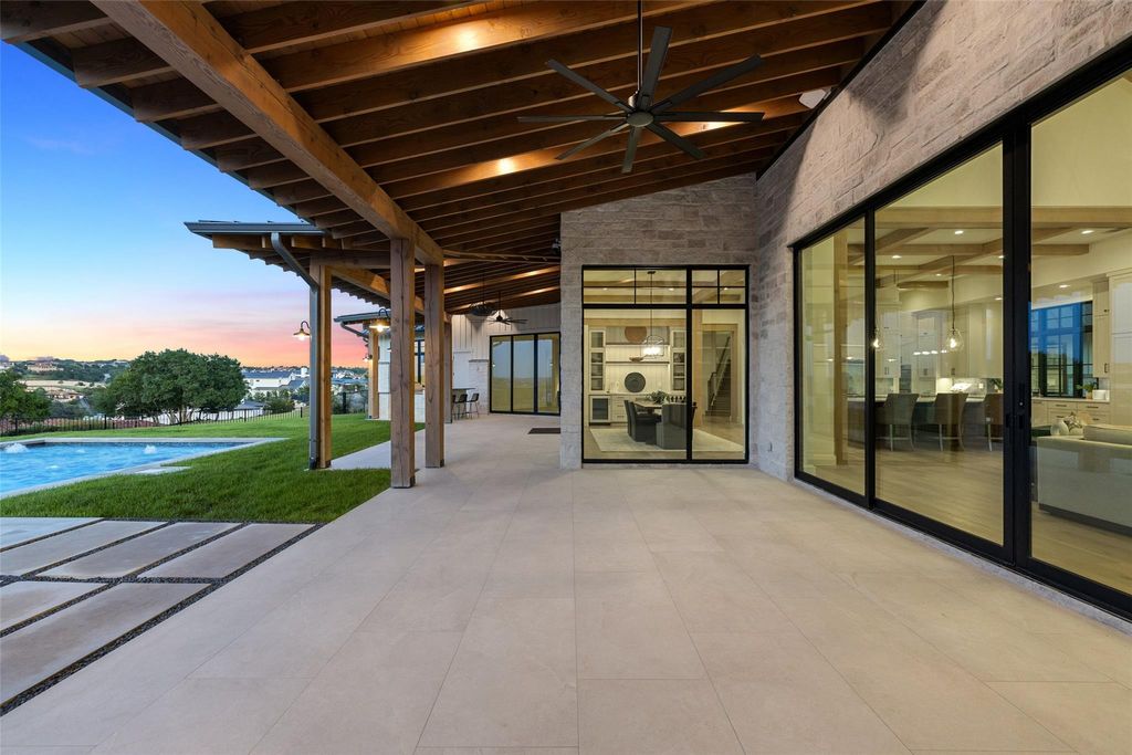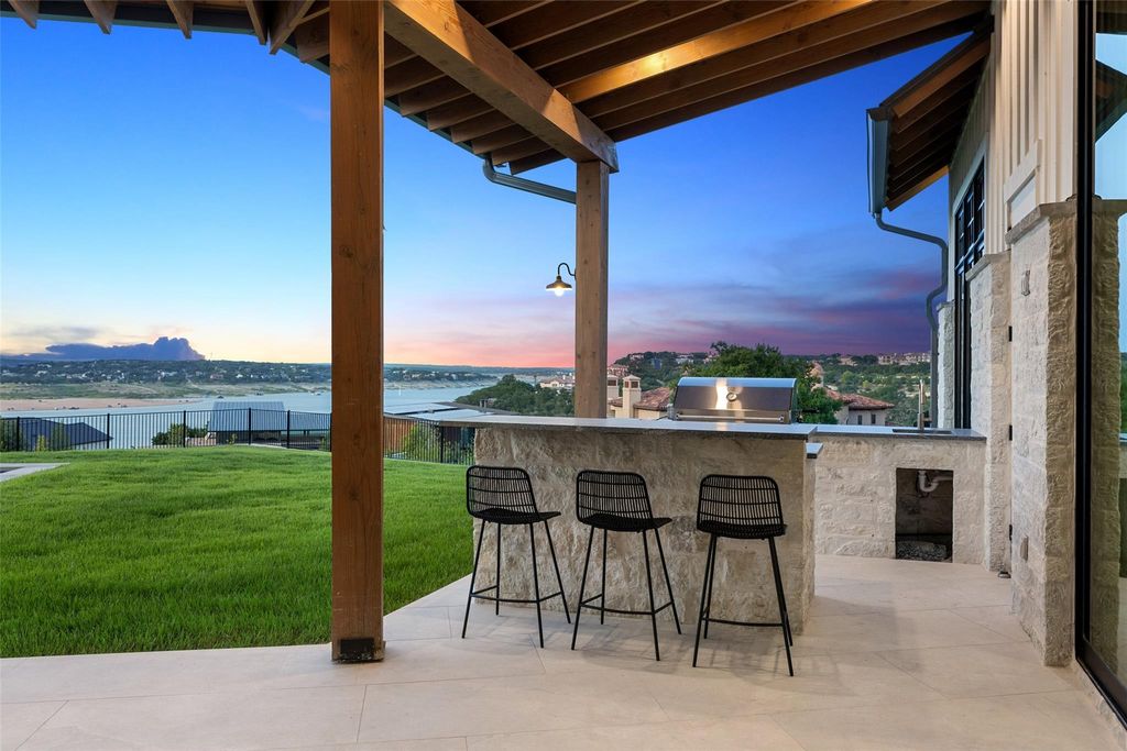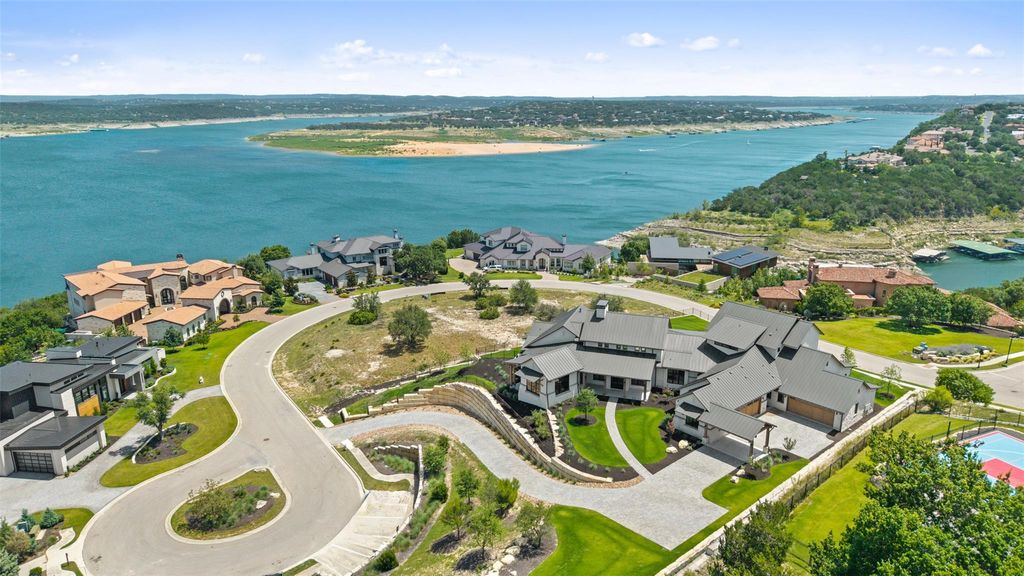 Exceptional custom estate located in the luxury gated Peninsula community within Rough Hollow, offering panoramic Lake Travis and Hill Country views from nearly every room. Set on a private drive off a cul-de-sac, this residence blends refined design with resort-style living. A grand porte-cochère entry leads to an open-concept interior with antique hand-hewn beams, expansive windows, and seamless indoor-outdoor flow. The large family room opens to a gourmet chef's kitchen featuring top appliances, custom cabinetry, an oversized island, and a full butler's pantry. Additional living spaces include a formal dining area, library/reading nook, game room, and dedicated home theater. The home offers 5 spacious bedroom suites, each with an ensuite bath. The luxurious primary suite includes private pool access, a spa-style bathroom with oversized walk-in shower and soaking tub, a vast closet with washer/dryer, and an adjacent sitting/exercise room. Secondary bedrooms feature lofts and stunning views. A large home office includes a private lake-view patio, plus an adjacent project room and separate storage. The home is equipped with extensive tech wiring and a full camera/security system. Outdoor living includes a resort-size pool and spa, covered lounge, and complete outdoor kitchen. The expansive yard offers room for a sport court or recreation area. A gentle path leads to private boat-slip access, with an available slip. Additional features: Oversized 4-car garage. Workshop/gym off garage. Private cul-de-sac setting. Large usable yard. A rare opportunity to own one of the premier homes in Rough Hollow's most sought-after-enclave.