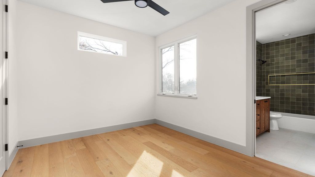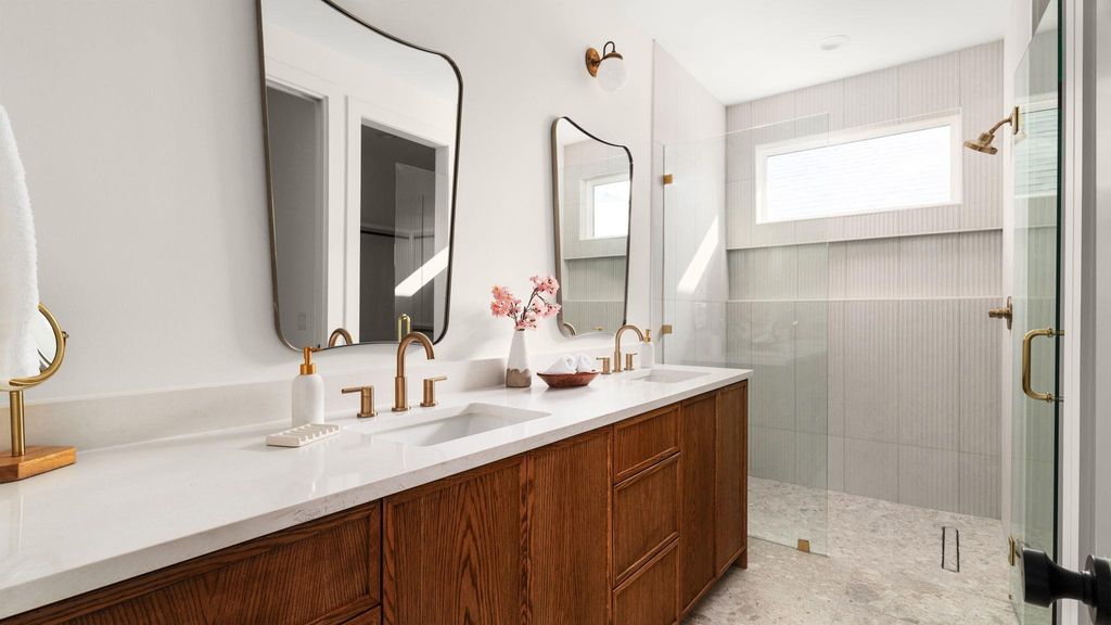 Step into elevated modern living in this Modern Transitional duplex residence, thoughtfully crafted with the same high-end finishes and architectural presence as the standalone home next door. Featuring a private driveway, attached carport, Designer fencing, and mature trees all around, this home blends luxury, efficiency, and comfort. A welcoming entry opens to bright, airy interiors with 10' ceilings and large windows that allow natural light to pour through the space. The Organic Modern kitchen features quartz countertops carried up the wall as a full-height backsplash, Quarterline shaker cabinetry with a curated mix of knobs and pulls, and a premium Bosch appliance package including a 36" gas range and drawer microwave. Sightlines extend from the kitchen through the dining area into the living room, creating a natural flow leading directly to the covered patio and outdoor space. This intentional layout embodies the Austin lifestyle"”indoor/outdoor living, comfortable entertaining, and everyday functionality. Upstairs, the primary suite offers a serene retreat with a curbless walk-in shower, frameless glass, and a built-in niche. Two additional bedrooms and a second bathroom provide flexibility for guests, children, office space, or hobbies. Additional features include: "¢ Navien tankless water heater "¢ Energy-efficient spray foam insulation "¢ Smart thermostat "¢ Ring doorbell "¢ Designer architectural fencing (metal, wood, and stucco) "¢ Modern lighting and finishes throughout Located in a quiet, walkable neighborhood with easy access to major highways and a 10-minute drive to downtown Austin, this home offers modern design, urban convenience, and exceptional livability. A refined, thoughtfully crafted modern home"”perfect for those seeking quality, comfort, and design-driven living.