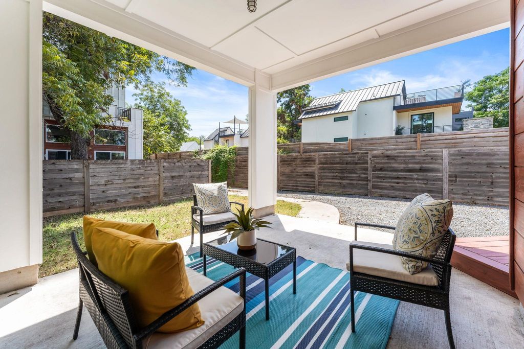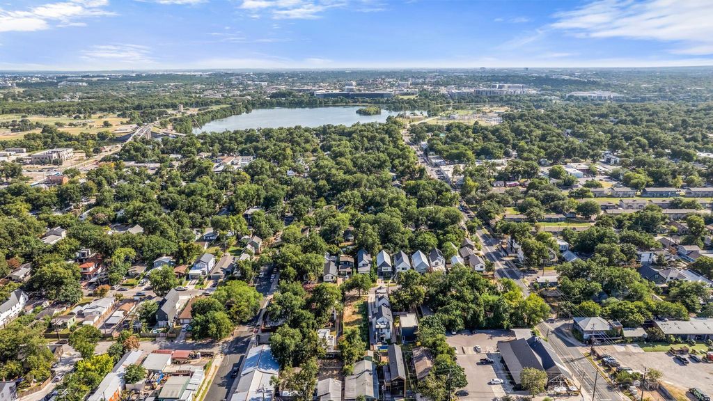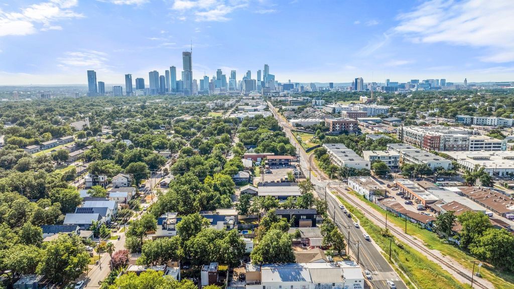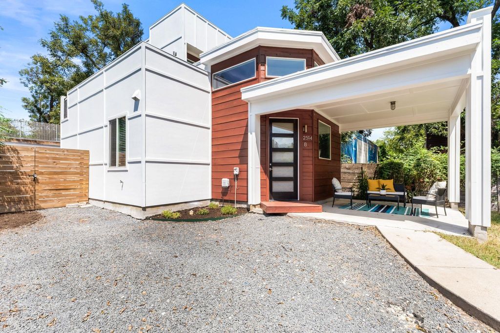 Unique Eastside modern abode with amazing walkability to E. 6th hotspots. Nestled on a quiet, tree-lined street, this B-unit lives MUCH larger than the square footage suggests. Primary bedroom downstairs! High ceilings and ample windows flood it with natural light, while a massive 2nd floor terrace boasts a partial view of Downtown Austin. Low-maintenance yard is great for letting out the dogs. Carport can be used for parking or outdoor living. There are 2.5 total baths, which include a powder room for guests and a second full bath upstairs. Walk home within five minutes from iconic Eastside bars like La Holly, then wake up and walk around the corner to Pershing East or Mercado Sin Nombre for artisanal coffee before continuing on to the Town Lake Trail just half a mile to the south. Whether it's a private East Austin crash pad, short-term rental, or primary residence, this little modern marvel embraces everything great about Austin's Eastside while enjoying a serene location slightly away from the hustle & bustle. Check it out today!