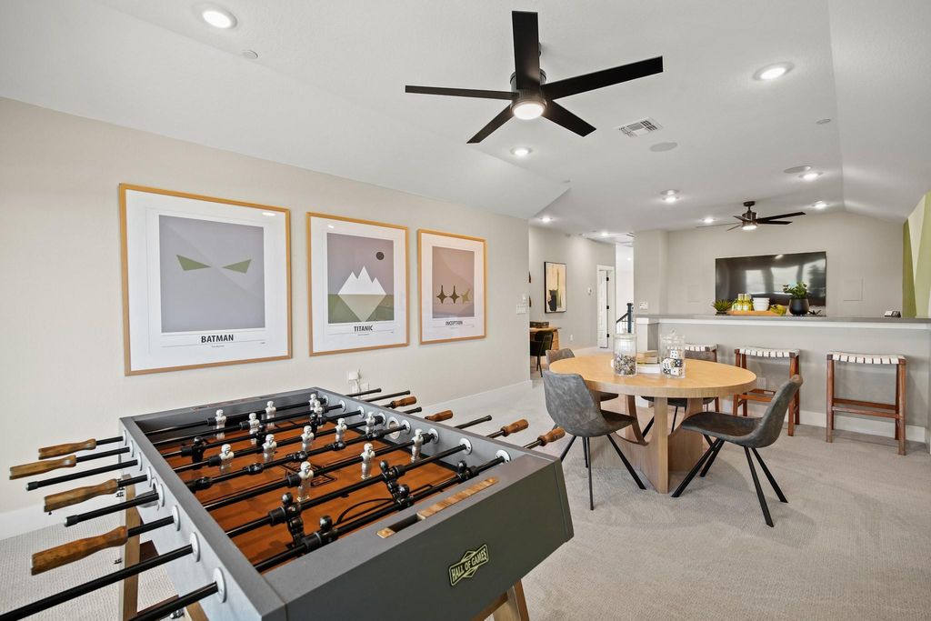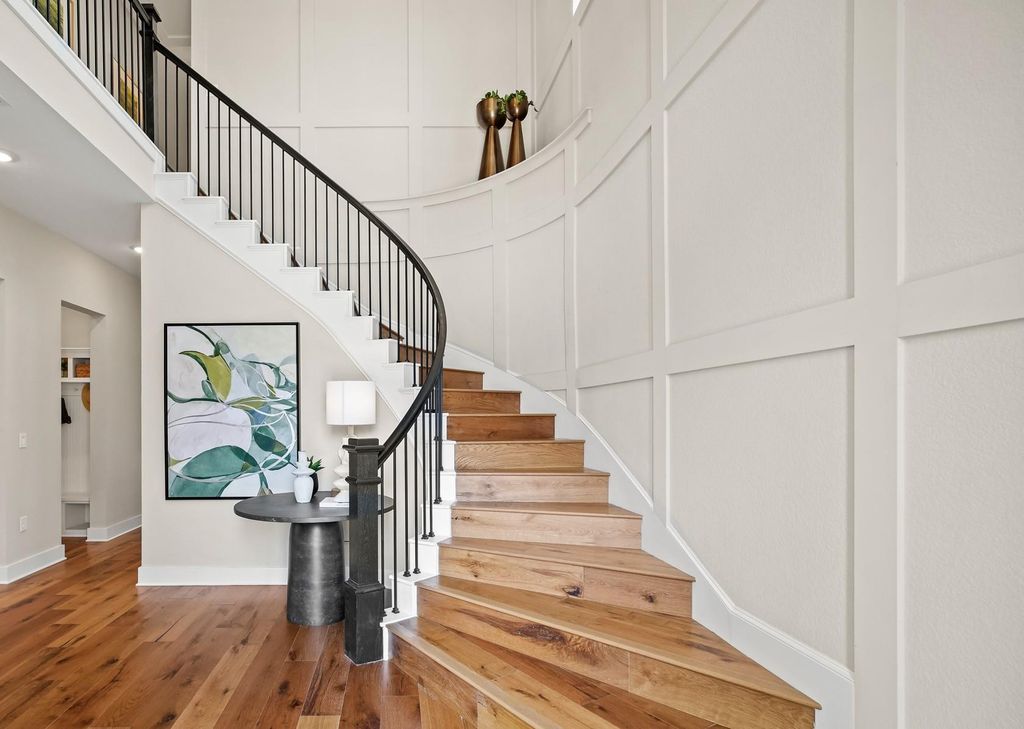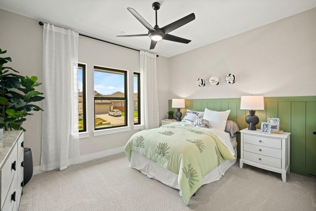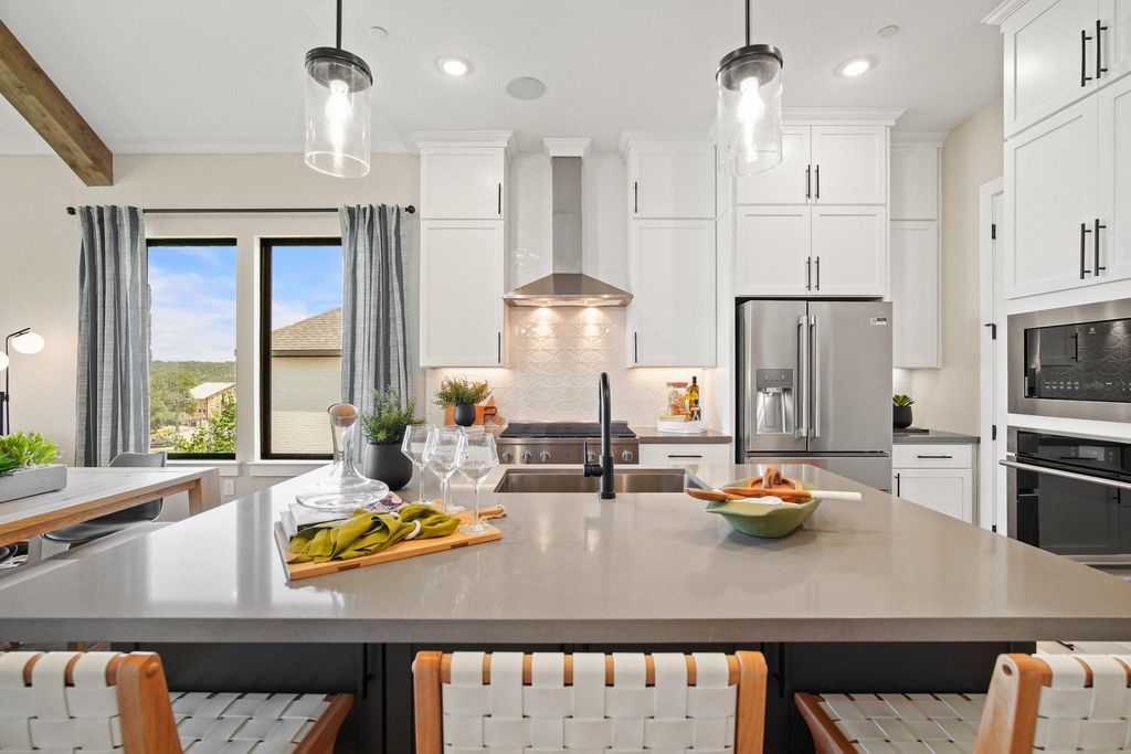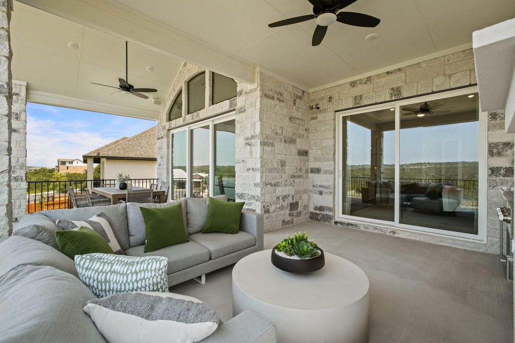 Do not miss out on this once-in-a-lifetime opportunity! Newmark Home's beautiful model home is for sale in the gorgeous Sweetwater community. This two-story Sierra floorplan features 4 beds, 3.5 baths, and a 2-car garage. When you walk in, take in all the glorious features this home has to offer, including a hard wood spiral staircase and flooring, top-of-the-line designer finishes, Quartz counter tops, accent lighting in the kitchen, 48'' allusion electric fireplace and solid wood beams in the family room. This home consists of many luxury upgrades so you can live in comfort and style, and all furnishings are negotiable if you love the interior design of this home. In the primary bedroom you will find a sliding glass door that leads out to the covered patio to take in the picturesque views as well as a free-standing tub in the primary bath, and large walk-in closet. Upstairs, host game nights with your friends and family in the game room and have movie nights in the media room when you're looking for some entertainment. Relax on the upstairs balcony and enjoy those delightful west Texas sunsets over-looking the hill-country. Lastly, the extended covered patio includes an outdoor kitchen with a refrigerator, deluxe grill, and a stunning fireplace. This home will not be on the market long - call Dori at 612-720-1090 to schedule a viewing today!