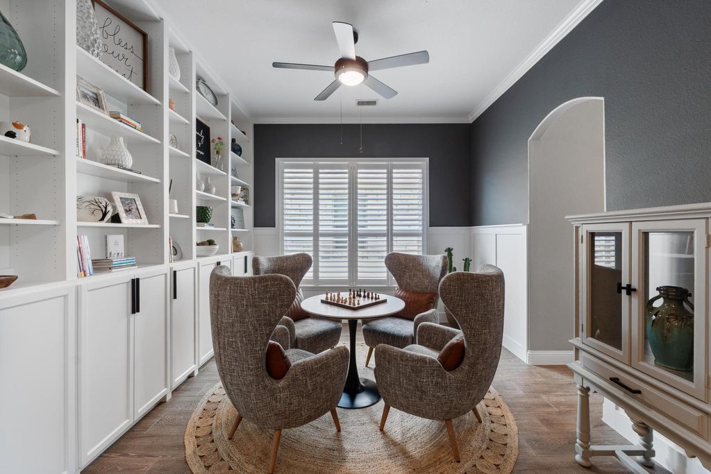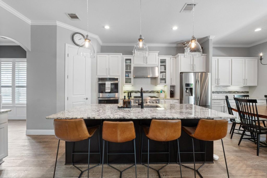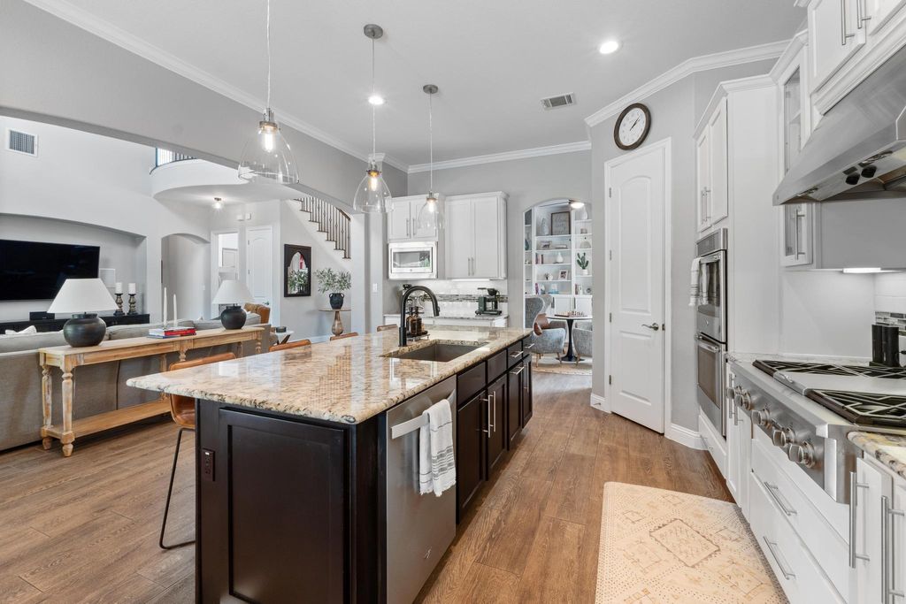 INTERIOR | Bookcases, Breakfast Bar, Built-in Features, Cathedral Ceiling(s), Ceiling Fan(s), Chandelier, Crown Molding, Double Vanity, Eat-in Kitchen, Entrance Foyer, Granite Counters, High Ceilings, High Speed Internet, Kitchen Island, Master Downstairs, Open Floorplan, Pantry, Recessed Lighting, Walk-In Closet(s), Wired for Sound |
