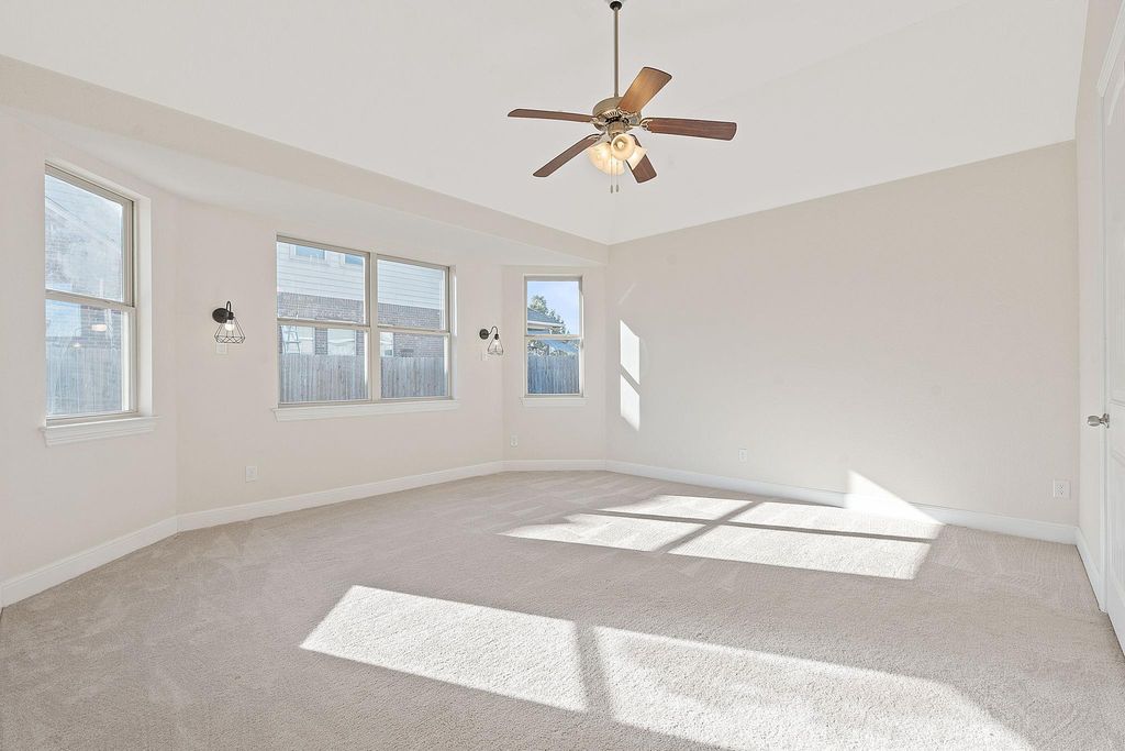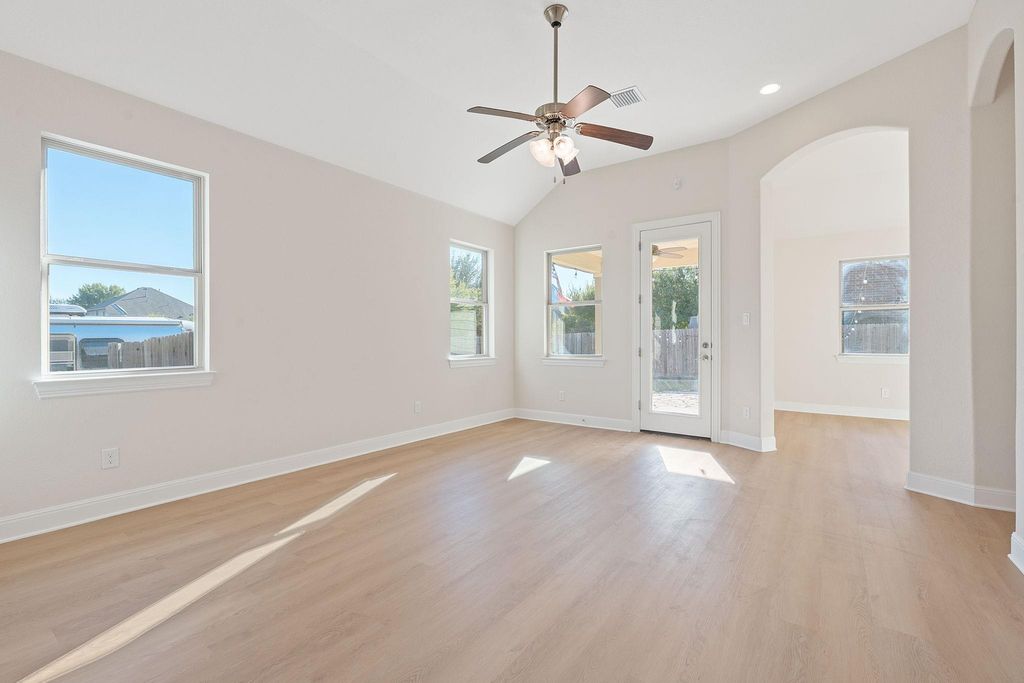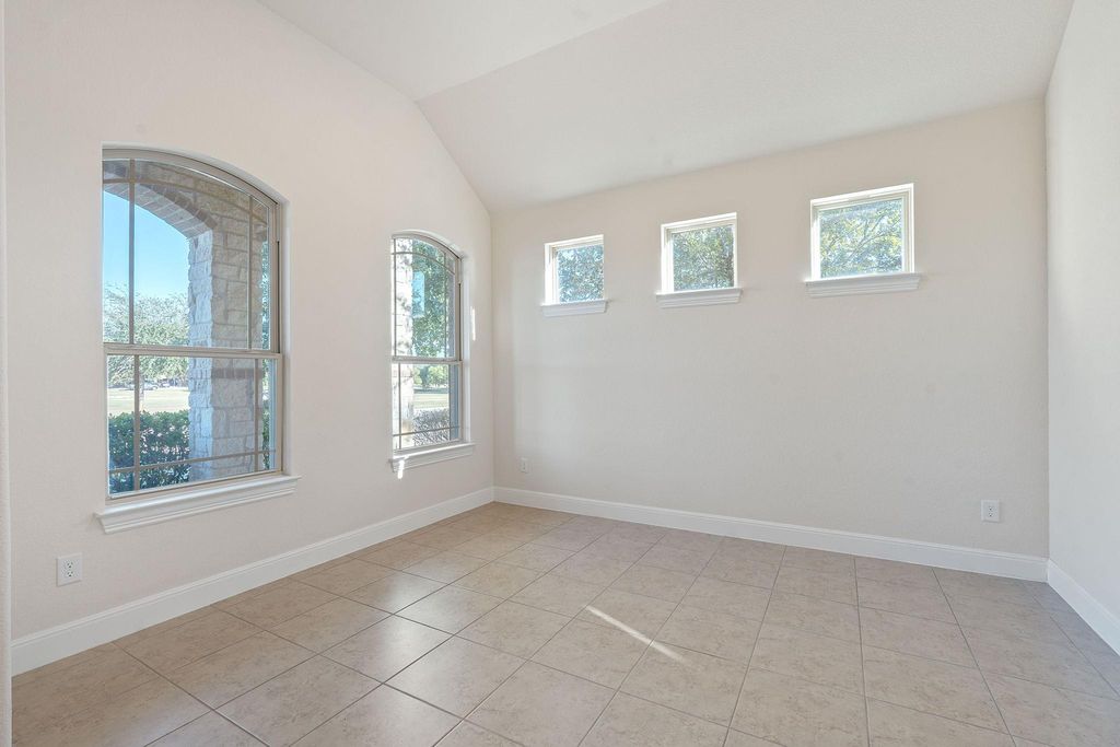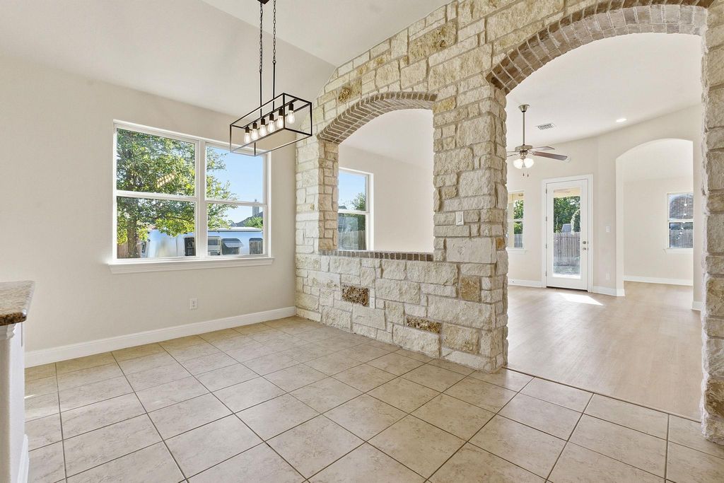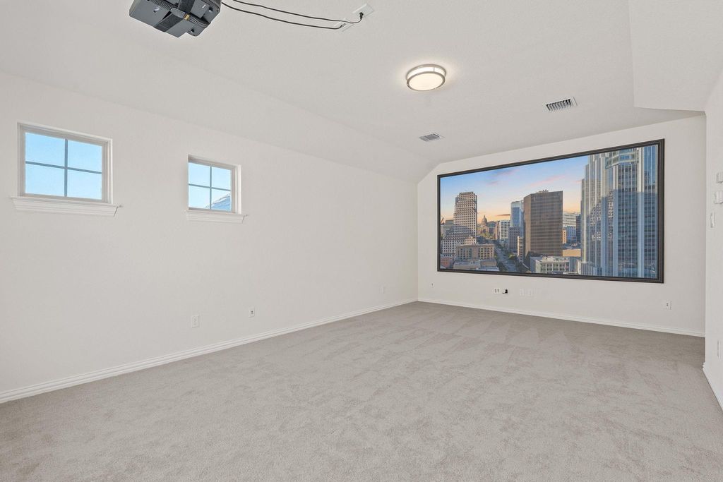 Dream Home Alert! This rare 1.5-story retreat is perfectly positioned on a peaceful corner cul-de-sac lot in The Commons at Rowe Lane, facing a serene greenbelt with tranquil views. The northeast-facing orientation lets you savor your morning coffee and breathtaking sunrises from the cozy front patio. Inside, soaring 10-foot ceilings and an abundance of natural light give the open floor plan an airy, inviting feel. A stunning stone accent wall serves as a timeless centerpiece separating the dining and living spaces, complemented by luxury vinyl plank flooring throughout. A flexible front room provides the perfect spot for a home office, playroom, or formal dining area. At the heart of the home, the gourmet kitchen shines with granite countertops, a large island, gas cooktop, and upgraded appliances-ideal for gatherings and everyday living. The primary suite offers a peaceful retreat with a curved wall of windows, soaking tub, frameless shower, and walk-in closet. Two spacious secondary bedrooms share a full bath, thoughtfully located for privacy and comfort. Upstairs, a dedicated home theater, complete with projector and an expansive screen, makes movie nights an experience to remember. This versatile space can also function as a quiet office, tucked away from the main living areas. Outdoors, enjoy a covered patio, extended flagstone area, and a private backyard enclosed by two side gates. Notable updates include a new HVAC with whole-house dehumidifier, modern lighting, LVP flooring, carpet, water heater, kitchen appliances, frameless shower, and a solid-wood front door. Residents enjoy community amenities including playgrounds, trails, and a pool-all just minutes from H-E-B, Costco, Stone Hill, Typhoon Texas, and top-rated schools. This home beautifully blends comfort, convenience, and scenic greenbelt living. For more info, go to: https://wkf.ms/4o8YlqC