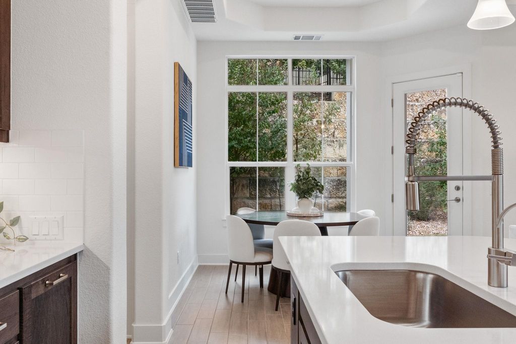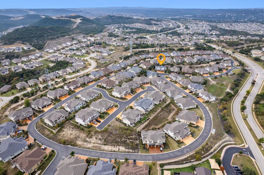 Experience the ultimate lock-and-leave lifestyle in the desirable Vineyards at Rough Hollow. This 3 bedroom, 2.5 bathroom home perfectly balances high end modern design with comfortable living, featuring an open floor plan highlighted by elegant tray ceilings and a sun drenched living area with a cozy fireplace. The gourmet kitchen has sleek quartz countertops and custom cabinetry and flows effortlessly into the main living space. Retreat to the private main floor primary suite which offers a spa-like bath with a massive walk-in shower. Additional bonus spaces include a dedicated media room and an upstairs loft perfect for a home office. Outside, the private yard includes a large covered patio. You can enjoy amenities including access to the Yacht club, resort-style pools, a lazy river, tennis courts, and miles of scenic trails. With the marina and top rated Lake Travis schools nearby, this home has so much to offer. Best of all, the monthly HOA covers full yard maintenance and exterior insurance for truly effortless living. *Water softener will convey with the sale*