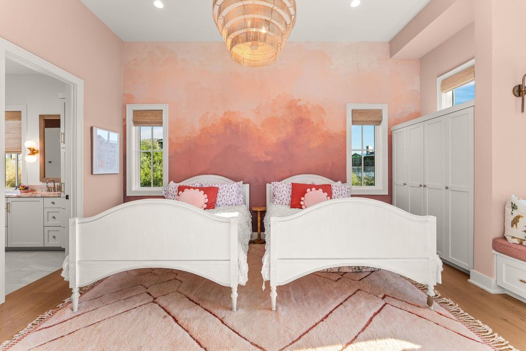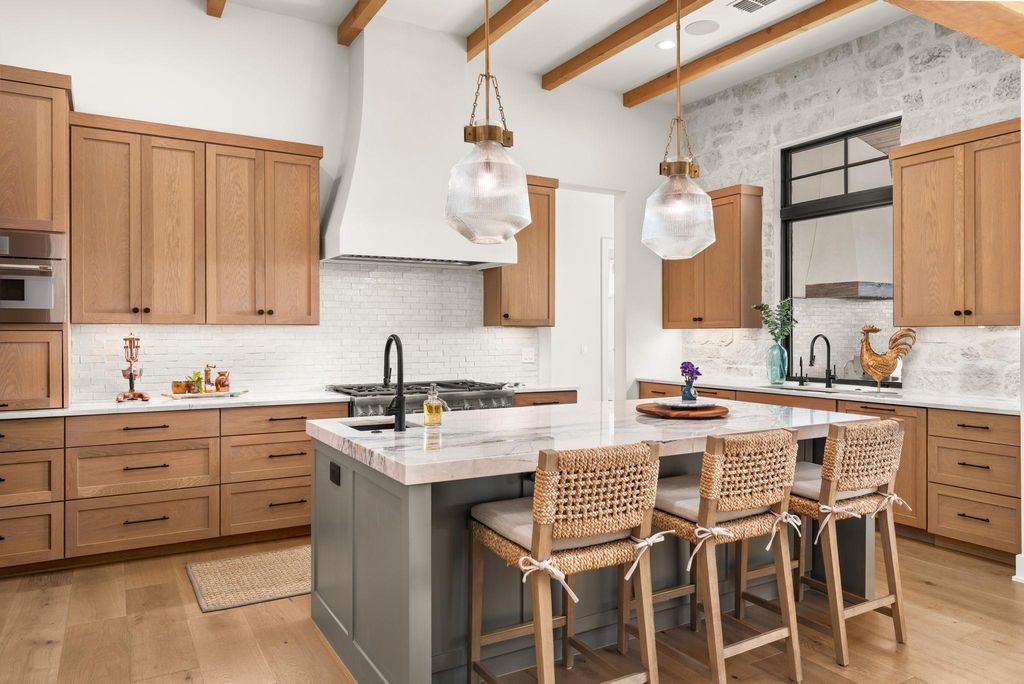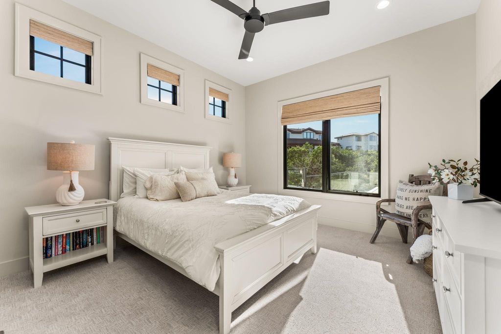 Completed in 2025, this custom-built home in the exclusive gated community of Spanish Oaks offers ~4994.17 sq. ft. of thoughtfully designed living space with 4 bedrooms, 4 full baths, & 2 half baths. Built with quality craftsmanship, high-end finishes, & attention to detail, the home combines comfort, function, & timeless design in a highly desirable setting. The main floor highlights an open floor plan with cathedral ceilings, a living room with a gas fireplace & oversized temperature-controlled built-in wine cabinet, & private office with built-in shelving. Two main-level suites, each with double vanities & walk-in closets. On the lower level, you'll find two additional bedrooms, a gym/bonus room, & a bunk room with four built-in full beds, each with its own light & charging station, plus a wet bar with a sonic ice maker. A hidden door opens to a moody flex space suited for a playroom or creative use. Multiple living areas throughout the home provide space for both entertaining & retreat. Outdoor amenities include massive covered patio space, a large pool, spa, outdoor shower, built-in fire pit, pizza oven, & BBQs on both patios. A rock fountain at the entry adds a peaceful touch, while the orchard & raised garden beds offer seasonal harvests of fruit & vegetables. Hill Country & neighborhood views create a serene backdrop for stunning sunsets at the end of a quiet cul-de-sac. The 3-car garage is wired for a golf simulator & equipped with electric vehicle hookups.?Additional features include an in-home sound system (Sonos), exterior Ring cameras, outlets in the eaves for holiday lighting, genuine reclaimed wood siding, three dishwashers, & 2 laundry rooms. Double-insulated floors & added wall insulation enhance sound control throughout. Located in the Villas of Spanish Oaks, residents enjoy 24/7 gated security, award-winning amenities, & the exceptional lifestyle this sought-after community offers "” all within the highly regarded Lake Travis ISD.