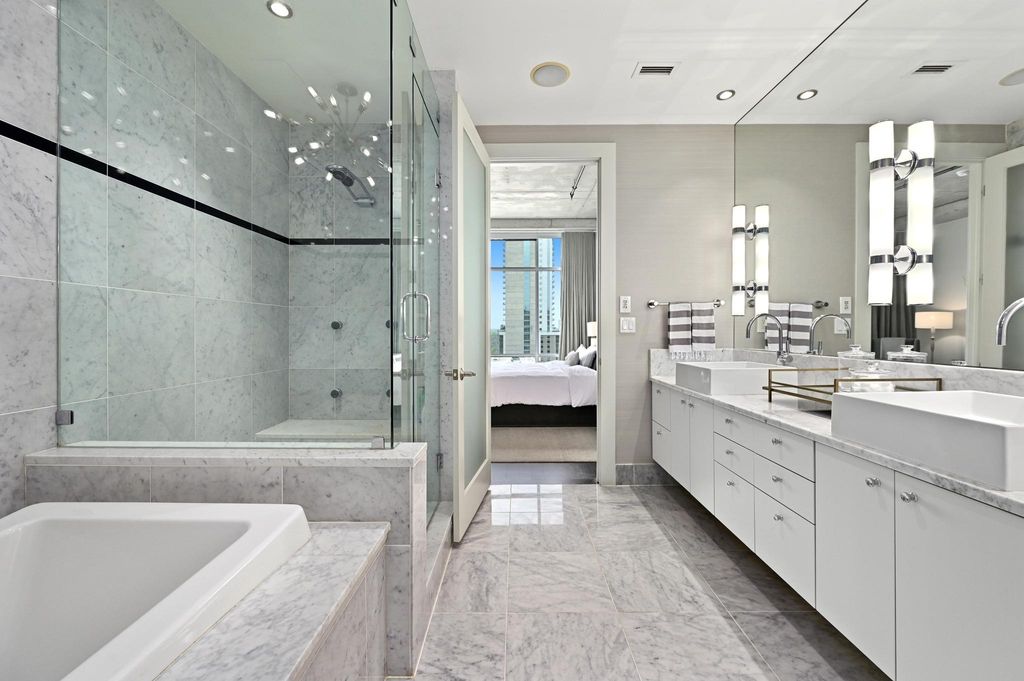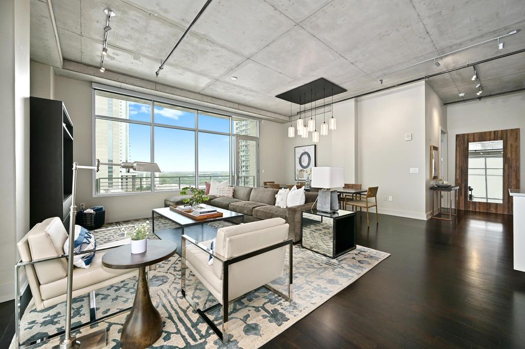 Located in one of Downtown Austin's most coveted residential towers, this impeccably designed 2-bedroom, 2-bath residence offers 2,422 square feet of elevated luxury and panoramic views of the city skyline, and Lady Bird Lake. Every detail of this home has been carefully curated, creating a blend of modern elegance and relaxed sophistication. The expansive, open-concept living and dining areas are framed by floor-to-ceiling windows, filling the space with natural light and showcasing Austin's most iconic views. Soaring concrete ceilings, rich hardwood floors, and industrial accents create a striking backdrop for both daily living and refined entertaining. The sleek kitchen features top-tier appliances, clean-lined cabinetry, and ample space for gathering. The primary suite is complemented by a spa-like ensuite with marble floors and countertops, a deep soaking tub, dual vanities, and an oversized walk-in shower with a bench and multiple showerheads. A generous second bedroom offers versatility for guests or a home office setup. Offered fully furnished, this residence is move-in ready and includes two assigned parking spaces in the building's secure garage. Residents enjoy exclusive access to luxury amenities including a resort-style pool, sundeck, bike storage, BBQ grill, 24-hour concierge, and controlled access for ultimate peace of mind. Located in the heart of Austin's vibrant core, you're steps from Whole Foods, world-class dining, boutique shopping, and the cultural pulse of the city. Whether you're seeking a primary residence or a turnkey city escape, Unit 808 offers the perfect balance of privacy, convenience, and style.