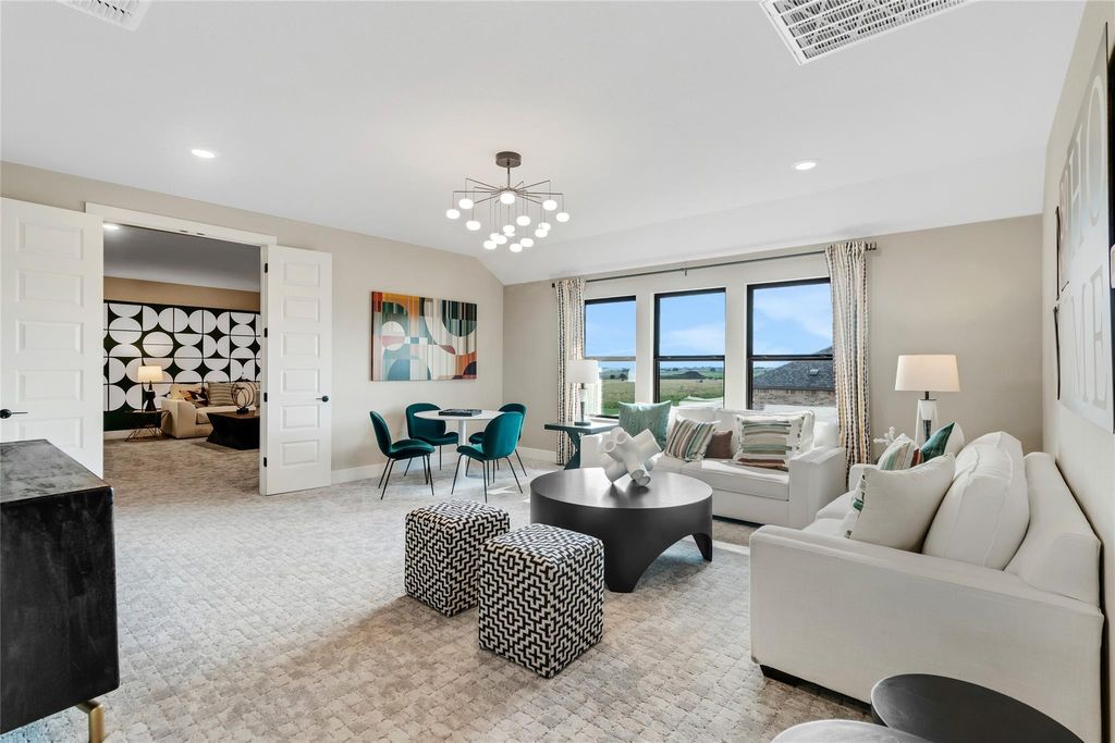 The MOST Amazing Home you will find in Blackhawk! Unbelievable GFO Model Home now Ready to Sell and builder ready to move-out. Located in the vibrant & most sought after Master-Planned Community in Pflugerville - Blackhawk! Welcome to our awe-inspiring two-story Kennedy floorplan from our grand Presidential Series. This luxurious spacious Custom Model Home boasts 4,757 SF with 5 Bedrooms, 4.5 Bathrooms, and a spacious 2-car Garage. Highlights on the main floor include a Guest Suite with full Bathroom, stunning private study perfect for at home work, a Bonus Flex room with Built-In bookcases, an opulent Open Concept Family Room with soaring luxurious 2-story Vaulted Ceilings with windows climbing all the way up, floor to ceiling contemporary tiled Electric Fireplace, and designer Gourmet Chef's Kitchen featuring a Huge oversized Center Island with decadent "waterfall" countertops wrapping to the floor on the sides, a Walk-in Pantry, a butler's pantry, and attached Breakfast & Dining Area. Enjoy a spacious Covered Patio leading out to the Private Backyard, a luxurious Primary Suite and Spa-Inspired Primary Bathroom with dual vanities, a designer Free-Standing Tub, separate Walk-in Super Shower, and Oversized Walk-In Closet. Discover additional functionality with a laundry room with built in cabinets and sink, and a mudroom off the garage entrance. Upstairs you'll find a large spacious additional sitting area at the top of the grand staircase, Game Room for endless fun, separate Media Room with built in cabinetry, wine fridge & storage, and wet bar- and 3 additional Bedrooms and 2 more full Bathrooms. With selected designer lighting & finishes and stunning custom wall & ceiling treatments throughout, you'll experience high-end living at its finest with this Kennedy former Custom Model Home in the beautiful & scenic Master-Planned Community of the Ridge at Blackhawk in the Best Location in Pflugerville!