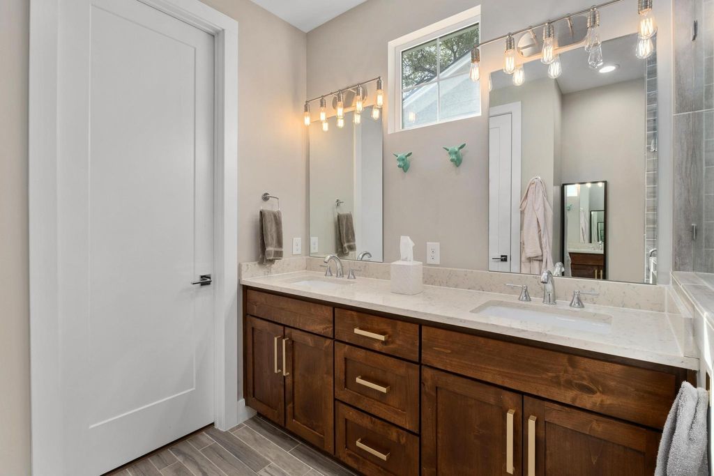 Experience the perfect blend of modern design and unbeatable location in Central Austin. Nestled just minutes from downtown Austin and the city's premier shopping and dining hubs, this newer construction home offers elevated comfort and convenience. Step into an open-plan layout where the kitchen flows seamlessly into a spacious eat-in area and inviting family room"”ideal for entertaining or relaxed everyday living. Rich hardwood floors add warmth and elegance throughout the main level, which features a private primary suite for easy downstairs living. Upstairs, you'll find three generously sized bedrooms and a versatile den or office space"”perfect for remote work, play area, or a cozy media room. Outside, the low-maintenance backyard is a true retreat, complete with lush turf, a custom putting green, and a Cowboy Pool for cooling off in style. Whether you're hosting friends or just enjoying the day, the majestic oak tree provides a shaded sanctuary for outdoor living at its finest. A whole-home generator ensures peace of mind during storms or outages, while the garage's mini split AC keeps pets comfortable or creates the perfect workshop environment. This home checks every box for comfort, style, and location.