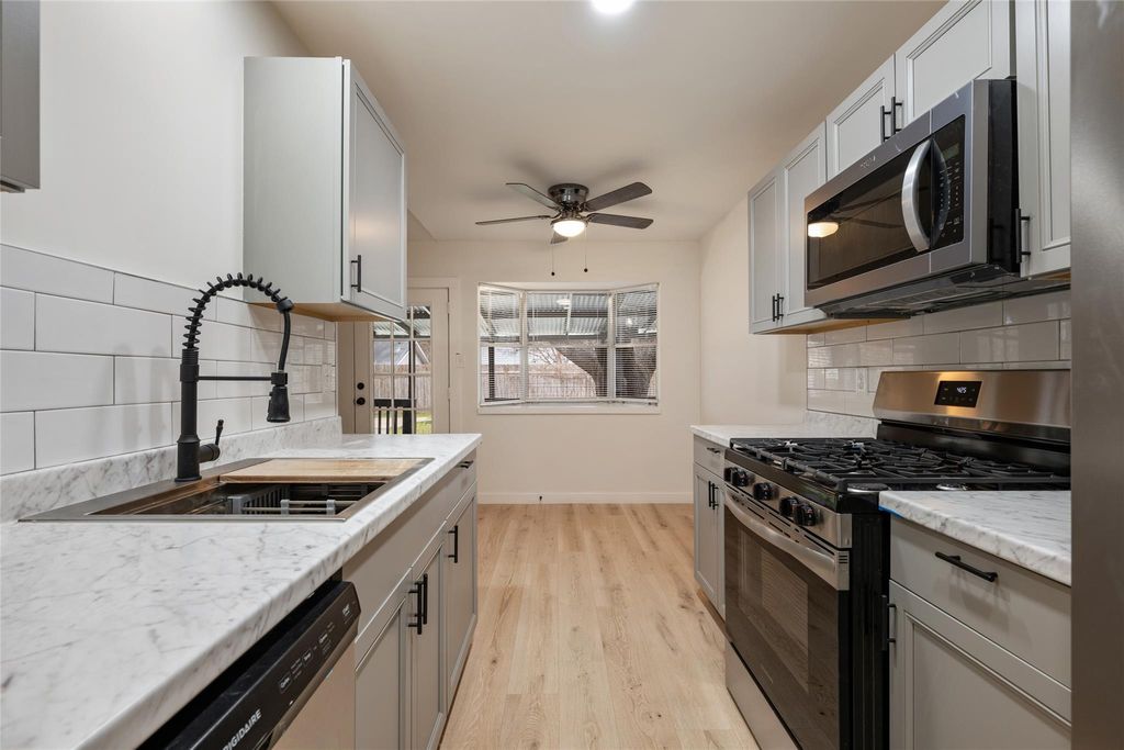 Discover this beautifully updated, four-bedroom, two-bath home, perfectly blending style and functionality. This home boasts a modern aesthetic with newly installed laminate flooring throughout, an updated kitchen with all new paint, sleek stainless steel appliances in the kitchen, new cabinets, ceramic tile backsplash, new hardware and light fixtures, with updated modern baseboards as well, and lots of storage. The modern hall bathroom has ceramic tub surround and vanity. The versatile fourth bedroom features a separate entrance and newly installed ensuite modern bathroom with laundry, making it an excellent option for a home office, guest suite, or creative space. Enjoy outdoor living on the covered back patio, ideal for entertaining or relaxing year-round. Situated in a prime location, this home offers easy access to downtown Austin, schools, major highways, and is just less than 25 minutes from Tesla's Gigafactory. Don't miss this opportunity to own an affordable renovated home today! Professional photos of new bathroom and floorplan coming.