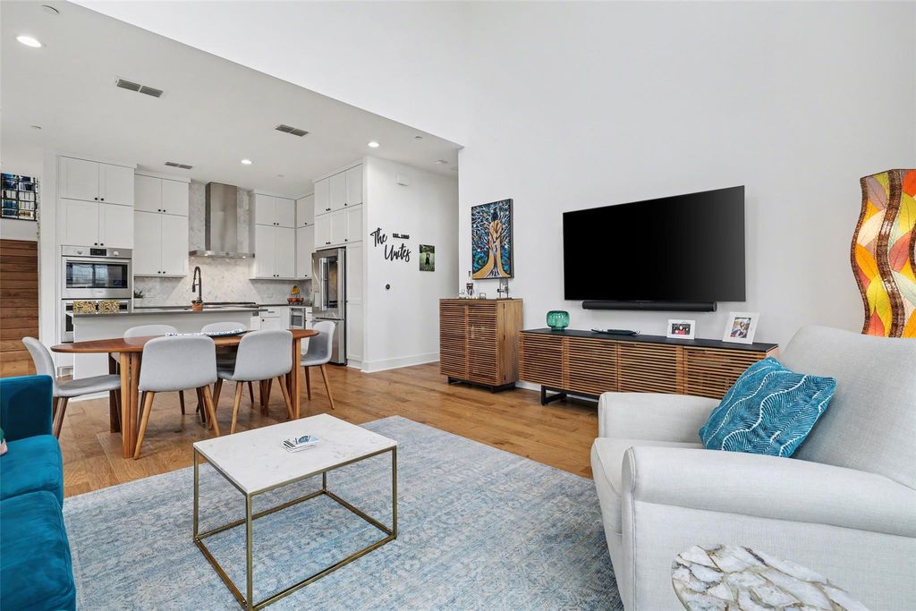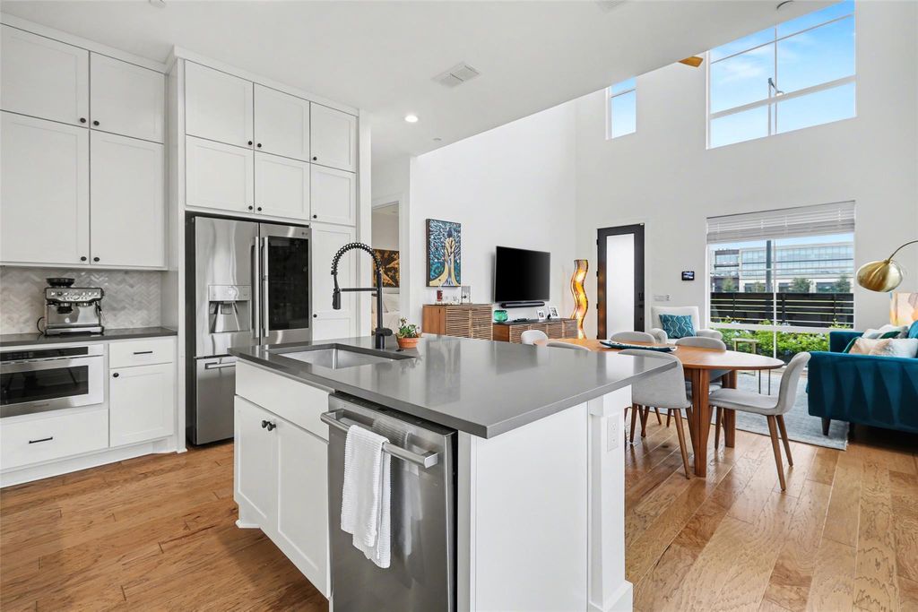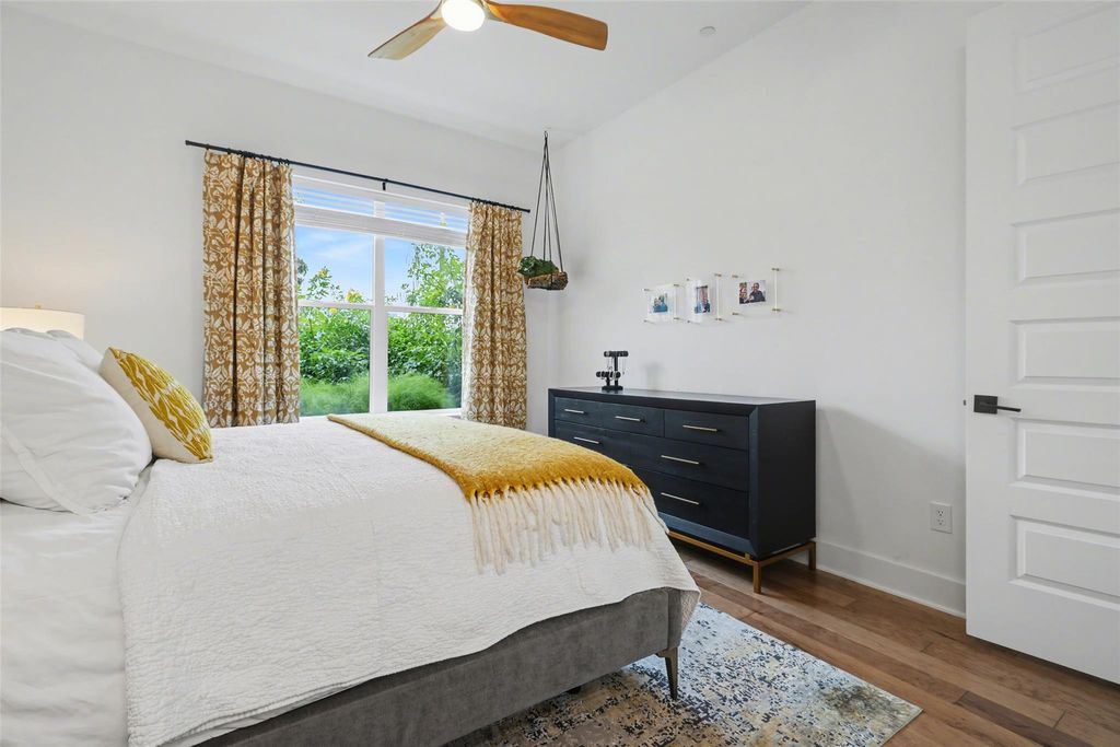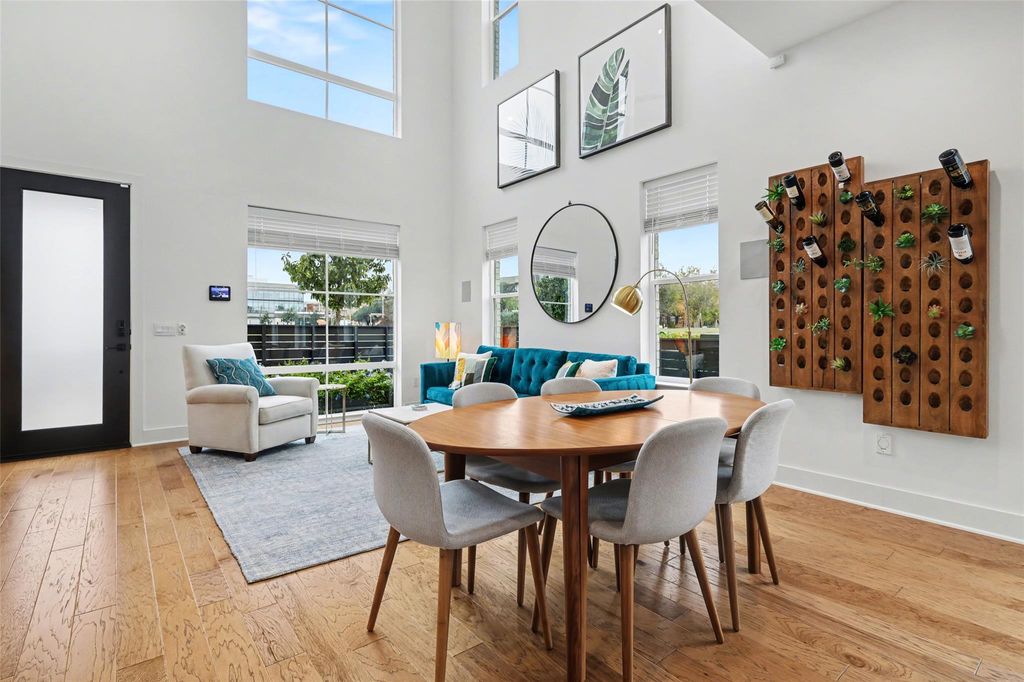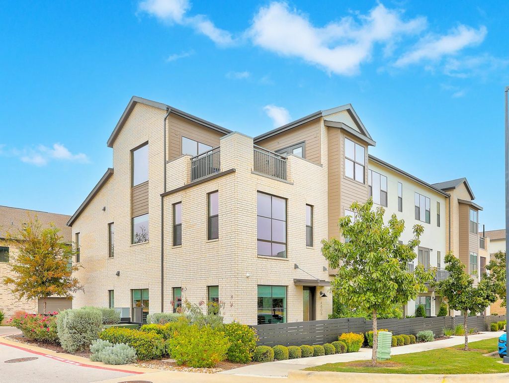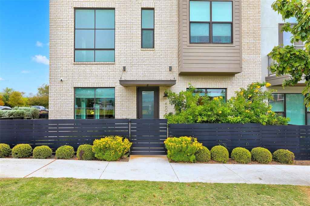 Impeccably maintained three-story brick condo in The Grove, filled with abundant natural light and offering a desirable end-unit location with both a fenced front yard and a rare side yard, a combination not often found in the community. This residence has been superbly cared for, shows like new, and offers a true lock-and-leave lifestyle paired with a two-car garage for everyday convenience. Inside, the home is thoughtfully designed with three distinct living areas, soaring ceilings, eight-foot doors throughout, high-end finishes, and beautiful hardwood floors that create a clean, modern, and elevated feel. The main level is anchored by a spacious primary suite with a luxurious ensuite bath, providing comfort and privacy, while the chef's kitchen opens seamlessly to the family room with dramatic ceiling height, making the space ideal for both refined entertaining and relaxed daily living. A well-placed half bath completes the main floor. The second level offers two generously sized bedrooms, each with its own full bath, along with an additional living area that works beautifully as a media room, lounge, or secondary gathering space. The third level adds exceptional flexibility, featuring an open area ideal for a home office, workout studio, or retreat, a large half bath, and direct access to an expansive terrace, perfect for unwinding, hosting guests, or enjoying quiet outdoor moments. Located within The Grove, a thoughtfully planned mixed-use community known for its architecture, curated dining, walkability, and green spaces, this home offers easy access to downtown Austin, The Domain, and major commuter routes. A rare opportunity to enjoy low-maintenance luxury living with privacy, flexibility, and timeless design in one of Austin's most desirable neighborhoods.