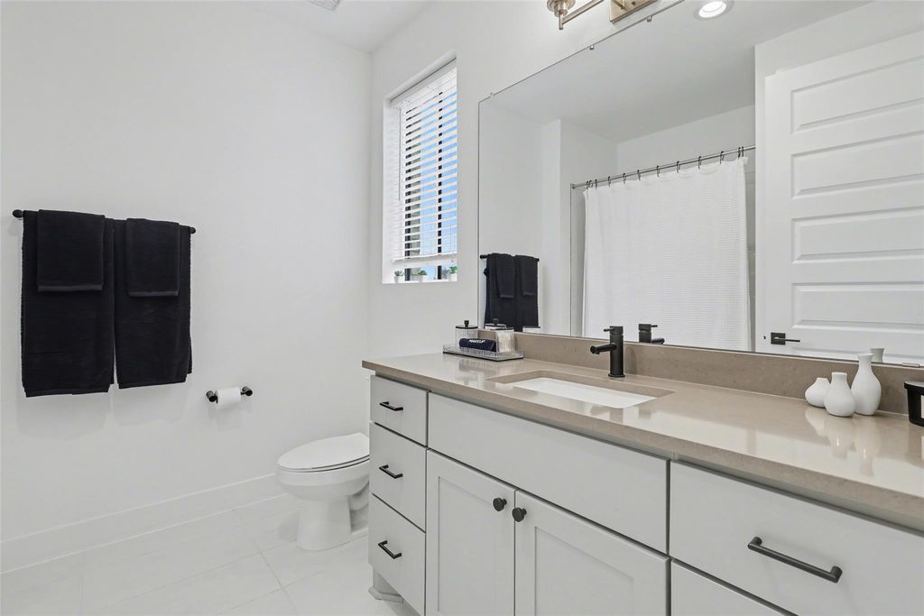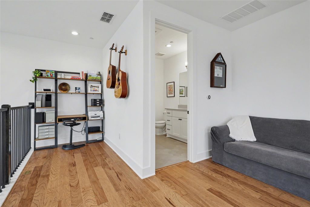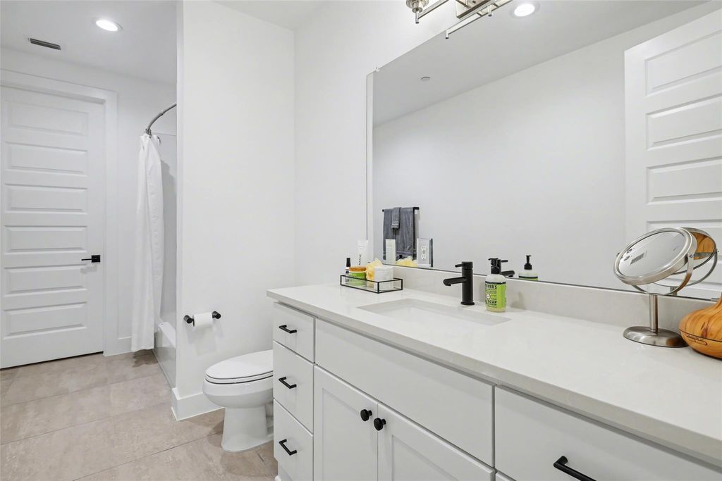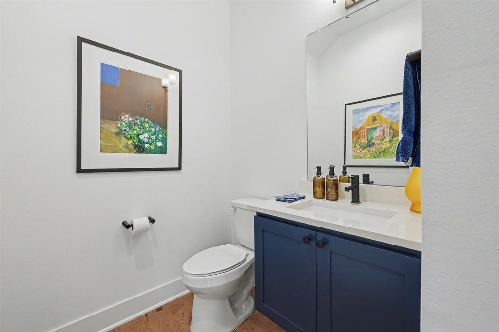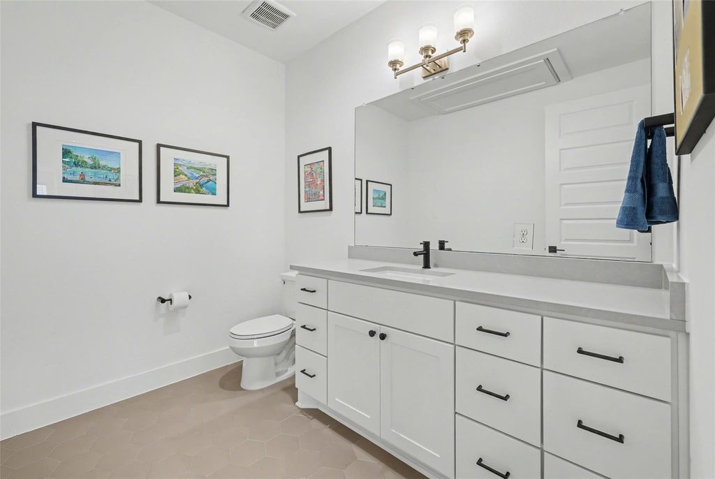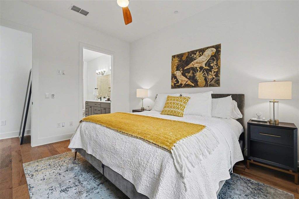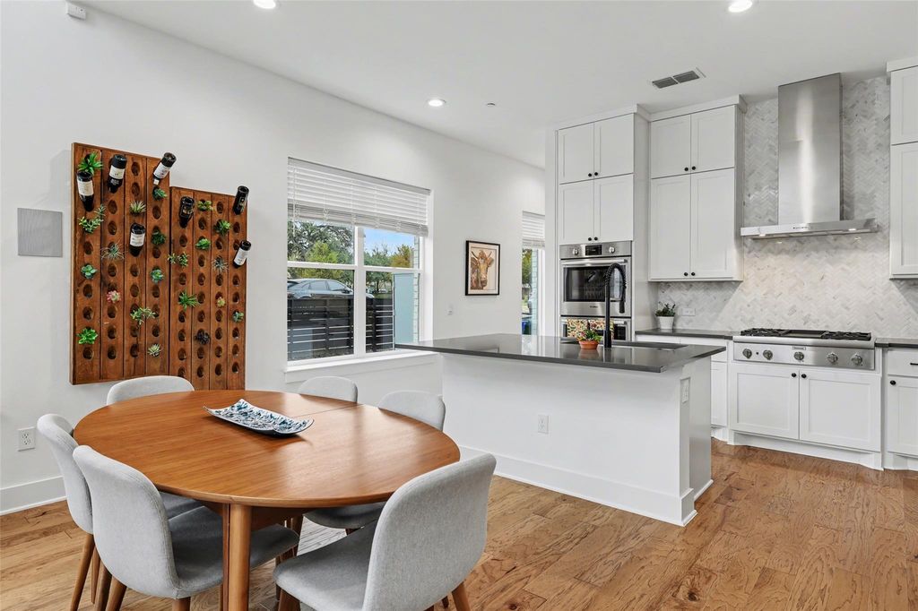Impeccably maintained three-story brick condo in The Grove, filled with abundant natural light and offering a desirable end-unit location with both a fenced front yard and a rare side yard, a combination not often found in the community. This residence has been superbly cared for, shows like new, and offers a true lock-and-leave lifestyle paired with a two-car garage for everyday convenience. Inside, the home is thoughtfully designed with three distinct living areas, soaring ceilings, eight-foot doors throughout, high-end finishes, and beautiful hardwood floors that create a clean, modern, and elevated feel. The main level is anchored by a spacious primary suite with a luxurious ensuite bath, providing comfort and privacy, while the chef's kitchen opens seamlessly to the family room with dramatic ceiling height, making the space ideal for both refined entertaining and relaxed daily living. A well-placed half bath completes the main floor. The second level offers two generously sized bedrooms, each with its own full bath, along with an additional living area that works beautifully as a media room, lounge, or secondary gathering space. The third level adds exceptional flexibility, featuring an open area ideal for a home office, workout studio, or retreat, a large half bath, and direct access to an expansive terrace, perfect for unwinding, hosting guests, or enjoying quiet outdoor moments. Located within The Grove, a thoughtfully planned mixed-use community known for its architecture, curated dining, walkability, and green spaces, this home offers easy access to downtown Austin, The Domain, and major commuter routes. A rare opportunity to enjoy low-maintenance luxury living with privacy, flexibility, and timeless design in one of Austin's most desirable neighborhoods.