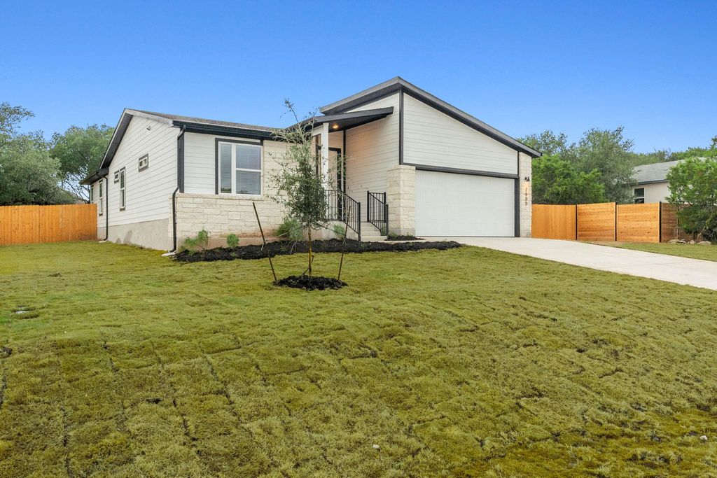 A stunning modern new construction home by Jackson Becker Communities builder, located in the beautiful community of Lago Vista, TX. This single-story residence is artfully designed with a sleek, modern elevation, providing a perfect blend of style and functionality. Step inside to discover a spacious open floor plan featuring four bedrooms and two bathrooms. The heart of this home is the great kitchen, showcasing a striking contrasting color island that serves as a focal point for culinary creativity and entertaining. The abundance of windows fills the home with natural light, creating a bright and airy ambiance. The primary suite offers a luxurious retreat with its walk-in shower, making it a perfect oasis for relaxation. The home has ample space for outdoor enjoyment and future landscaping dreams. Residents of this home can enjoy access to a range of premium community amenities, including city pool, golf course, gym, and tennis/pickleball courts. The property is also ideally positioned to take advantage of the picturesque lakefront, providing endless opportunities for recreation and enjoyment. There are no restrictions on the home as far as storing your boat or other recreational vehicle on your lot. Embrace the unique lifestyle and amenities that the Lago Vista community has to offer, and make this modern home your own. For more information, please contact your agent today.