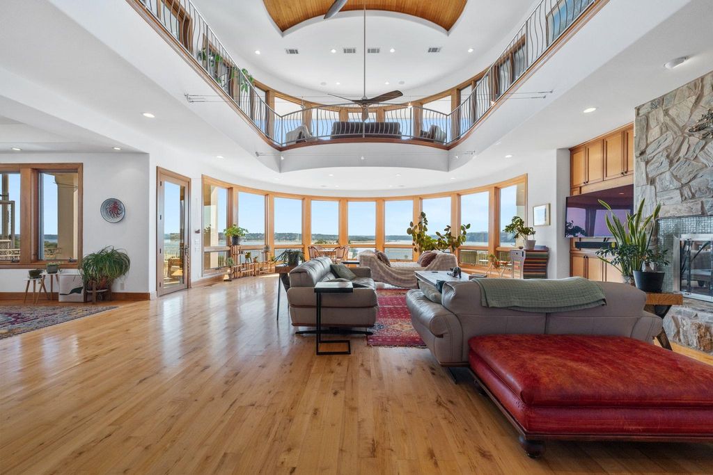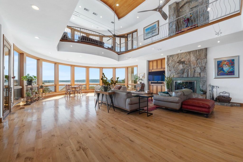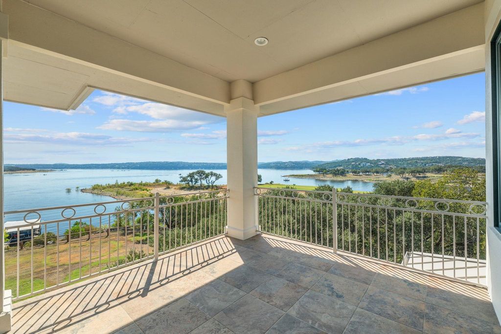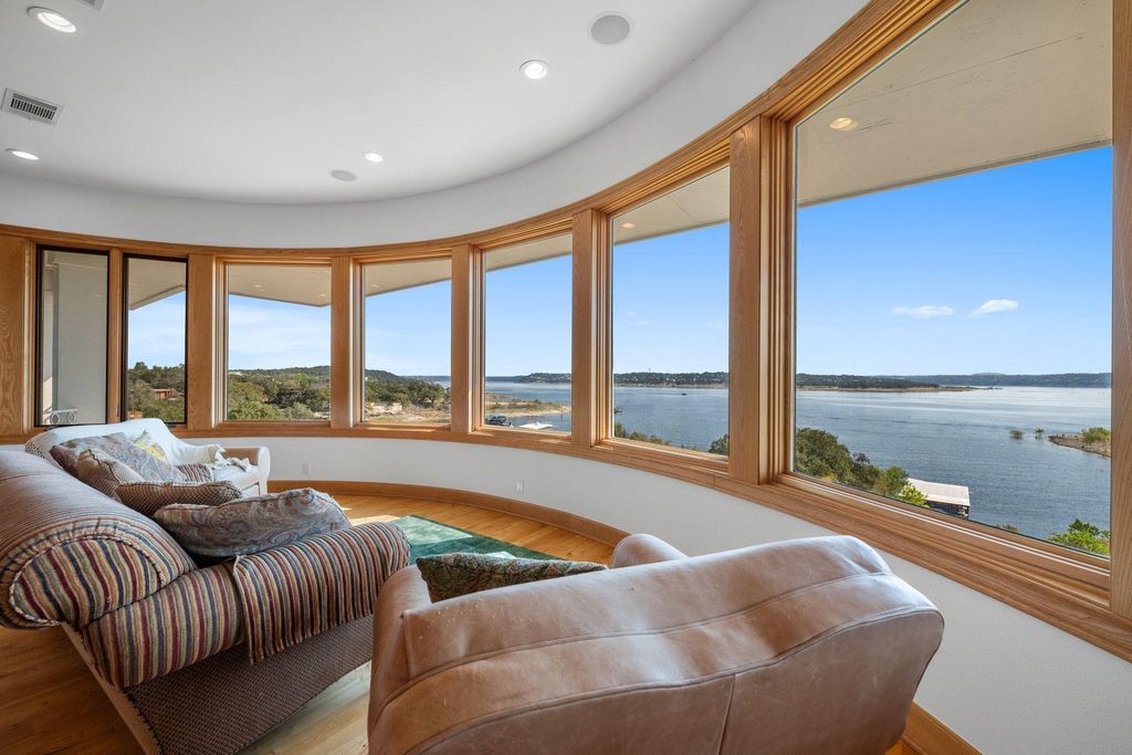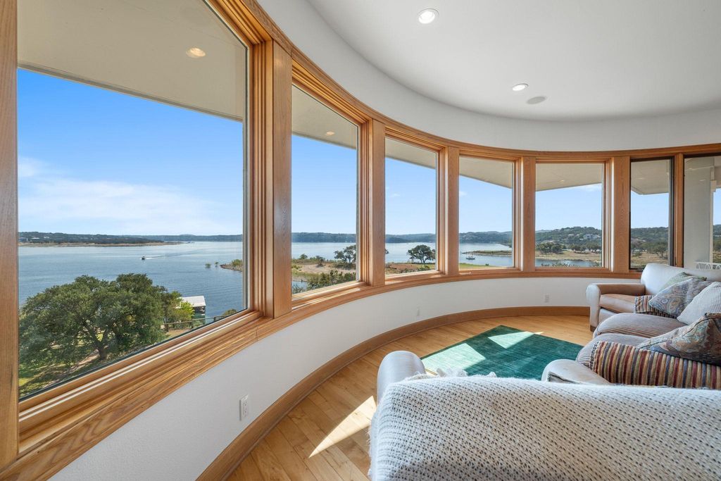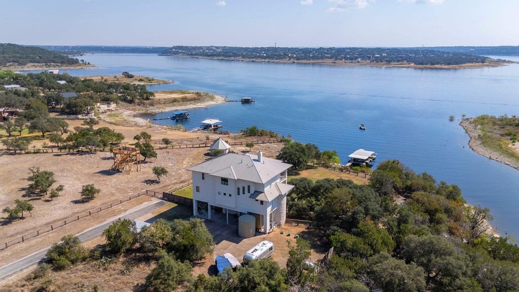 This exquisitely designed home on Lake Travis offers sweeping water and Hill Country views from its elevated perch on ~1.53 acres. The double-height living room amplifies the views through a rounded wall of windows that illuminate the open-concept floorplan with natural light. A stone fireplace anchors the space, while warm, hardwood floors and exposed timber ceilings create a refined yet relaxed ambiance perfect for both everyday living and entertaining. The kitchen boasts high-end stainless steel appliances and a generous center island where you can cook with a lake view. This level also features an ensuite bedroom, laundry, and a powder room for guests. On the upper level, there are three bedrooms, two with terrace access, as well as an additional sitting area which offers the highest elevation to take in the stunning vistas. Practical considerations include the attached 2-car garage and a smartly designed lift that reaches the second floor. Outside, enjoy an expansive covered porch, a true extension of the living space, that's ideal for morning coffee or evening stargazing thanks to the peaceful surroundings. The backyard oasis features a private boat dock for convenient water adventures. Designed with both comfort and style in mind, this home captures timeless elegance by honoring its natural setting in the Spicewood countryside. Tax and assessed values are estimates for illustration purposes only. All figures should be independently verified.