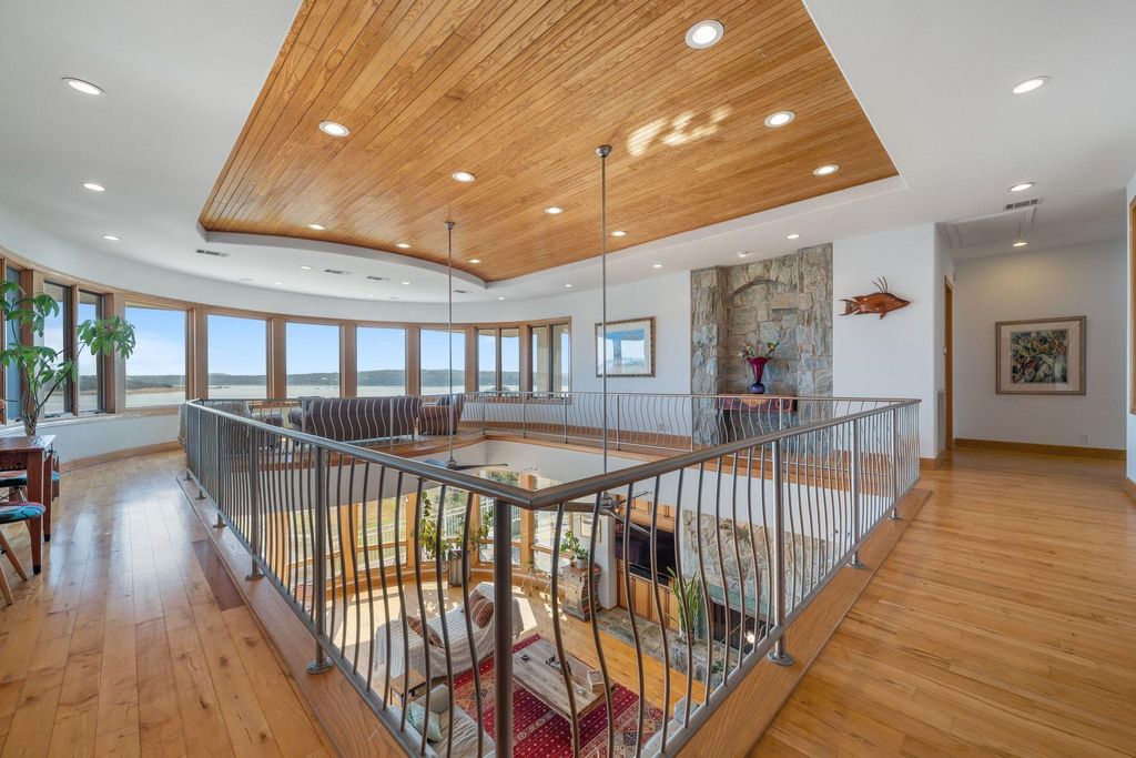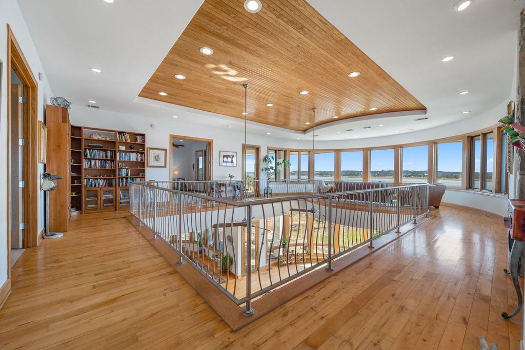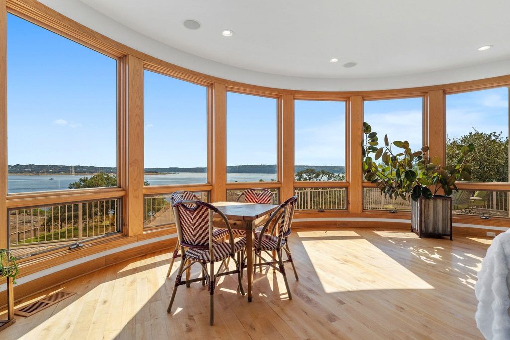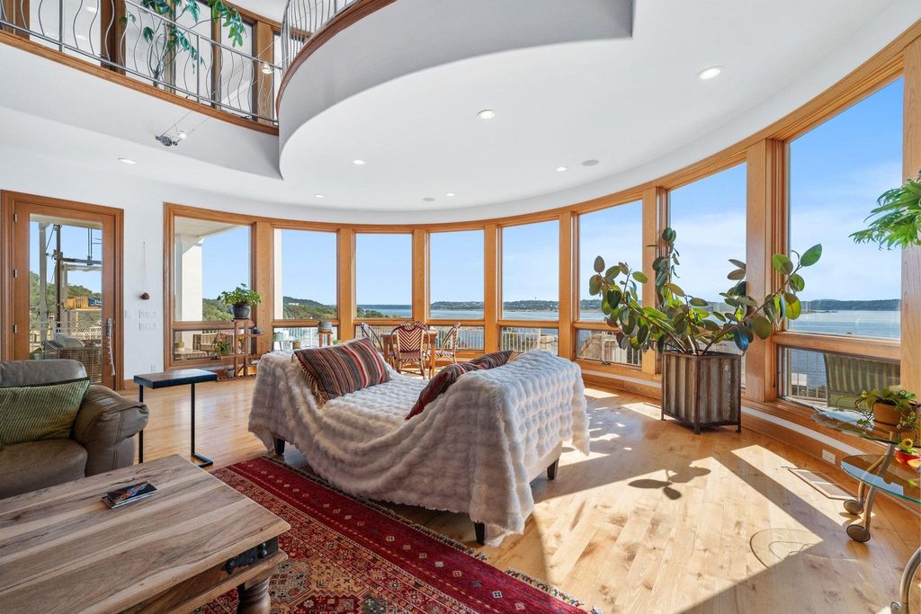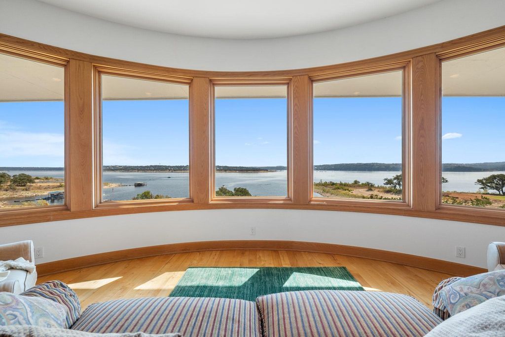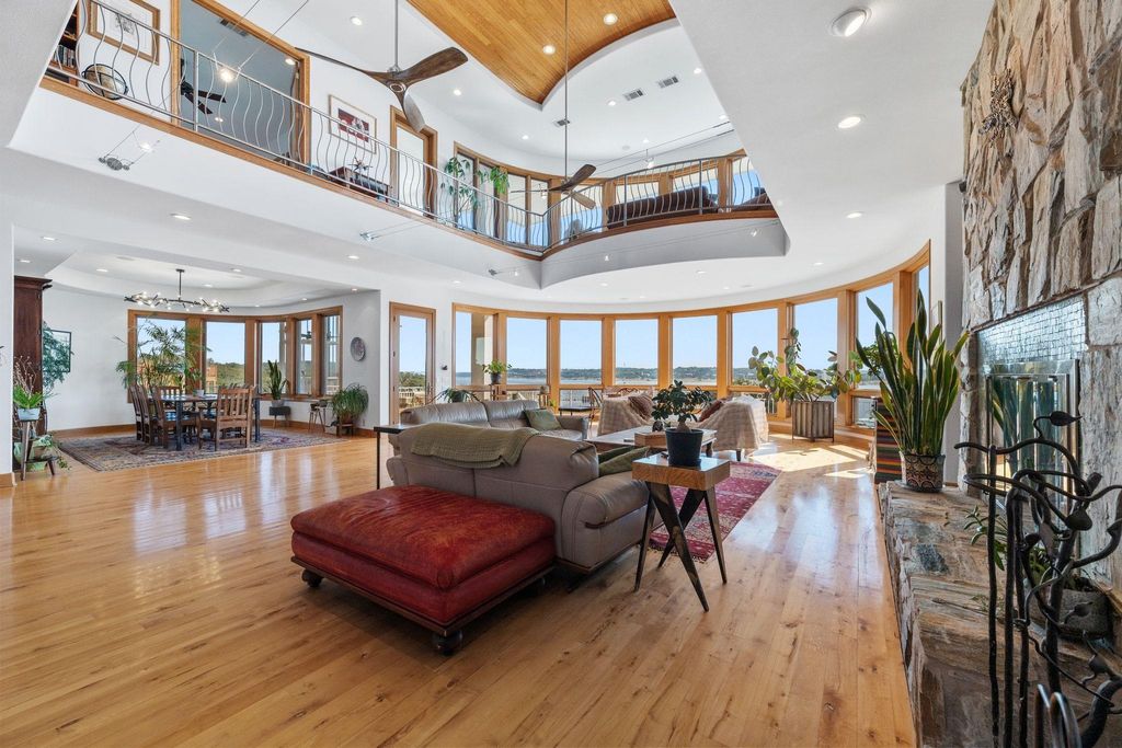 This exquisitely designed home on Lake Travis offers sweeping water and Hill Country views from its elevated perch on ~1.53 acres. The double-height living room amplifies the views through a rounded wall of windows that illuminate the open-concept floorplan with natural light. A stone fireplace anchors the space, while warm, hardwood floors and exposed timber ceilings create a refined yet relaxed ambiance perfect for both everyday living and entertaining. The kitchen boasts high-end stainless steel appliances and a generous center island where you can cook with a lake view. This level also features an ensuite bedroom, laundry, and a powder room for guests. On the upper level, there are three bedrooms, two with terrace access, as well as an additional sitting area which offers the highest elevation to take in the stunning vistas. Practical considerations include the attached 2-car garage and a smartly designed lift that reaches the second floor. Outside, enjoy an expansive covered porch, a true extension of the living space, that's ideal for morning coffee or evening stargazing thanks to the peaceful surroundings. The backyard oasis features a private boat dock for convenient water adventures. Designed with both comfort and style in mind, this home captures timeless elegance by honoring its natural setting in the Spicewood countryside. Tax and assessed values are estimates for illustration purposes only. All figures should be independently verified.