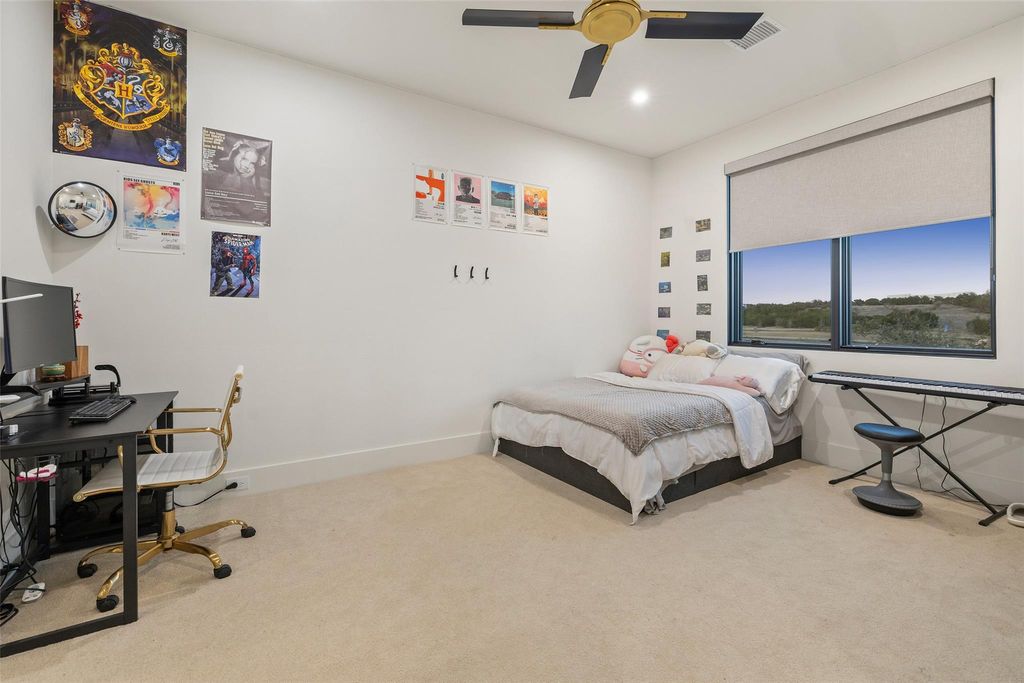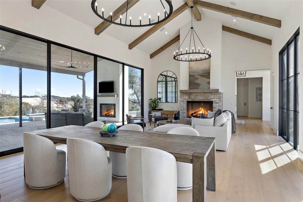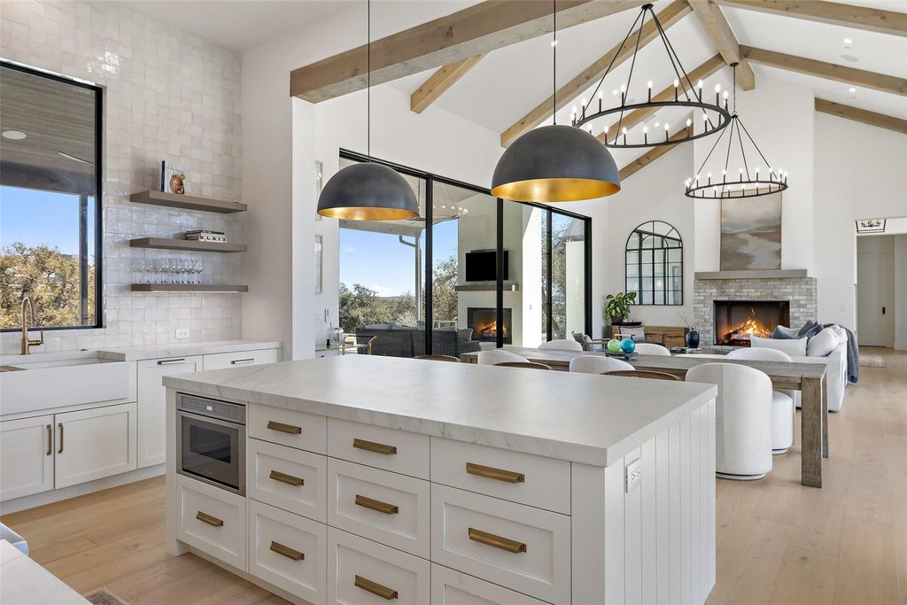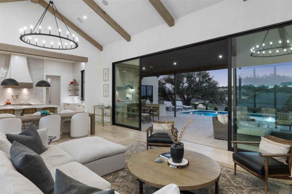 Tucked away in the exclusive gated community of Madrone Canyon, this 4,749-square-foot custom estate by Sendero is a seamless blend of modern luxury and Hill Country charm. Just minutes from the Hill Country Galleria, your new home offers an unparalleled lifestyle. Step inside to soaring arched ceilings adorned with driftwood-style beams, where natural light dances across wide-plank white oak floors. A 24-foot sliding glass wall seamlessly blends indoors and out, inviting fresh breezes inside. The gorgeous double kitchen is a chef's dream, designed for both function and beauty. Gather around the oversized island, flanked by porcelain countertops, Thermador appliances, and three dishwashers designed for effortless entertaining. Purified softened water flows from every faucet providing an abundance of crisp, clear drinking water. The primary suite is a true sanctuary, with a massive indoor/outdoor shower with steam unit - perfect for tranquil mornings or candlelit evenings. A deep soaking tub is perfectly positioned for breathtaking Hill Country views, turning your nightly unwind into a ritual of indulgence. With five bedrooms plus a dedicated office, four and a half baths, and walk-in closets, this home effortlessly balances space and intimacy. A movie theater and upstairs game room provide endless entertainment, while high-end designer touches such as custom wallpaper and tile accents bathrooms lend personality and elegance. Step outside to your fully fenced backyard oasis, where a heated pool and spa sparkle under the Texas sun. Fire up the grill in the outdoor kitchen, sip wine by the pool, or simply listen to the whispering oaks as the day fades to dusk. The paved driveway and oversized three-car garage, with its epoxy flooring and extra storage, welcomes you home with function and style. With its blend of privacy, sophistication, and Hill Country beauty, this estate is more than a home"”it's a lifestyle.