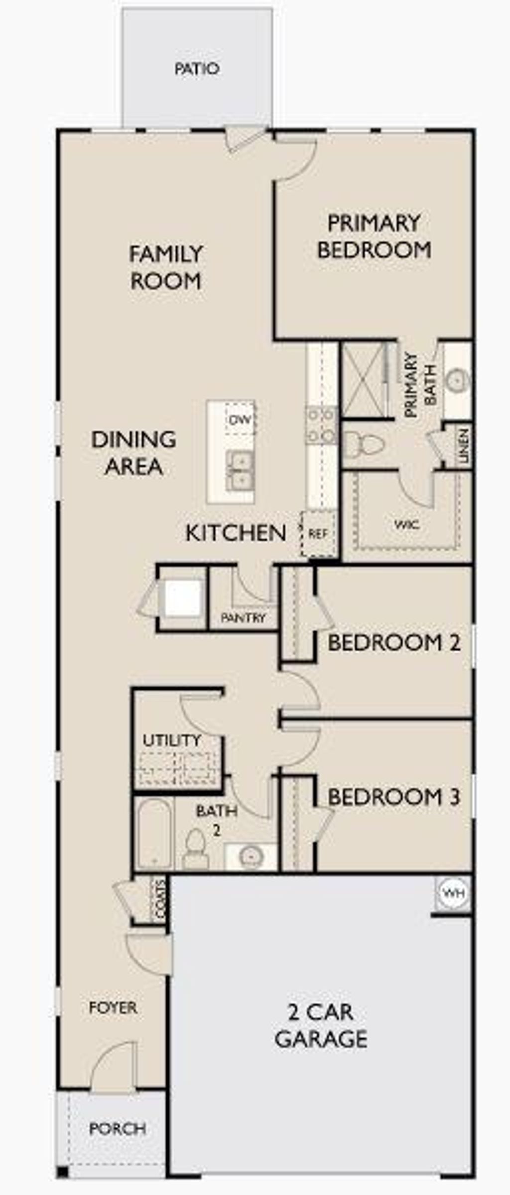 Enter through the front porch into a foyer with two bedrooms and a full bath located near the front of the home. The laundry room and coat closet are also accessible from this hallway. At the center of the home, the kitchen opens to the dining area and great room, creating a spacious main living space. Toward the back, the primary bedroom features a walk-in closet and a primary bath. A patio is accessible through the great room, and the two-car garage connects to the home through a hallway near the foyer. **3.49% Fixed Rate and up to $8,000 closing costs *Promotional rates and contributions are subject to change, contact Sales Consultant for details.**