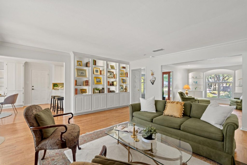 This 3-bedroom, 2-bath single-story home sits in the peaceful Highland Oaks community, where streets are lined with mature trees and the setting feels tucked away yet close to everything Austin offers. Inside, the layout is thoughtful and flexible with both formal living and dining rooms as well as an open main living area that combines the family room, kitchen, and casual dining. The kitchen is designed to impress with Elan cabinets reaching the ceiling, two hidden appliance garages, granite counters, and smart storage solutions that make the space both functional and uncluttered. The primary suite includes its own ensuite bath, while two secondary bedrooms offer versatility, one featuring a queen-size Murphy bed that folds neatly into built-in shelving. Storage is a theme throughout the home, with built-ins and custom cabinetry that keep everything tidy while adding character. But what makes this property truly unforgettable is its outdoor living. The front yard is its own showcase, with native landscaping, rock pathways, and artistic details that make it stand out from the rest. Step into the backyard and you'll find multiple outdoor living spaces, including a covered patio and shady sitting areas that invite you to linger. And then there's the mural, stretching across the back yard and blending seamlessly with the trees above, it creates the illusion of your own private nature preserve. Bronze herons peek over stonework, fountains trickle, and the garden's layered design makes the yard feel magical, like a living work of art. This home is not just a place to live but an experience"” unique, artistic, and designed to surprise at every turn. Walk to award-winning Doss Elem. and minutes from parks, trails, Great Hills CC, UT, the Tech Corridor, and Lake Austin. With quick access to Mopac, the best of Austin is always close by. A home as unique as Austin itself; It's magical and completely unforgettable! Buyer to verify all info.