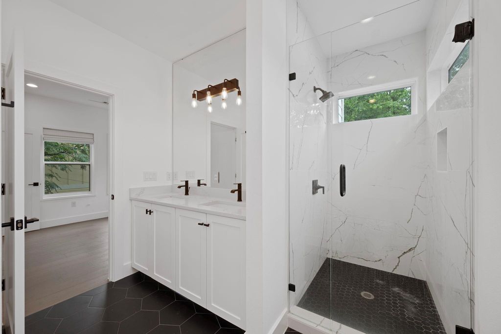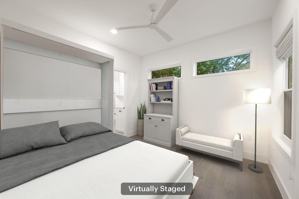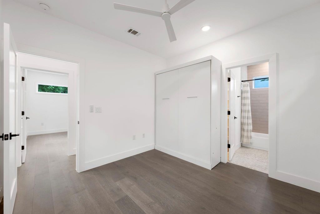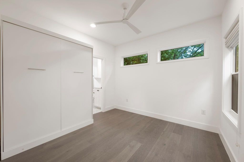 Experience the perfect blend of privacy, style, and efficiency in this beautifully designed home filled with natural light and artistic window placements. Tucked away from the road, this residence offers a serene setting conveniently located near N Lamar Blvd and Burnet Rd. Enjoy the best of both worlds with a private driveway, low-maintenance yard, and a peaceful atmosphere that feels like a secluded treehouse - but with NO HOA dues or onerous rules! Inside, the open layout makes exceptional use of space, featuring sleek hardwood flooring, abundant storage, and high-end finishes throughout. The kitchen is both functional and elegant, showcasing a premium countertop, modern drawer-style microwave, and a stylish chandelier illuminating the living space. Ceiling fans are minimalist and modern, complementing the refined interior. Bamboo-style curtains add an artistic touch throughout the home. Upstairs, both spacious bedrooms boast ensuite baths and walk-in closets. The primary suite includes dual vanities and a stunning walk-in shower with floor-to-ceiling tile and high privacy windows that flood the space with natural light. The secondary bedroom features a queen Murphy bed for versatility in addition to its own private full bath. A half bath is located on the main level for guests' convenience. Outdoor living is effortless with shaded trees, a private yard, and an extended driveway capable of accommodating multiple vehicles. The attached one-car garage offers protection from the elements. With a sophisticated black-and-white exterior, this home is as practical as it is beautiful"”ideal for those seeking comfort, privacy, and a modern aesthetic in a friendly, well-connected neighborhood.