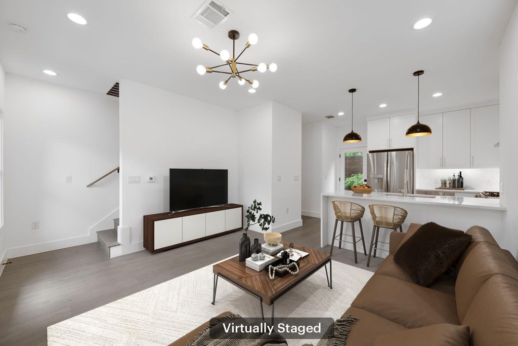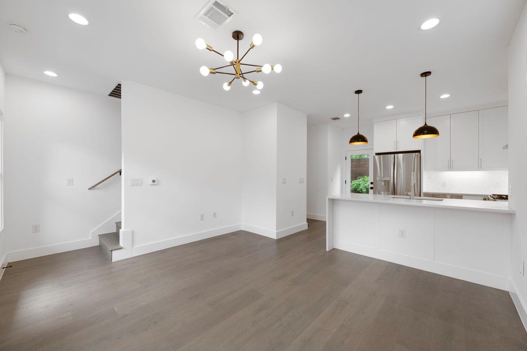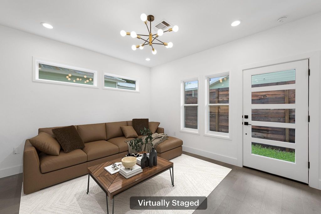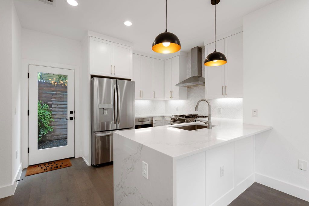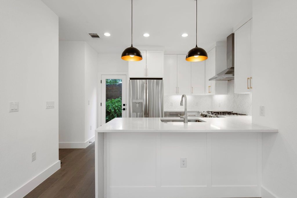 Experience the perfect blend of privacy, style, and efficiency in this beautifully designed home filled with natural light and artistic window placements. Tucked away from the road, this residence offers a serene setting conveniently located near N Lamar Blvd and Burnet Rd. Enjoy the best of both worlds with a private driveway, low-maintenance yard, and a peaceful atmosphere that feels like a secluded treehouse - but with NO HOA dues or onerous rules! Inside, the open layout makes exceptional use of space, featuring sleek hardwood flooring, abundant storage, and high-end finishes throughout. The kitchen is both functional and elegant, showcasing a premium countertop, modern drawer-style microwave, and a stylish chandelier illuminating the living space. Ceiling fans are minimalist and modern, complementing the refined interior. Bamboo-style curtains add an artistic touch throughout the home. Upstairs, both spacious bedrooms boast ensuite baths and walk-in closets. The primary suite includes dual vanities and a stunning walk-in shower with floor-to-ceiling tile and high privacy windows that flood the space with natural light. The secondary bedroom features a queen Murphy bed for versatility in addition to its own private full bath. A half bath is located on the main level for guests' convenience. Outdoor living is effortless with shaded trees, a private yard, and an extended driveway capable of accommodating multiple vehicles. The attached one-car garage offers protection from the elements. With a sophisticated black-and-white exterior, this home is as practical as it is beautiful"”ideal for those seeking comfort, privacy, and a modern aesthetic in a friendly, well-connected neighborhood.