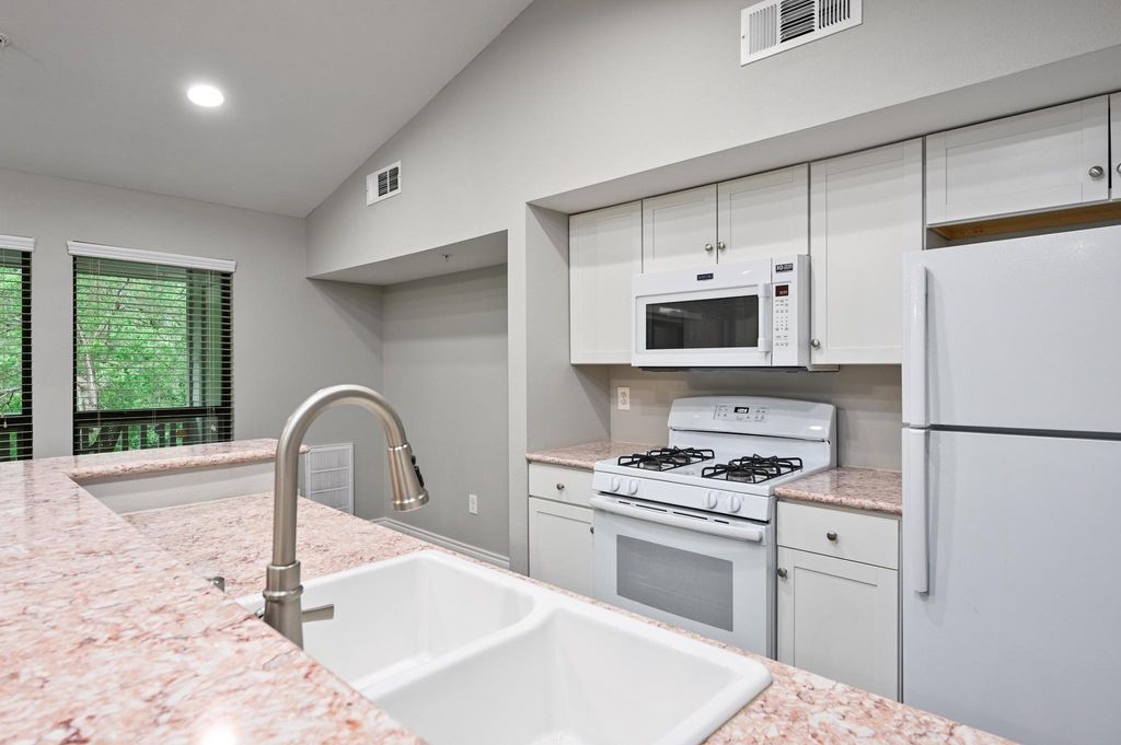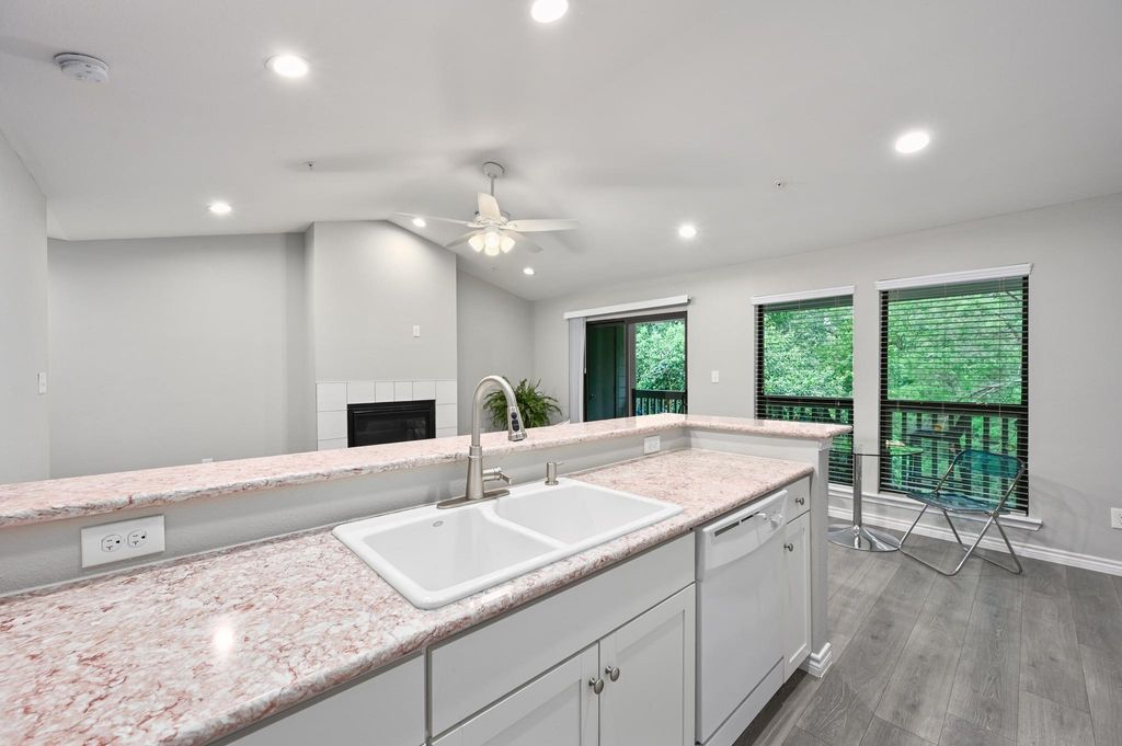 The best kept secret in Austin, the Dry Creek condos are in a fabulous central location with some of the most beautiful woodland views. This building was newly constructed and finished 7 years ago. The open floor plan has a lovely fireplace and high ceilings letting filtered light in to brighten the unit. A spacious deck off the living room makes the perfect place to enjoy morning coffee or just watch nature at its finest. You will feel as if you are living in a tree house. The owners recently added recessed lighting, luxury vinyl plank flooring and freshly painted this beautiful unit. A stack washer/dryer and the refrigerator in the kitchen convey. There is one reserved parking spot and one unassigned spot, but plenty of visitor parking. Two lovely gated swimming pools provide nice spots to relax and cool off. Conventional and FHA financing available. The location in the heart of old Austin couldn't be better with quick access into Downtown Austin, the Arboretum or the Domain. The shuttle bus to the University of Texas stops less then 2 miles away. Close to shopping, grocery, restaurants, cleaners, public library, and opportunities to hike and bike. This condo is a real gem!