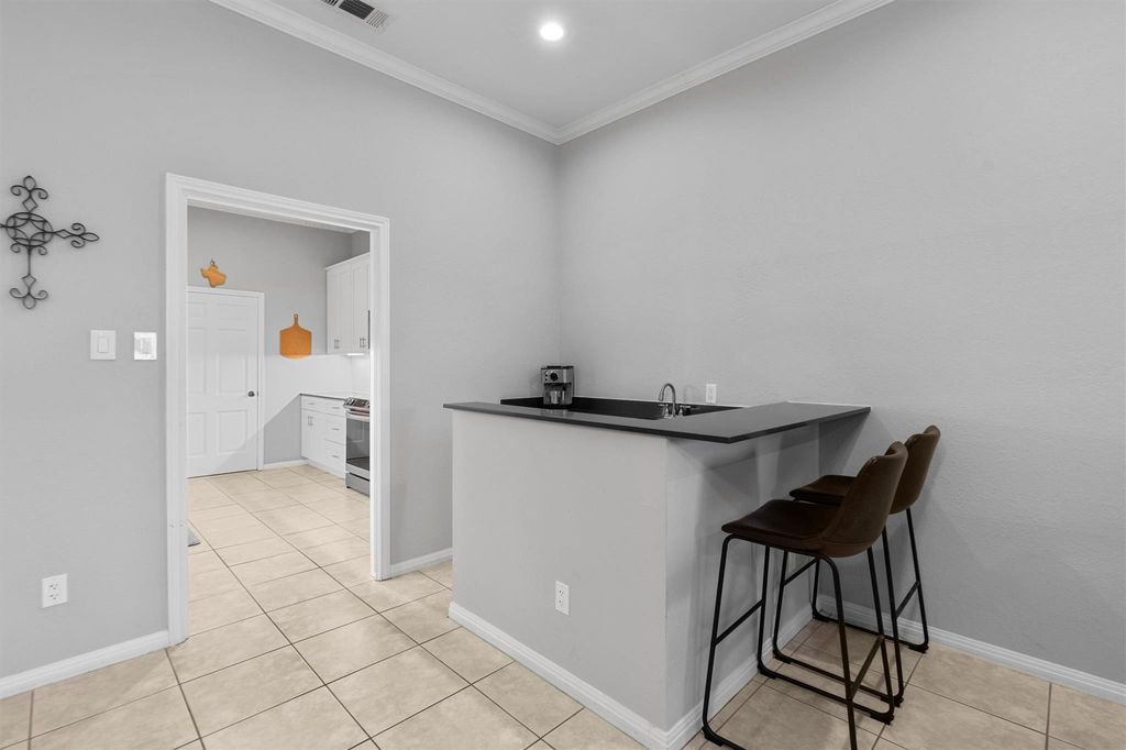 This updated home features 10-foot ceilings, an open floorplan, numerous updates, and an attached 2-car garage. Enter through a private, covered, front patio area and step into an expansive living area with a fireplace, dual eating areas, and a coffee bar. Off of the living area are 3 bedrooms, a flex space and 2 large walk-in closets. There is additional storage in the attic with 8-feet of vertical space. Updates include a fully remodeld kitchen with 42-inch cabinets and quartz countertops, partially updated bathrooms, a new roof in 2020 and a fully replace HVAC system. Very low HOA dues include lawn care and water. The home is located just a block from the Onion Creek golf course and quiet streets to enjoy walks!