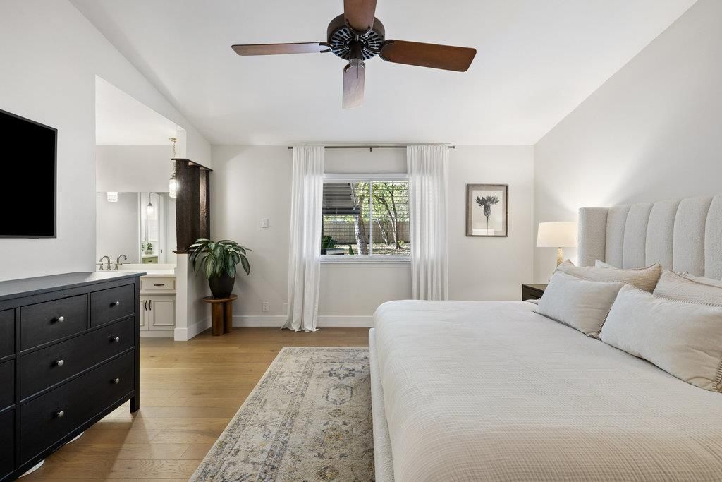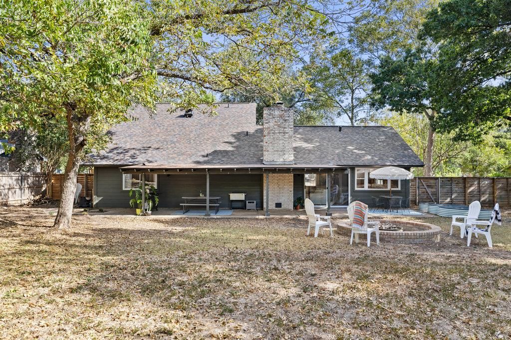 A quiet treasure in South Austin, where majestic tree-lined streets and expansive lots create a timeless neighborhood charm. This beautiful two-story single-family home features four spacious bedrooms and two full bathrooms. The primary suite is conveniently located on the first floor and boasts a vaulted ceiling, walk-in closet, and en-suite bathroom for added comfort. The home offers an inviting layout with recessed lighting, a large living room with vaulted ceilings, a cozy fireplace, and sliding doors leading to the backyard "” all perfect for entertaining. The kitchen is equipped with stainless steel appliances and ample cabinet space, making it ideal for everyday living. The large dining area provides additional space for gatherings. Enjoy the outdoors on the covered front and back patios, overlooking a spacious backyard shaded by mature trees. This home perfectly combines style, comfort, and functionality in a serene setting.