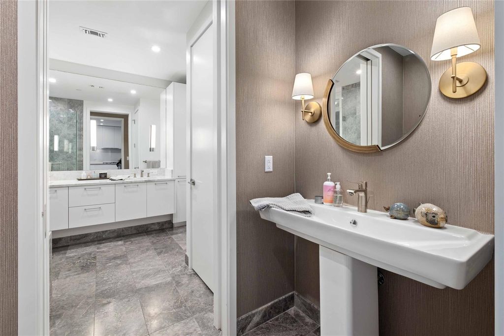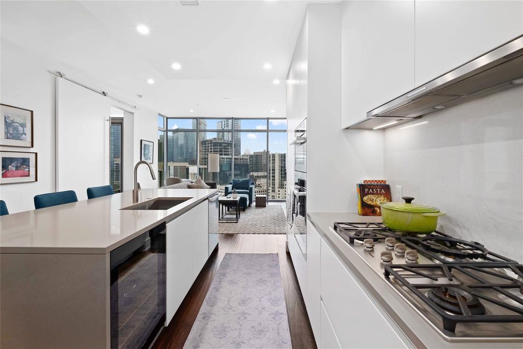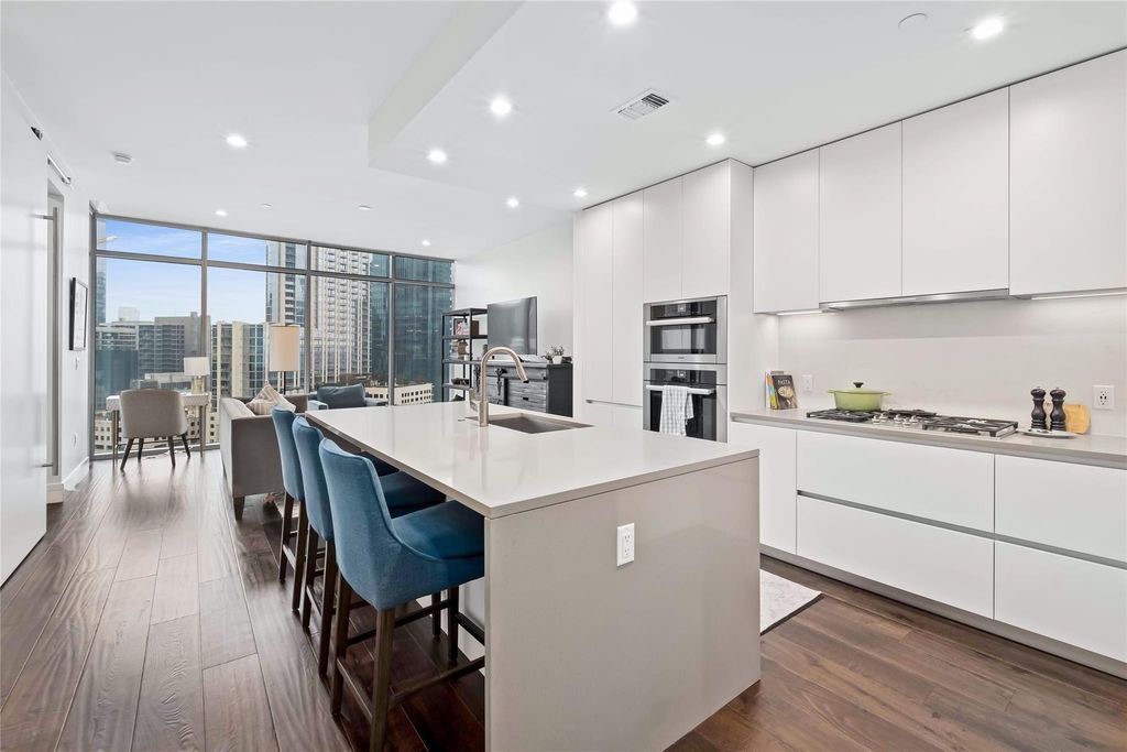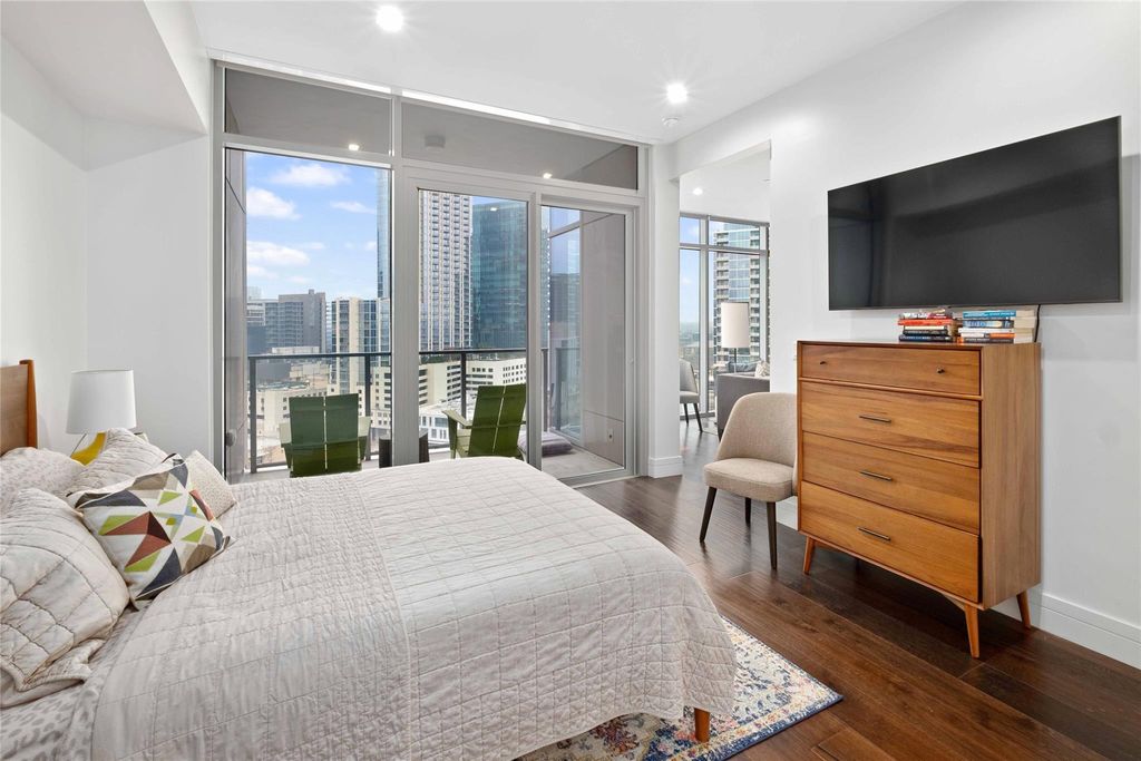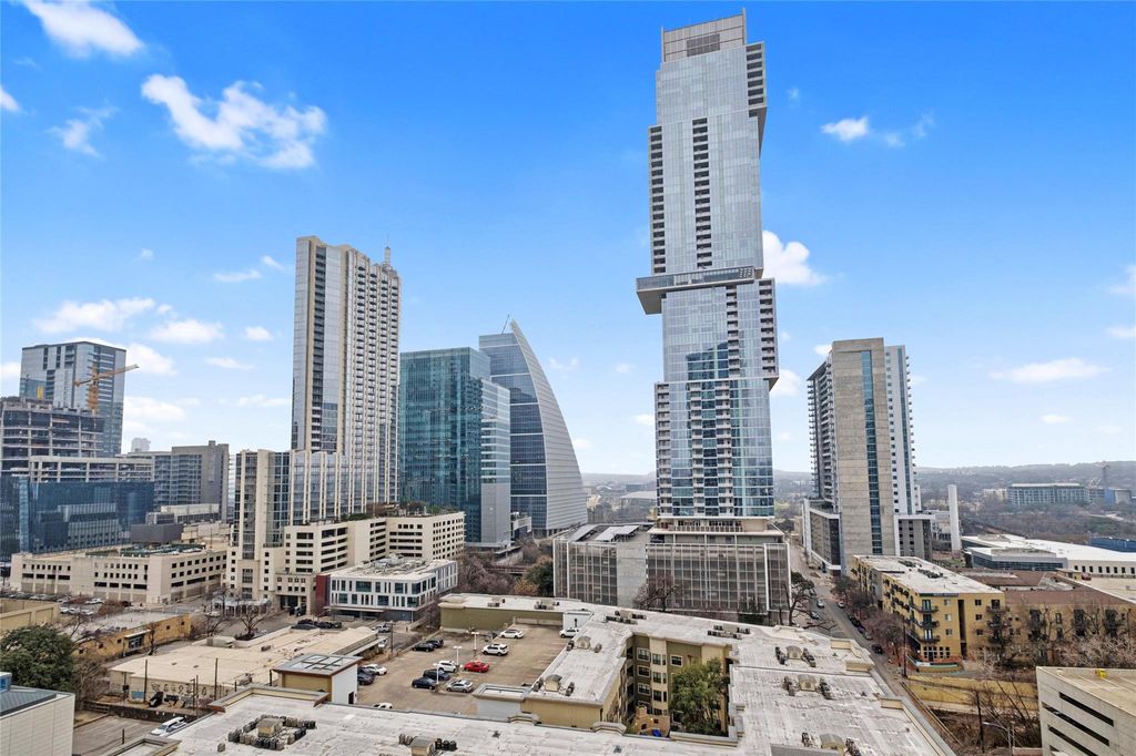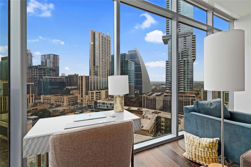 Welcome home to a luxury, light-filled space above Downtown Austin's Market District at Fifth & West Residences. With southeastern views overlooking Austin's dynamic cityscape, you can enjoy the natural beauty of Austin while living in the center of it all. The thoughtfully designed kitchen includes flat-front, Italkraft cabinetry, stainless-steel Miele appliances, quartz-topped island with a waterfall edge and breakfast bar seating. The luxurious appliance package includes double ovens, a built-in wine refrigerator, 5-burner gas cooktop and 36" counter depth refrigerator. The owner's suite is an escape from your busy life and comes complete with blackout shades and an oversized walk-in closet with custom Italian built ins. The marble-clad floors and floating vanity play off the frameless glass shower in your serene full bathroom, which features a pocket door separating the water closet and third vanity, creating the feeling of an additional half bath. Step out onto your private terrace for fresh air and sunset views overlooking Austin. Walls of glass and 9 ft+ ceilings make this 1-bedroom/1.25-bathroom residence feel even more spacious. Dedicated storage, parking for one compact car, keyless entry, and smart home automation complete the picture. Fifth & West reframes the art of living downtown with striking residences, effortless ownership, and a perfect downtown location. Tax and assessed values are estimates for illustration purposes only. All figures should be independently verified. Call or text listing agent to schedule a private showing.