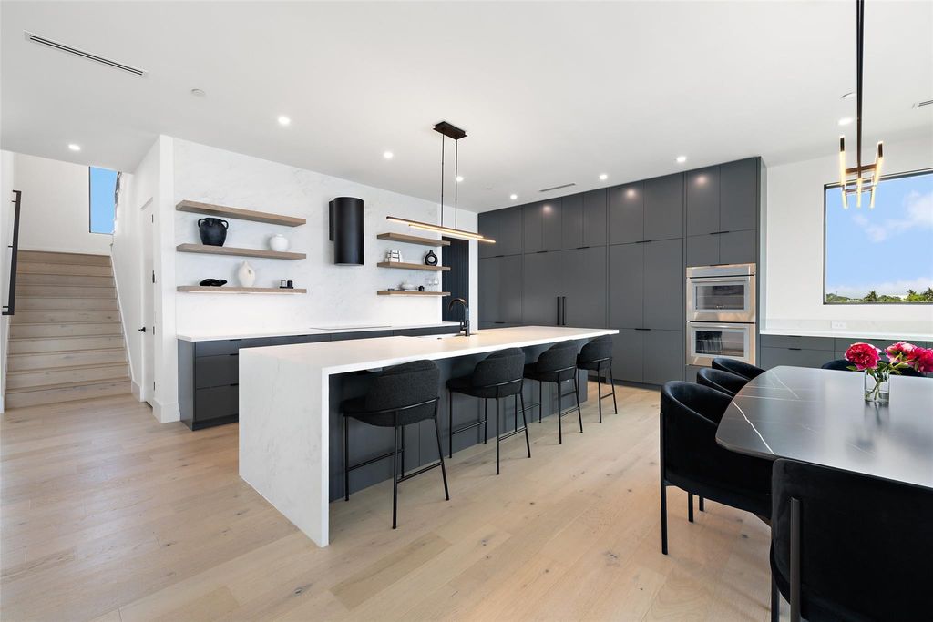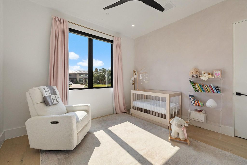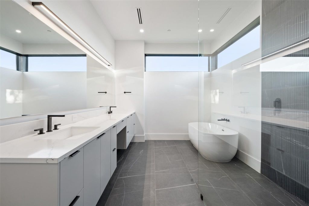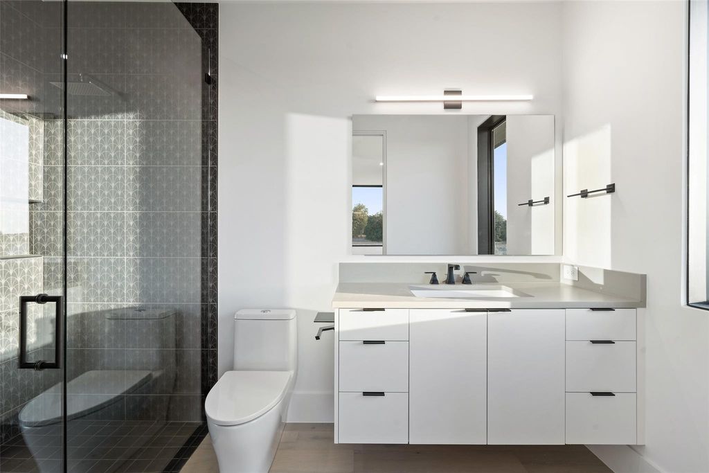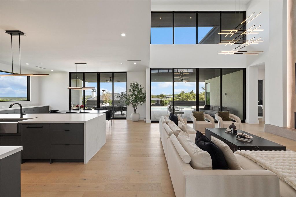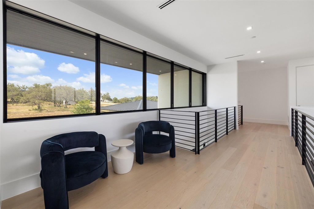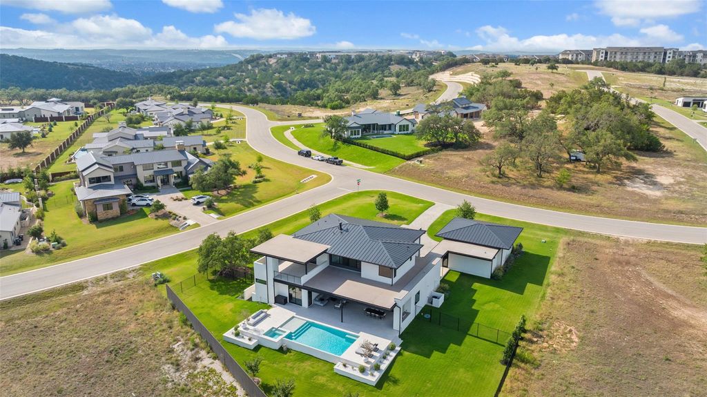 Modern luxury meets elevated lifestyle in this turnkey five-bedroom home in the gated enclave of Madrone Canyon. Completed in 2024 by Sendero Homes-one of Austin's most exclusive custom builders-this private corner-lot residence offers panoramic Hill Country views, high-end finishes, and a full suite of luxury amenities including a dedicated office, home cinema, and commercial-grade gym. Designed for seamless indoor-outdoor living, the home features a resort-style heated saltwater pool and spa, framed by Italian porcelain tile and surrounded by lush garden landscaping, with a south-facing orientation for full sun throughout the day. Inside, the heart of the home is a chef's kitchen with an island measuring over 12 feet long, high-end Thermador appliances, and a full butler's pantry. Soaring 20+ foot ceilings and walls of glass create a bright and open main living area, while all five bedrooms include ensuite bathrooms and motorized blackout shades. The dedicated office space is built out with custom finishes for true work-from-home comfort. Additional features include a fully equipped home cinema, a $50K commercial-grade gym in the oversized 3-car garage, a whole-home water softener and filtration system, and a full security setup with door sensors, alarm, and perimeter cameras. Located just five minutes from the Hill Country Galleria and 10 minutes to Lake Travis and a private marina.