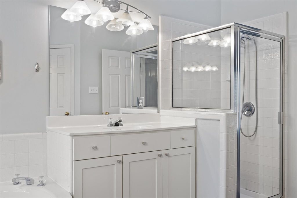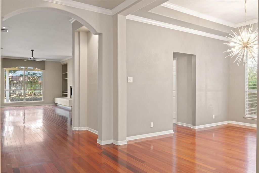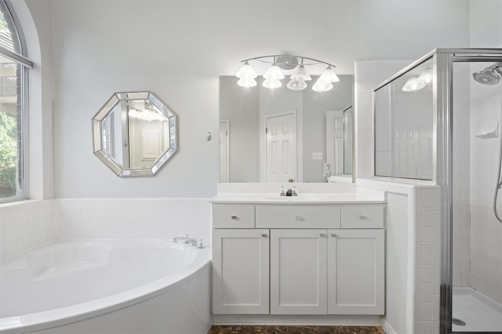 Set on a shaded corner lot in the sought-after Legend Oaks community, this inviting single-story home offers 4 bedrooms, 2 baths, and 2,359 sq. ft. of open, light-filled living space. Beautiful wood flooring flows through the main areas, complemented by high ceilings and classic finishes. The kitchen opens seamlessly to the living and dining areas, creating a natural space for gatherings. The spacious primary suite features a walk-in closet, soaking tub, and separate shower, while the secondary bedrooms provide flexibility for guests or a home office. Step outside to a large covered patio and private backyard framed by mature trees, ideal for outdoor entertaining or quiet evenings at home. Enjoy a two-car garage, excellent curb appeal, and a prime location near shopping, dining, and major thoroughfares.