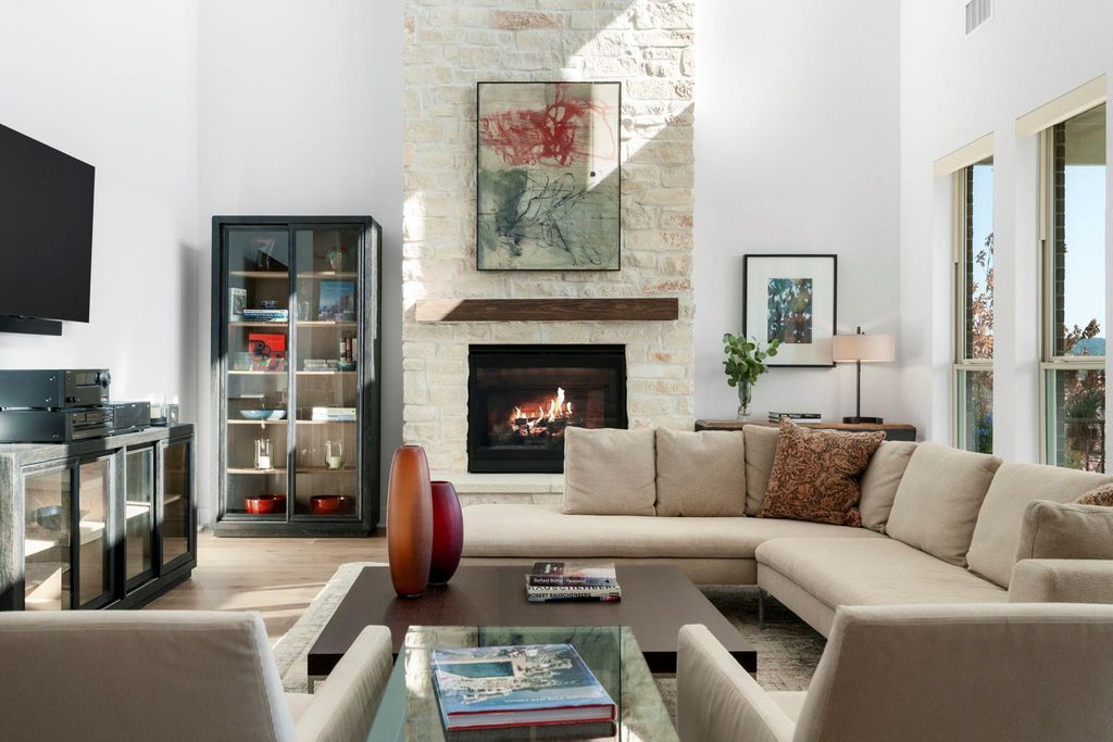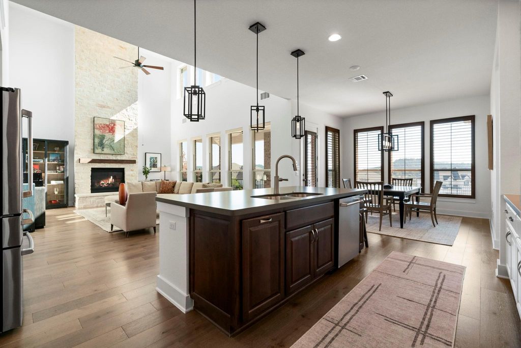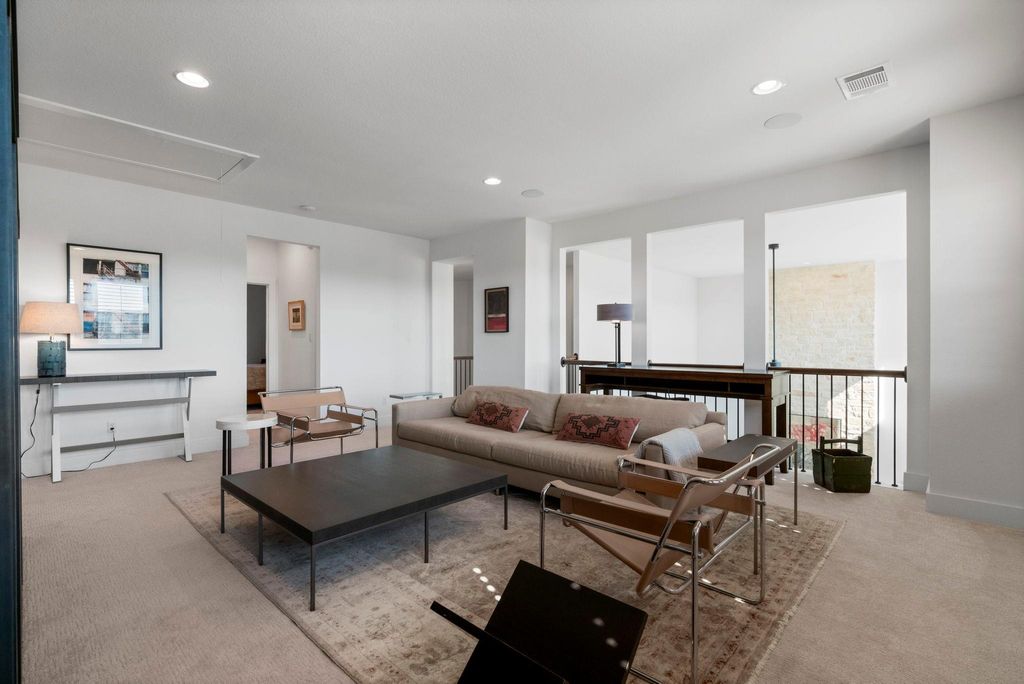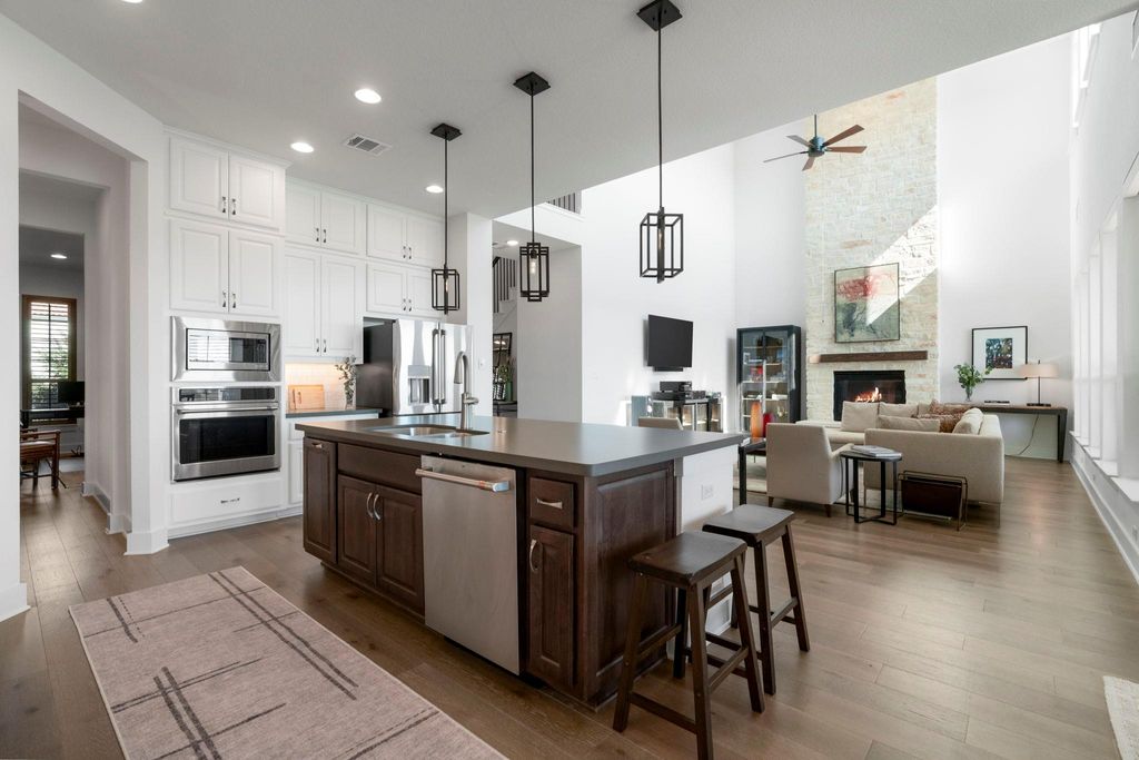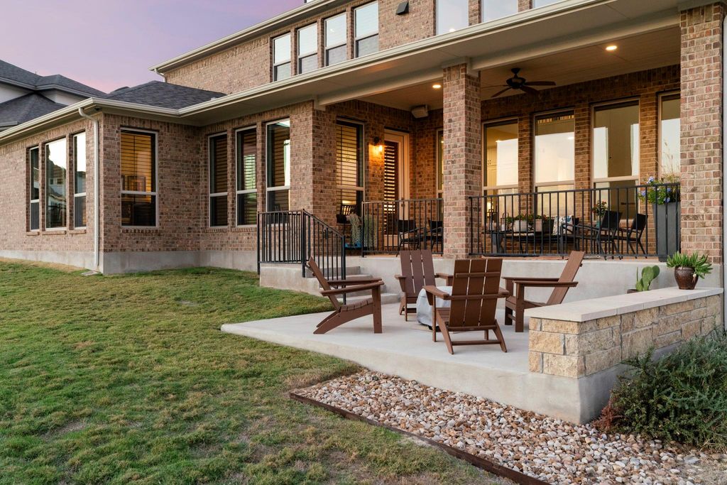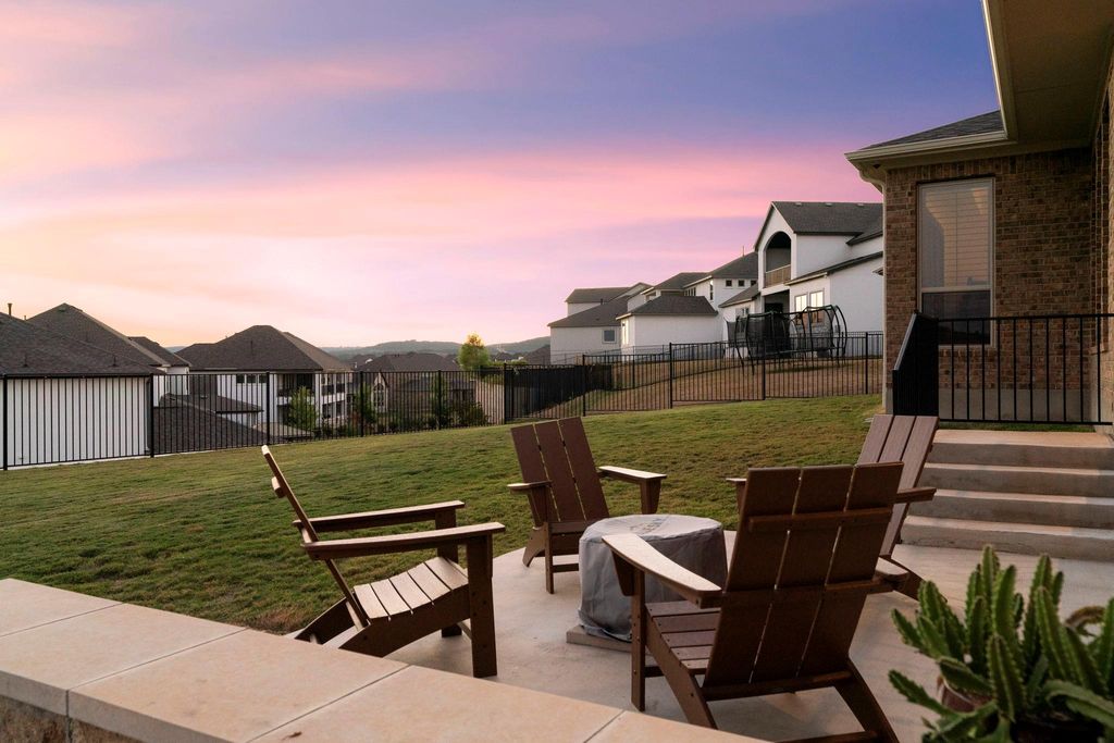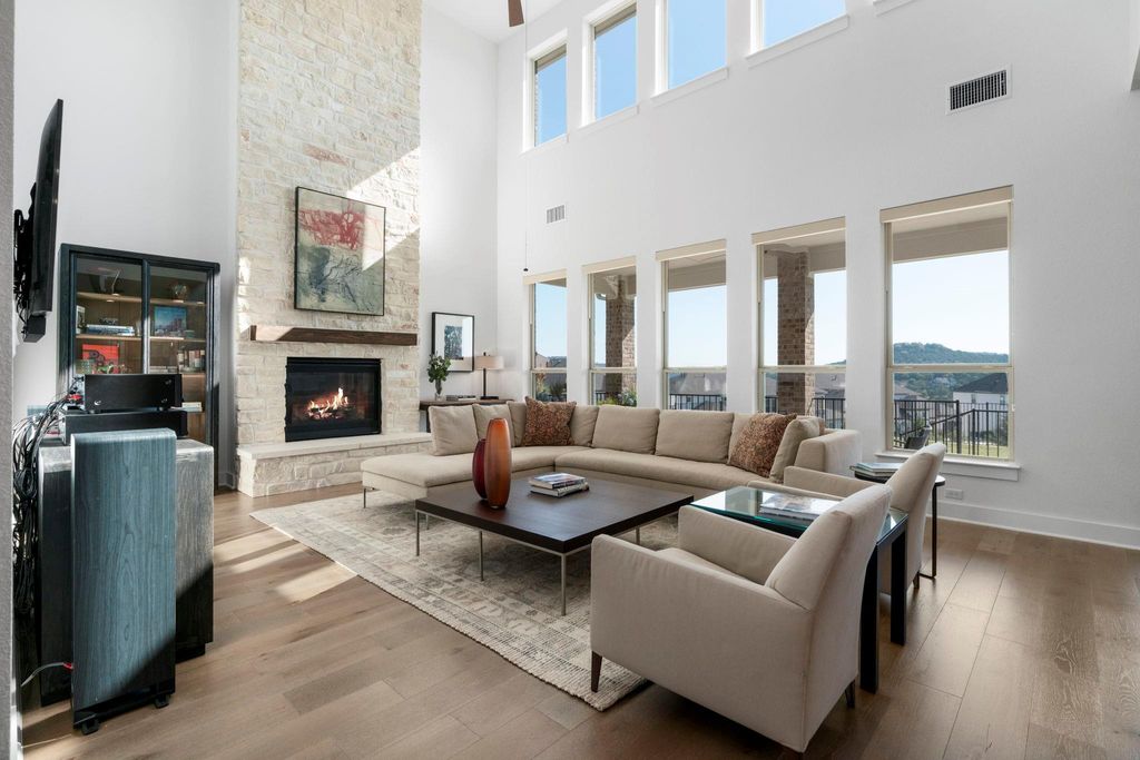 Discover this exceptional 6-bed/4.5-bath luxury home in the coveted Travisso community - combining extensive upgrades with immaculate maintenance and thoughtful design. Perched on an elevated lot capturing stunning Hill Country vistas, this residence exemplifies sophisticated upgrades and livable elegance. Premium upgrades include Shaw hardwood floors throughout first floor, upgraded quartz countertops and designer plumbing fixtures, and custom-fit hardwood shutters by Austin Shutters on the main level and game room. A spectacular 17.5-foot primary closet features extensive Container Store built-in shelving. The rare four-car extended tandem garage totals 900 sq ft and showcases highest-grade epoxy flooring by Black Diamond, with extensive built-in hardwood shelving. Built-in audio with in-ceiling Klipsch speakers serves six rooms (+ garage and enclosed porch) with individual volume controls. A professionally installed Multi-Media Solutions four-camera exterior monitoring system with DVR provides remote smartphone access via app. Also included: exterior plumbing connections for future pool or hot tub, custom cabinetry/shelving in laundry and mudroom, and custom cabinetry in two 2nd floor bedrooms. The main level offers a stunning living room with soaring ceilings, wall of windows flooding with natural light, and dramatic floor-to-ceiling stone fireplace. The gorgeous kitchen features an oversized island with breakfast bar, abundant storage, and top-of-the-line stainless appliances. The thoughtful layout includes the primary suite and one guest suite with private bath on main level, while upstairs you'll find remaining bedrooms including an additional guest suite with ensuite bath. On over 1/3 acre, the lot offers tremendous space for added amenities including pool, outdoor entertainment, or landscaping.