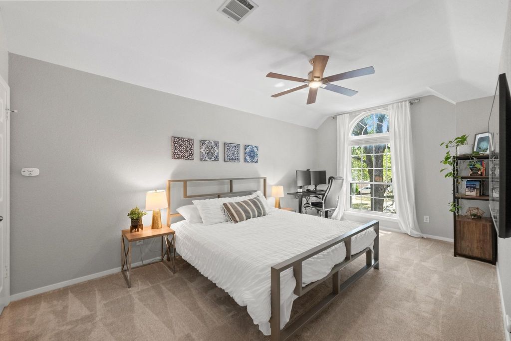 Aggressively priced. Beautifully updated two story traditional floor plan. Open Kitchen-Dining-Den with brick fireplace and charming window seat looking out to huge deck and fenced yard. Greenbelt behind fence. Kitchen was gutted and updated 5.5 years ago with all new cabinets, counter tops, appliances and lighting. 3 spacious bedrooms upstairs plus large office or fourth bedroom if needed with the addition of a closet. Primary bedroom has romantic fireplace, sitting and exercise area. Primary bathroom has custom double vanity, walk-in shower, marble mosaic floor and custom closet built-ins. New windows and memory foam padded high-density carpeting throughout with life time warranty, less than one year old. 2nd upstairs spacious bedroom with walk-in closet can serve as second primary. 2nd upstairs bathroom has new vanity, flooring, faucets and lighting. Great backyard and cute shed for storage or work bench area. Deck runs the length of the house. Front yard xeriscaped for low maintenance. 2 car garage with built-in tool storage. Generator hook-up. Walking distance to daycares and top rated Mills Elementary School. Great South location off Escarpment, 5 minutes to HEB. Don't miss this one, it will go fast.