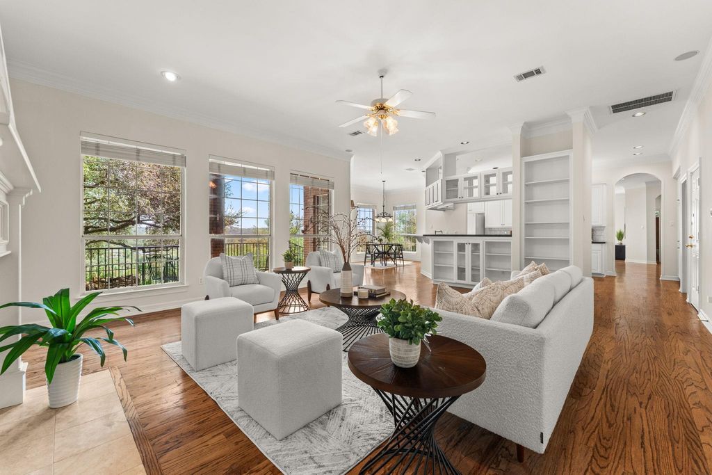 An Exclusive Haven with Iconic Austin Views ONLY $484/sf in Eanes ISD with amazing views! So close to all the action of Austin Texas yet feels like you are on your own oasis. Enjoy the sweeping views of The Barton Creek Greenbelt from Loop 360 to Zilker Park and a full view of Downtown from your backyard where you can sit and watch your private fireworks show! Homes on this gated and private street rarely come on the market. This home has a massive amount of natural light and is well maintained and on a beautiful setting and ready to move-in or put your own thumbprint. A bedroom and full bath downstairs is a perfect in-law or guest room and just off one of the three livings spaces. A nice kitchen opens to the very large den with a fireplace and built-ins ready to hold your memories. The breakfast table will be a favorite spot to sit as you look out on the greenbelt and amazing vegetation. Upstairs you will find a huge primary suite and a home office made of glass walls to bring the outside in. In addition, there are two secondary bedrooms upstairs with a Jack-n-Jill bath. Another living space at the other end of the second floor with enough room for a TV spot and a playroom. And, off of this living space, there is a private balcony to watch the sun come up over the bluff or enjoy your morning coffee in your yard to watch downtown wake up! The beautiful landscaping, outdoor lighting and water features are wonderful, and the owners have won 'Yard of the Month' many times! Side-entry oversized 2-car garage. To allow for additional outdoor living space, the owners had the utility easement along the property line vacated to give an additional 7.5 feet of fenced area in the back. (see notes under "rooms" regarding kitchen range/venting) An appraiser measured to get a more accurate Square Footage - It's simply a must-see!