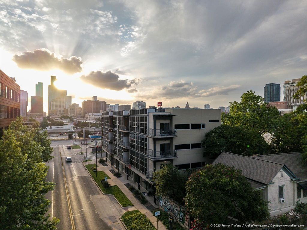 UNIT 106 is a 3-story townhouse style home with dual entrances. Floor-to-ceiling window wall frames striking downtown view from its living area and second level bedroom. Watch the sun sets behind the skyline from the spacious private rooftop deck. Two bedroom suites. 3 dedicated parking spots!!! An attached private 2-car garage (646 SF) w/ split ac unit + dedicated alley parking space. Sixth & Brushy is an architectural presence at the gateway to the vibrant East Sixth Street corridor. Designed by The Lawrence Group, it is one of the original mixed-use developments in East Austin. Characterized by its glass+aluminum curtain wall, the building is comprised of 16 loft-style+ 2 town-house residences, and 6 ground-level creative office/retail spaces. Located in one of the most walkable neighborhoods in Austin, Sixth & Brushy is one block to I-35 & Plaza Saltillo (Whole Foods & Target). Some of our nearby faves include: Brew & Brew, Hopdoddy, Fukumoto, Buenos Aires Cafe, Ramen Tatsuya, Domo Alley Gato, NADC Burger, Pasta|Bar, Il Brutto, Cosmic Saltillo, Suerte, Uptown Sports Club. [Walkability Score: 95/100]