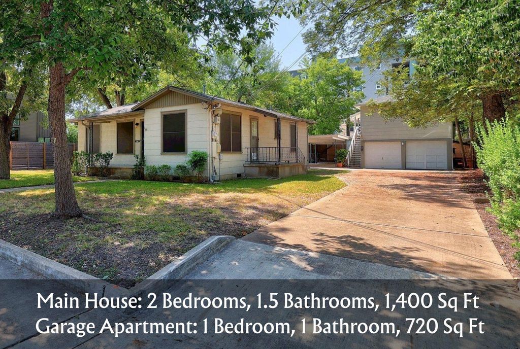 Reduced! 0.232 acre lot ~ Main house is a 2 bed, 2 living, 1.5 bath - 1400 sf. Upstairs garage apartment is 1 bed, 1 bath, 1 living 720 sf.Ideal property for owner occupied investor, investor or someone interested in redeveloping this property in desirable Violet Crown Heights section of the Crestview neighborhood.We only have photos of the main house at this time. This central Austin location puts you close to Brentwood Park, neighborhood restaurants, coffee shops, and commuter routes. Zoned to Brentwood Elementary, Lamar Middle, and McCallum High School. Main House:Discover this charming Brentwood/Violet Crown home offering 3 bedrooms, 1.5 baths, and approximately 1,400 sq ft of comfortable living space. The flexible layout features two living areas, one of which can easily serve as a third bedroom, home office, or playroom. The kitchen includes granite countertops, white appliances, and generous cabinet space, while hardwood floors add warmth and character throughout. Step outside to enjoy a screened back porch perfect for morning coffee or evening relaxation, along with spacious front and back yards for outdoor living. A detached 2-car garage with additional storage provides extra convenience. Garage Apartment: The spacious upstairs 720 sf garage apartment includes a very large bedroom, living room, and cozy kitchen.
