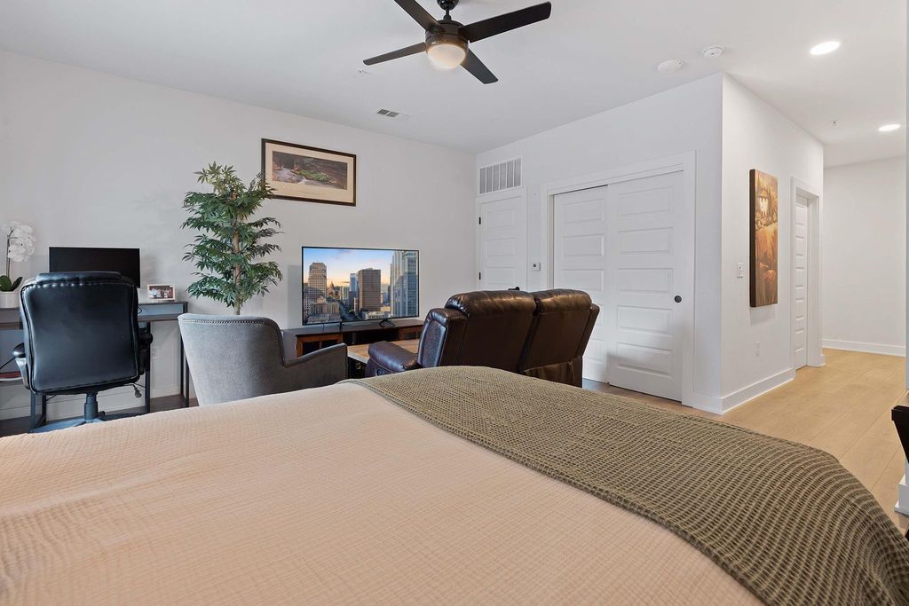 Take advantage of this super-easy lifestyle! This studio condo has convenient access to the shared common center courtyard. A first-floor condo, you will be drawn to the incredible contemporary, clean finishes. Beautiful hardwood floors flow throughout the main living spaces with high ceilings, and recessed lighting - all creating an open, light, &bright ambience. The chic kitchen is appointed with all that you will need - stainless-steel appliances, microwave, stark white quartz counters, subway tile backsplash, & oversized bright, flush cabinet storage. The living room is the heart of the home featuring ample space to place all your furnishings - & access to a private, gated patio! You will have plenty of space for the living area, an office, and bedtime areas. Just outside through the modern wrought iron gate, you will find private access to the communal courtyard fully of cozy outdoor furniture - an extraordinary place to meet neighbors or use with your guests. You will love the phenomenal downtown views from the communal rooftop space -outdoor lounging & TV area. One reserved garage space is included & key card access to the building giving you added security. In the heart of Downtown & walking distance to East 6th street! Get ready to take in all that Austin has to offer while residing in the prime location & walking distance to everything you need - coffee shops, dining, spas, shopping, & more. The HOA includes common area maintenance, trash/recycling, cable, & internet for the amenity area.