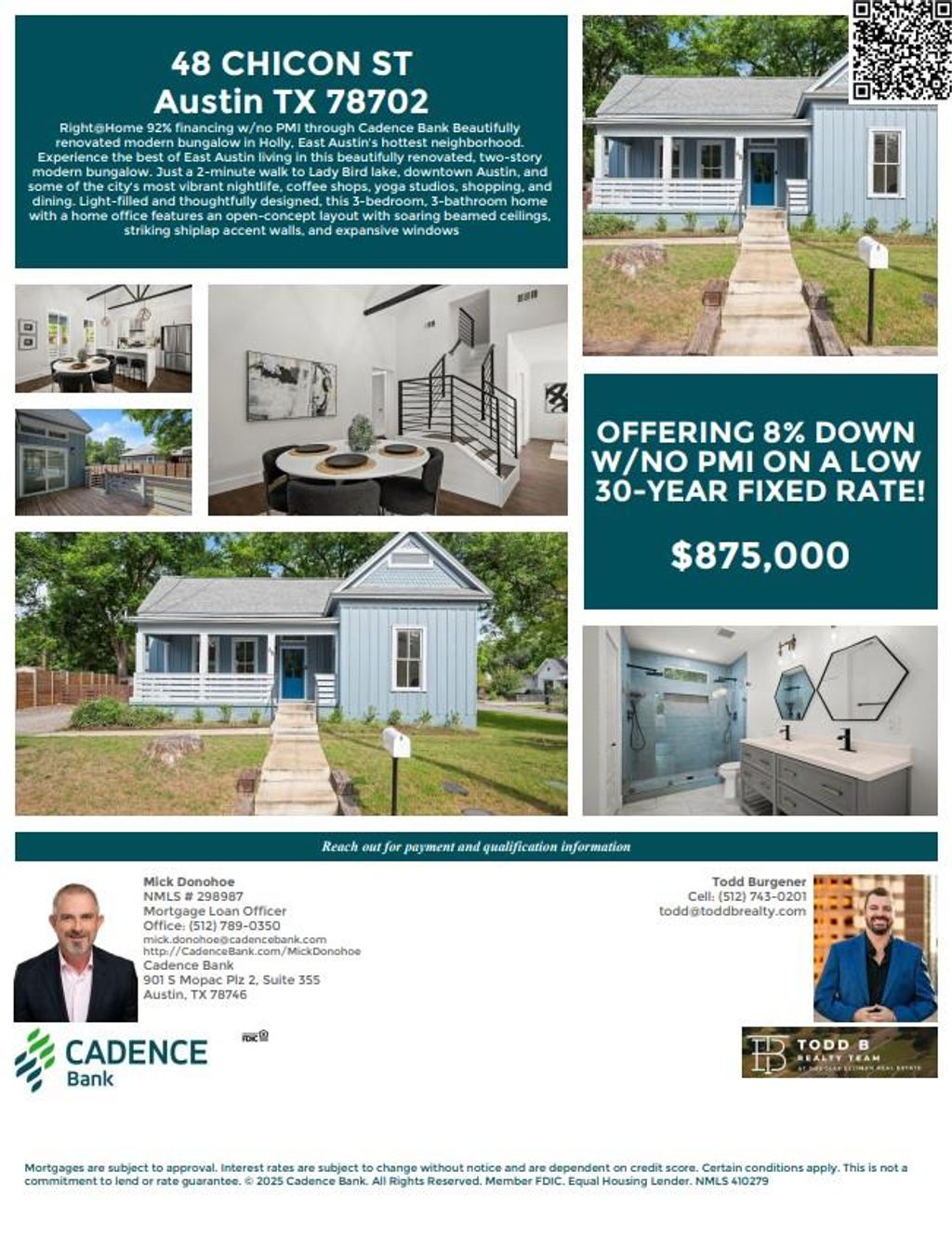 SELLER OPEN TO BUYING RATE DOWN INTO THE 5% RANGE - Beautifully renovated modern bungalow in Holly, East Austin's hottest neighborhood. Experience the best of East Austin living in this beautifully renovated, two-story modern bungalow. Just a 2-minute walk to Lady Bird lake, downtown Austin, and some of the city's most vibrant nightlife, coffee shops, yoga studios, shopping, and dining. Light-filled and thoughtfully designed, this 3-bedroom, 3-bathroom home with a home office features an open-concept layout with soaring beamed ceilings, striking shiplap accent walls, and expansive windows that flood the space with natural light. Downstairs you will find an open floor plan concept connecting the kitchen, living room and dining room. The stylish kitchen is a chef's dream with a large center island perfect for gathering with quartz countertops, ample cabinetry, storage and stainless steel appliances. Tons of unique touches throughout the home include a cozy pet nook under the stairs, a dry bar/office niche, and a spacious upstairs flex/loft area perfect for a media room, playroom, gameroom or home gym. Retreat to the main-level primary suite complete with a luxurious walk-in shower featuring dual shower heads, double vanities, and a generous walk-in closet. This home is ideal for entertaining with a fabulous front porch patio as well as a private, fenced back yard shaded by mature trees giving the backyard a great cozy vibe. This home is a gem on all levels!